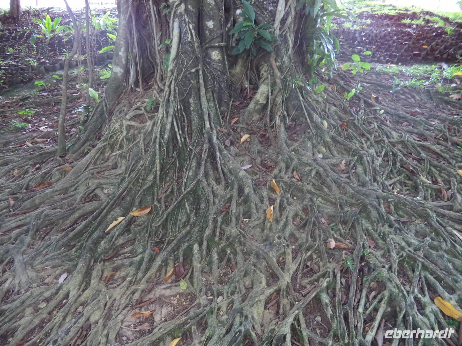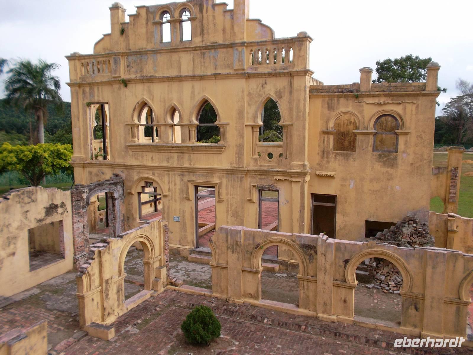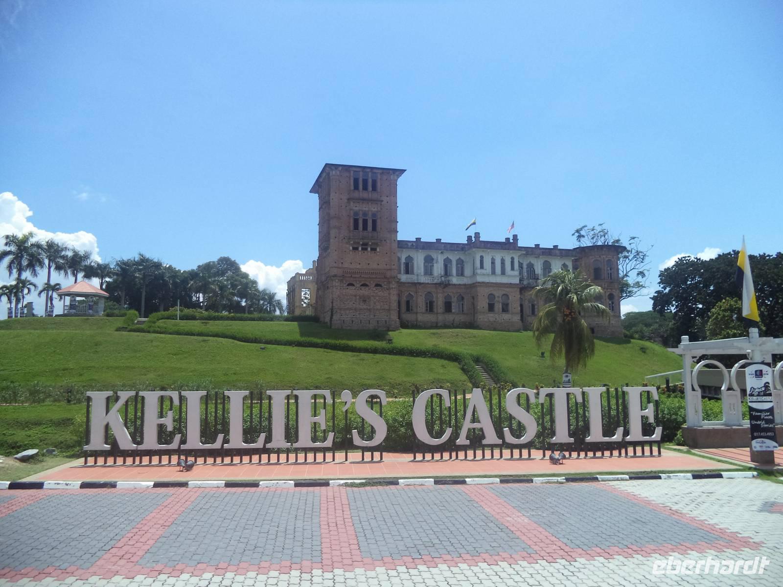 Später widmeten wir uns dann einer der „klassischen Sehenswürdigkeiten", die in keinem Malaysia-Reiseführer fehlt: Kellie's Castle nördlich von KL. Der schottische Plantagenbesitzer William Kellie-Smith wollte Anfang des 20. Jahrhunderts nahe dem Dörfchen Batu Gajah, wo er eine Plantage mit überwiegend indischen Arbeitern besaß, seiner Frau und sich selbst einen Traum erfüllen und ein Schloss in der Wildnis bauen. In knapp zwölf Jahren Arbeit, von 1915 bis 1926, errichteten die indischen Helfer einen schlossähnlichen Bau mit wuchtigem Turm. Doch dann kehrte Kellie-Smith nicht mehr nach Malaysia zurück und es wurde nicht mehr weiter an dem Bau gearbeitet. So wurde das Werk niemals vollendet wurde und blieb so wie am Tag der Nachricht vom Tod des Hausherrn. In der Nähe hatten die Inder einen Hindutempel errichtet, in dem man zu Ehren Kellies seine Statue aufstellte und so ist dies der einzige Hindutempel in Asien, der neben Göttern, Dämonen und Symbolen auch die Figur eines Europäers enthält.