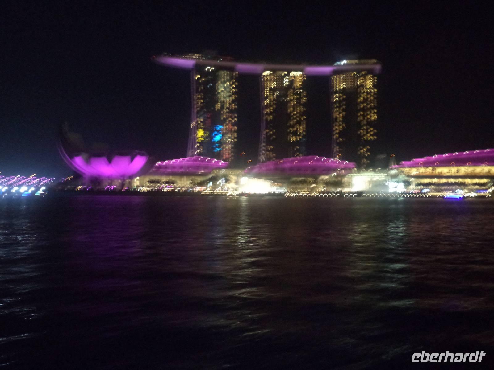 Durch die sechsstündige Zeitverschiebung gegenüber Deutschland „schluckte" der Flug die Nacht und noch den größten Teil des nächsten Tages und erst gegen 16.00 Ortszeit erreichten wie Singapur. Südostasiens einziger Stadtstaat empfing uns außerordentlich warm, fast schwül - aber das merkten wir erst, nachdem wir gemeinsam die Einreisekarten -nur in englisch oder chinesisch möglich - ausgefüllt, die Grenzkontrollen passiert und unser Gepäck geholt hatten. Geduldig wartete Ishak auf uns, der einheimische Reiseleiter, der uns dann begrüßte und nach dem Gang zum „money Changer", dem Geldwechsler, zum Bus begleitete. Auf dem Weg zum Hotel erzählte er schon einiges über seine Heimatstadt. Gleich zu Anfang konnten wir schon einen Höhepunkt organisieren: Um noch vor der morgigen Stadtrundfahrt etwas von Singapur kennenzulernen und die unglaubliche Metropole von ihrer „Nachtseite" zu erleben, trafen wir uns nach kurzem Frischmachen im Hotel zu einem Spaziergang zum Singapur-Flusshafen und machten eine Bootsfahrt. Sehr idyllisch war das Dahingleiten auf dem Fluss, vorbei an einigen der erleuchteten Highlights im Zentrum von Singapur. Es ist ein ganz anderes Gefühl, Orte vom Wasser aus zu erleben und die Dinge zu entdecken: den alten Stadthafen mit Singapurs Wahrzeichen Merlion, das koloniale Altstadtviertel, die Chinesenstadt und die riesigen neuen Bank- und Hotelgebäude. Wolkenkratzer und vor allem das neue Luxushotel „Marina Sands" mit seinem unverwechselbaren dreitürmigen Aufbau säumten den Hafen. Was mit zunehmender Dunkelheit und aufflammender Beleuchtung immer bunter und faszinierender wurde, endete mit einer spektakulären Musik-, Wasser- und Feuershow mitten im Hafen, die wir vom Boot aus genießen konnten. Zurückgekehrt ins Hotel bildete ein asiatisches Buffett zum Abendessen den Tagesabschluß, bevor wir in unseren modern dekorierten Zimmern darangingen, zu ruhen und den „Jetlag" zu überwinden.