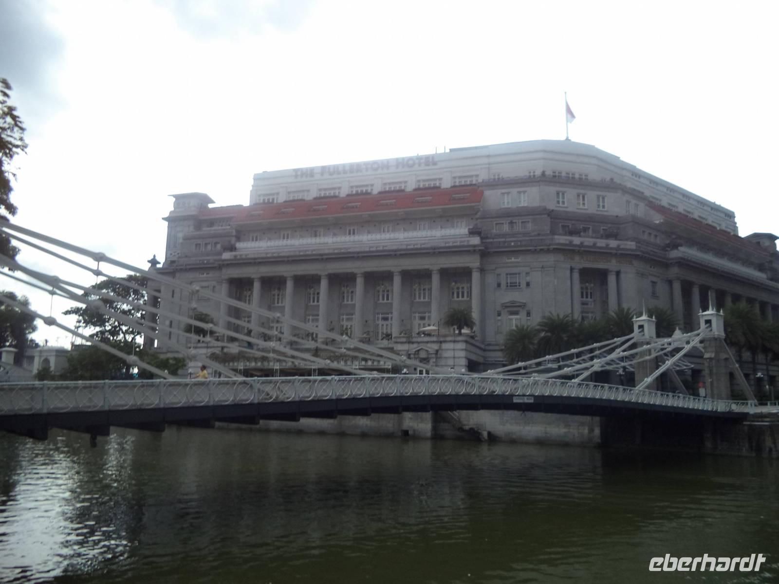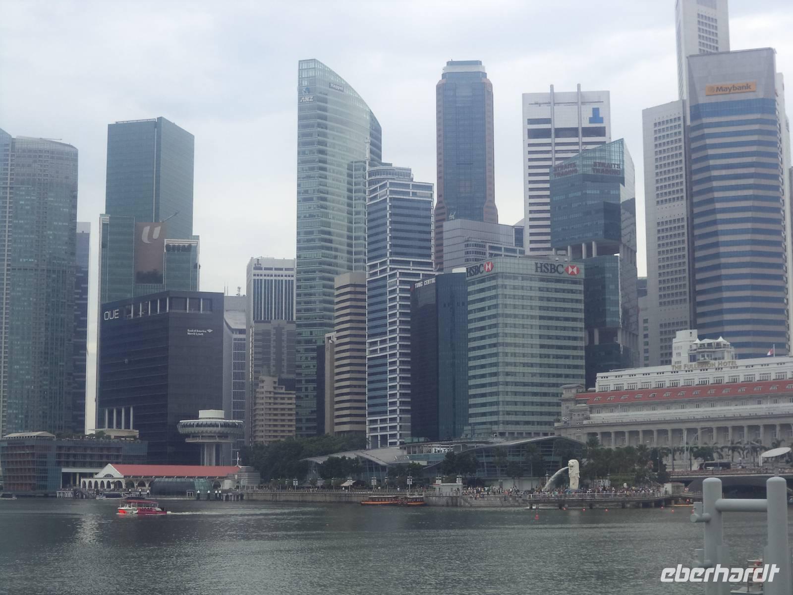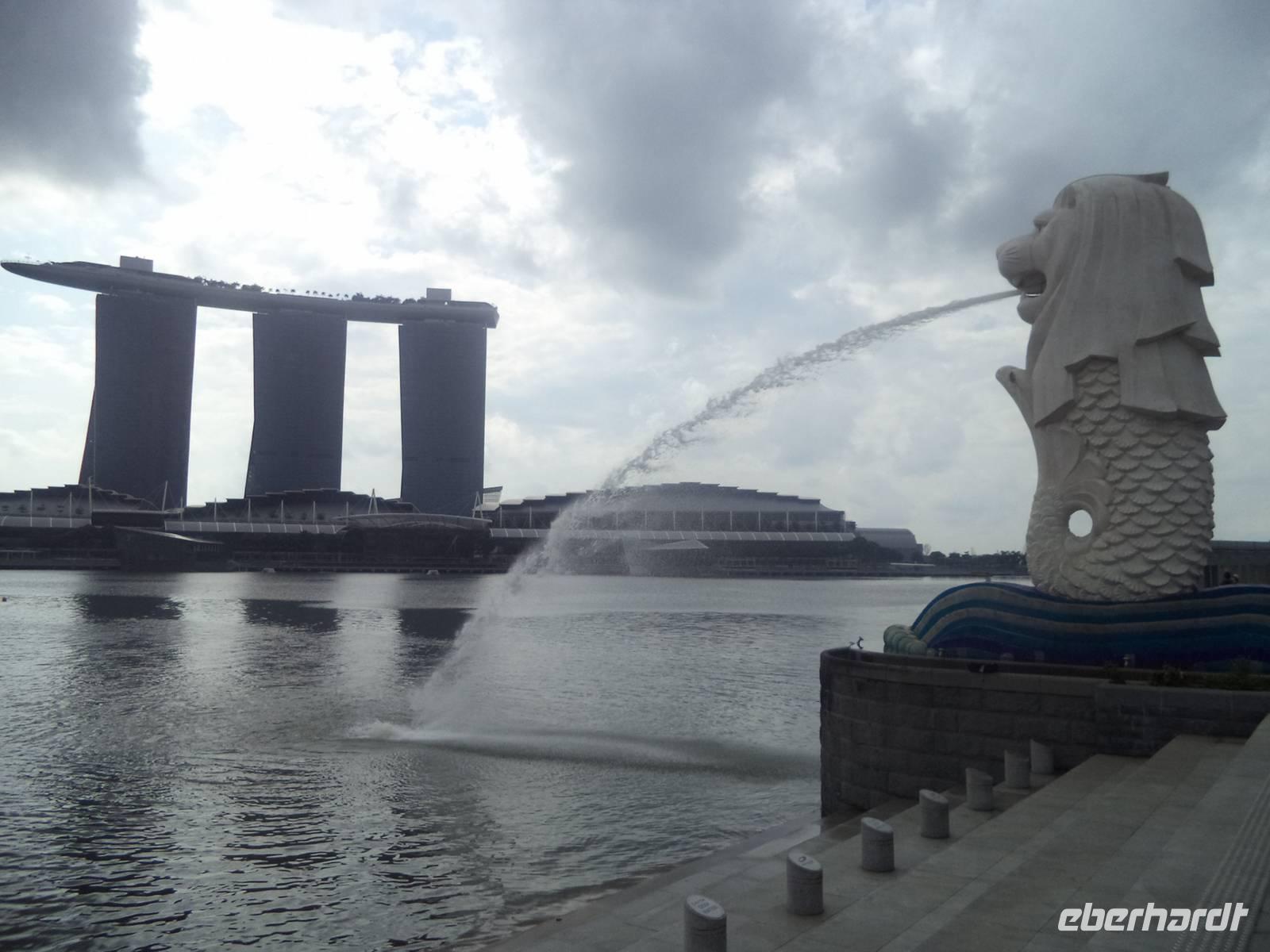 Nach dem Frühstück holte uns Reiseleiter Ishak zur Stadtrundfahrt durch das Zentrum von Singapur ab. Natürlich begannen wir da, wo alles begonnen hatte: im alten kolonialen Stadtzentrum, rings um die Statue des Stadtgründers Sir Thomas Stamford Raffles. Die steht eindrucksvoll neben dem Alten Postamt und ringsum die ehemaligen Verwaltungsgebäude. Singapur war eins britische Kolonie und als bedeutendes Handelszentrum die wichtigste der „strait settlements" - drei Handelsniederlassungen (Singapur, Malakka und Penang) an der „Straße von Malakka", die seither bis heute zu den meistbefahrenen Schifffahrtsrouten der Welt zählt. Was im Vorjahr an historischen Gebäuden noch komplett eingerüstet war zur Renovierung in Vorbereitung auf die Feierlichkeiten zum 200. Gründungsjubiläum 2014, erstrahlt bis auf zwei Bauten im weißgelb-getünchten neuen Glanz. Ein kurzer Weg am Fluss entlang mit zwei historischen Brücken - und schon war der „Merlion" erreicht. Das Wahrzeichen Singapurs stellt ein Fabelwesen dar - halb Löwe, halb Fisch - und geht auf die Gründungslegende der Stadt zurück.