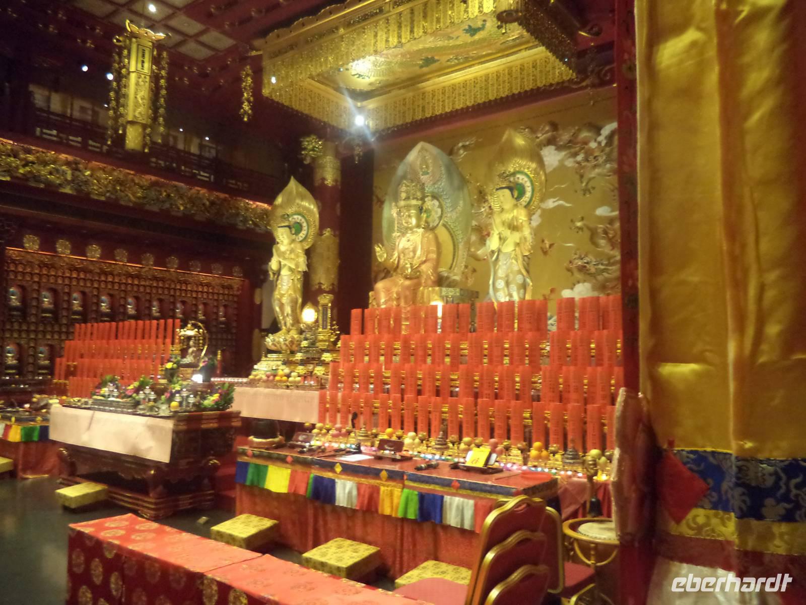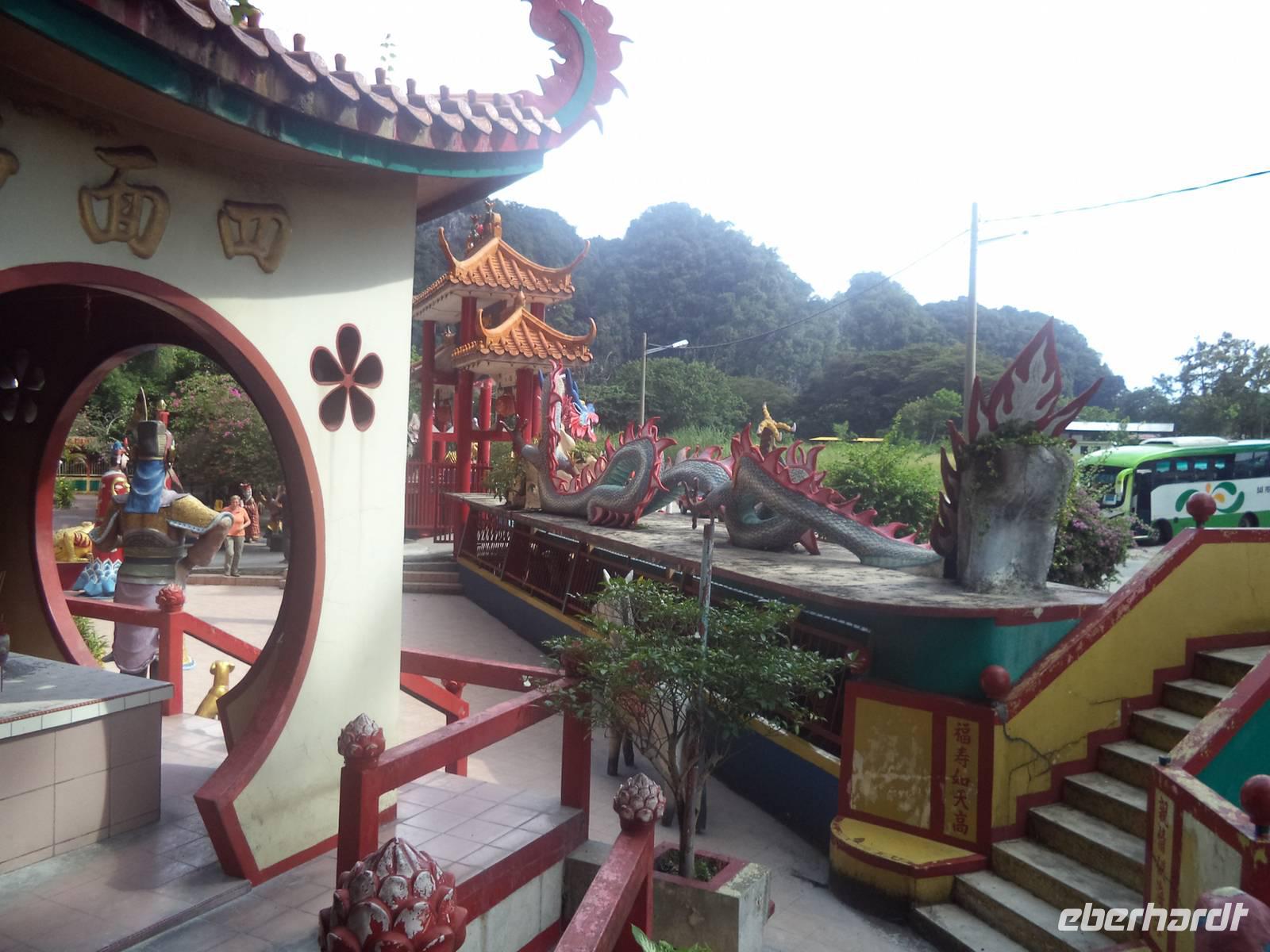 Kurz vor der Einfahrt in die alte Zinn-Industriestadt Ipoh, die heute nördliches Verwaltungszentrum und viertgrößte Stadt Malaysias ist, widmeten wir unsere Aufmerksamkeit einigen höchst interessanten chinesischen Tempeln. Mehrere bunt und prunkvoll mit Vorhöfen voller bemalter Betonstatuen ausgestattete „Tongs" = Höhlentempel sind in die Karstspalten des Kalksteingebirges in der Nähe des Stadtkerns von Ipoh hineingebaut. Oft sind die wichtigsten von ihnen, Sam-Poh-Tong und Kek-Lok-Tong geschlossen, aber wir fanden dann doch den Weg durch die kunstvoll gestalteten Vorgärten und Vorräume bis hinein in die Hauptheiligtümer - gewaltige, teils mit Schreinen und Götterfiguren ausgestattete und teils bemalte felsige Hohlräume. Guan Yin, die Göttin der Barmherzigkeit, ist hier oft die vorherrschende Figur neben zahllosen Altären und Opferstellen, die beeindruckende Ruhe ausstrahlen.