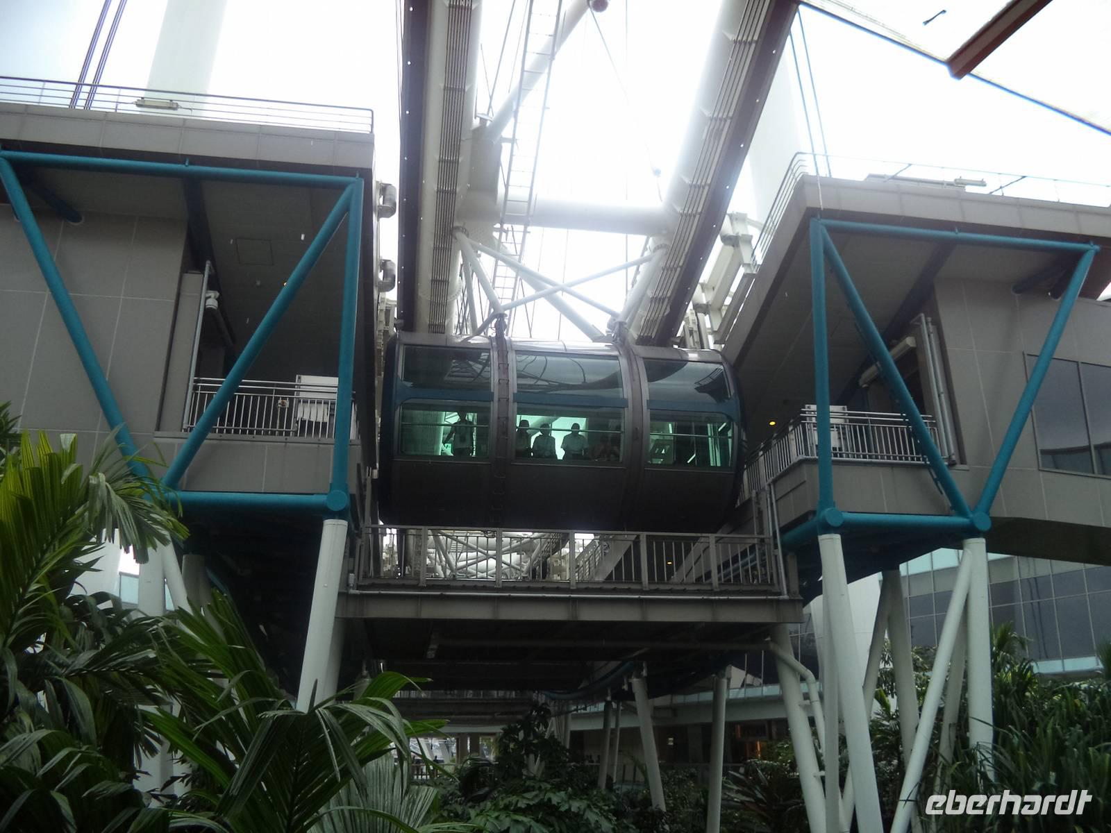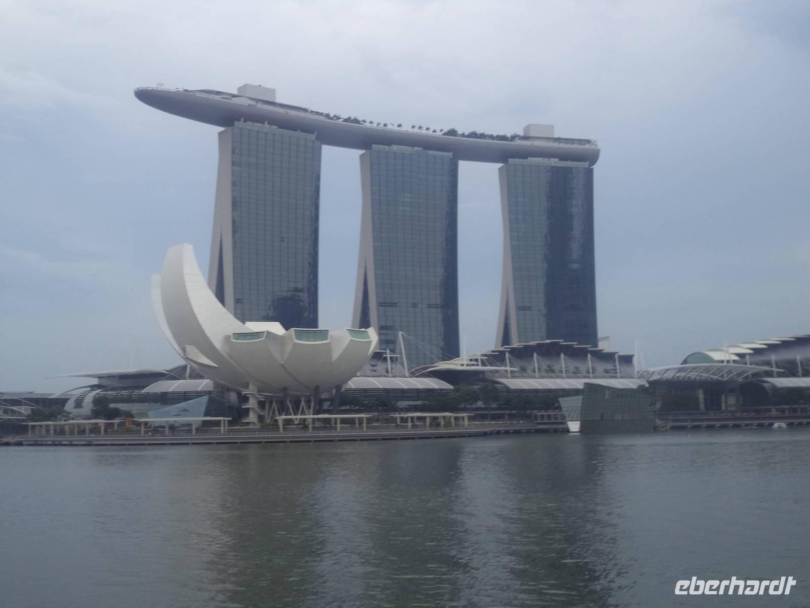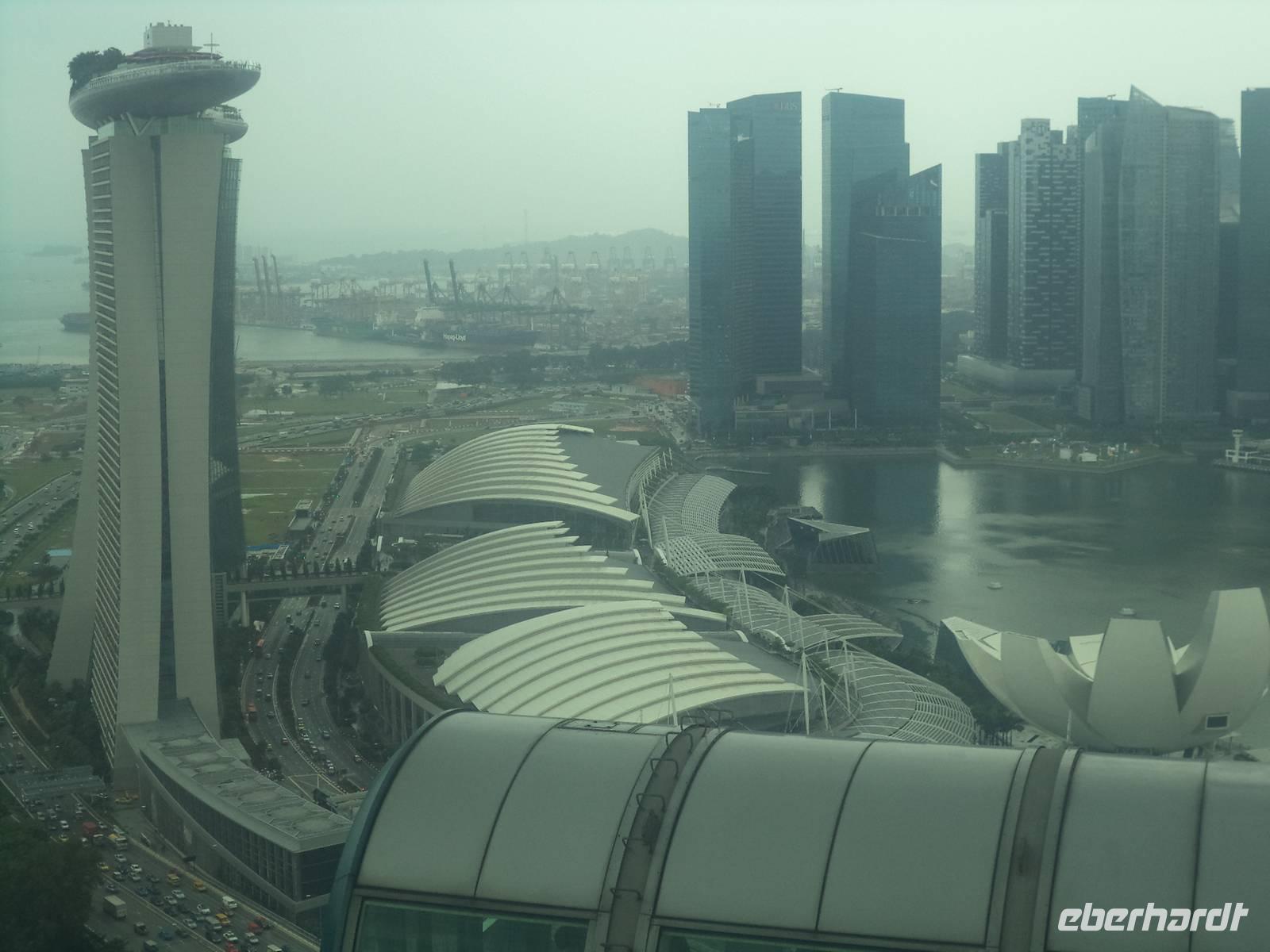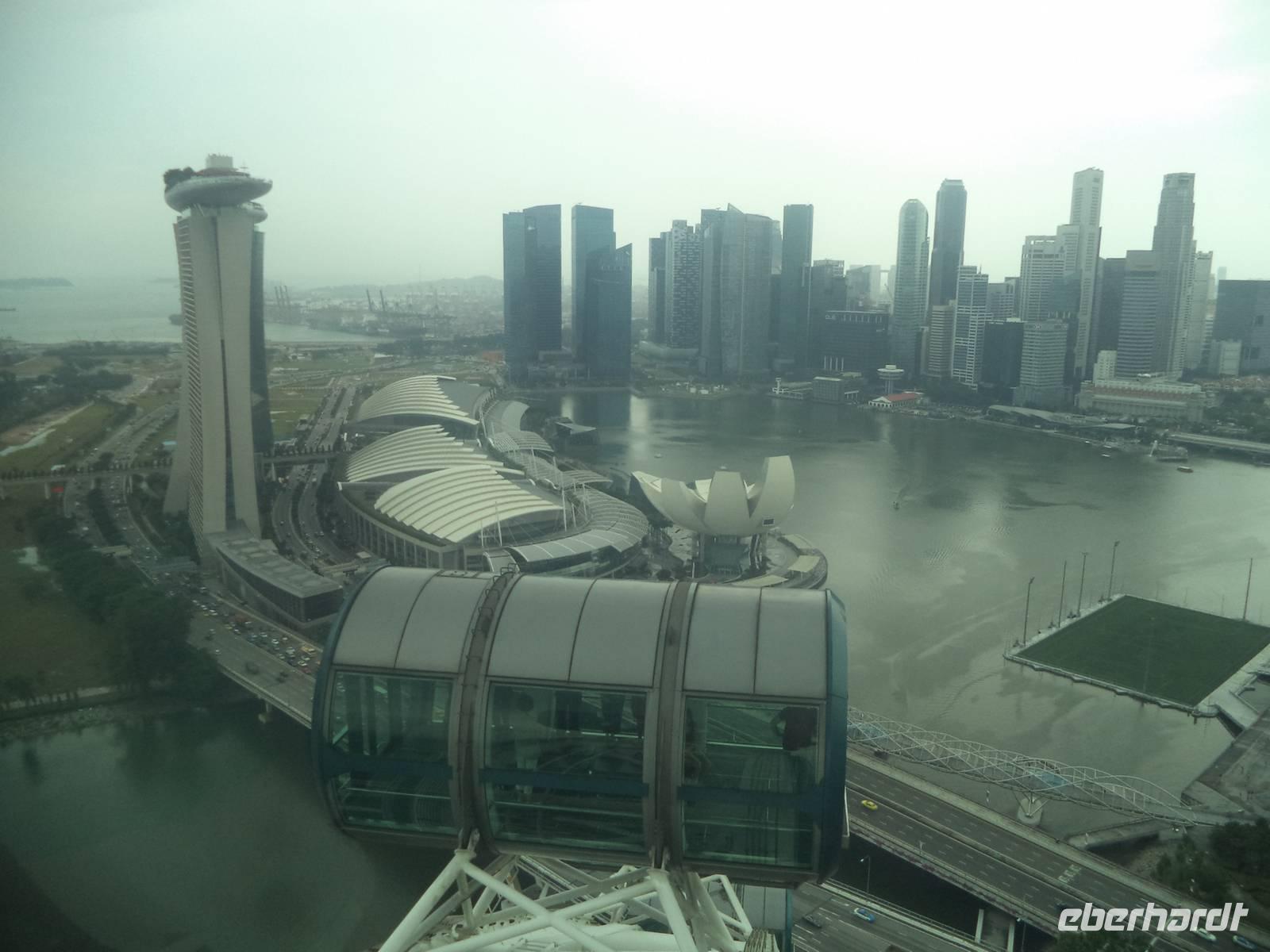 Als Abschluss der Stadtrundfahrt erwartete uns noch ein - wie könnte es in Singapur anders sein - Erlebnis der Superlative. Als Idee zum „richtigen Reisen" organisierte Stadtführer Ishak Karten für eine Fahrt mit dem Singapore-Flyer, dem höchsten Riesenrad der Welt. Aus 165 m Höhe sahen wir nicht nur auf die berühmte Formel-1-Rennstrecke sondern betrachteten Singapurs Wolkenkrater „auf Augenhöhe