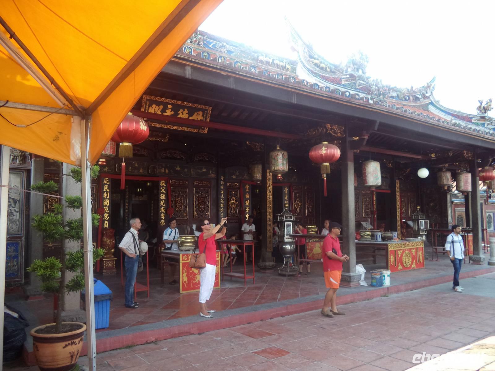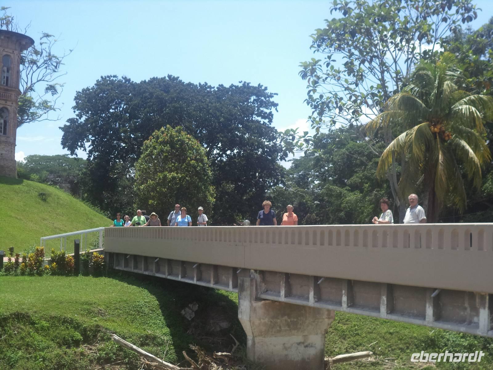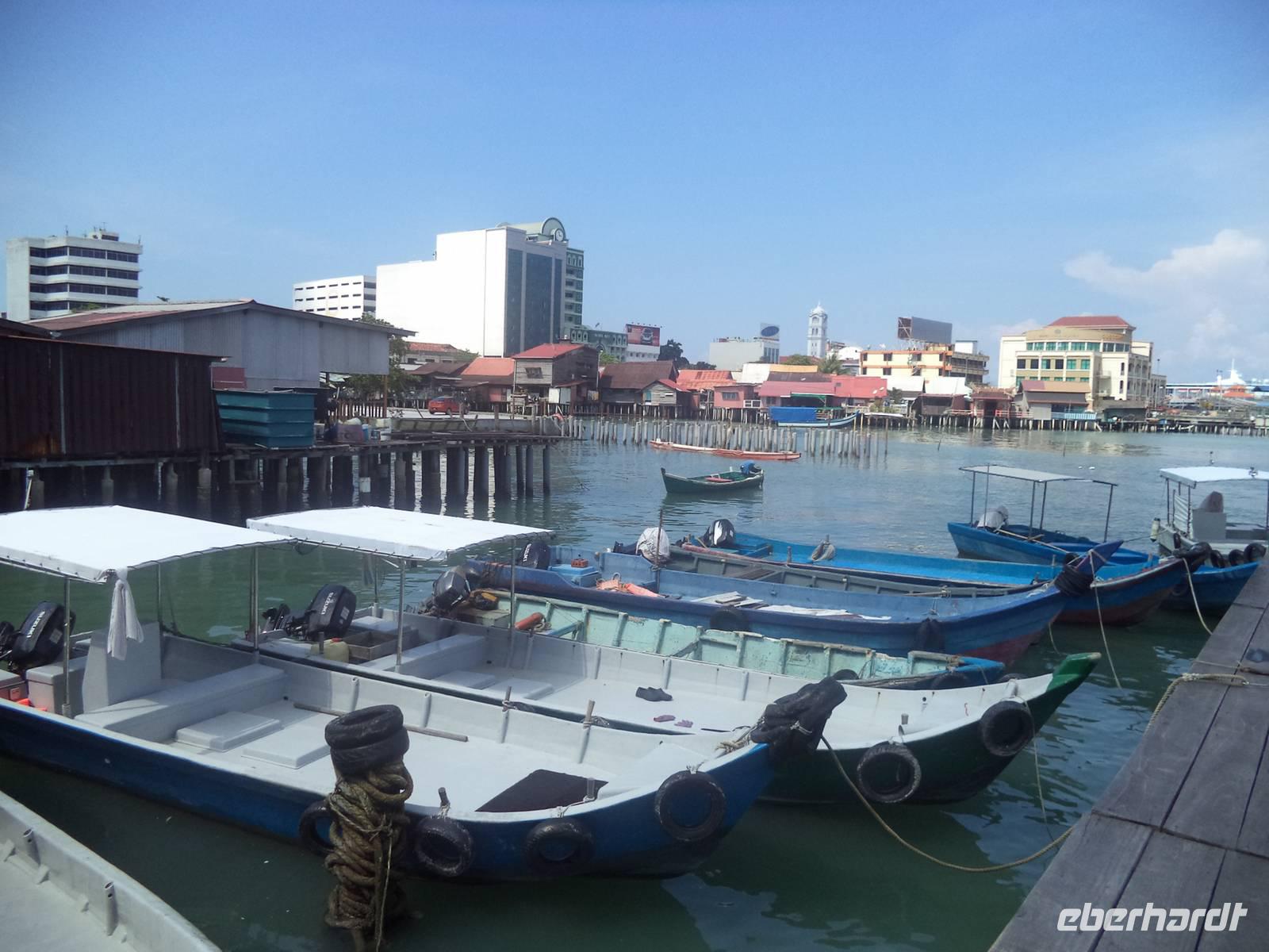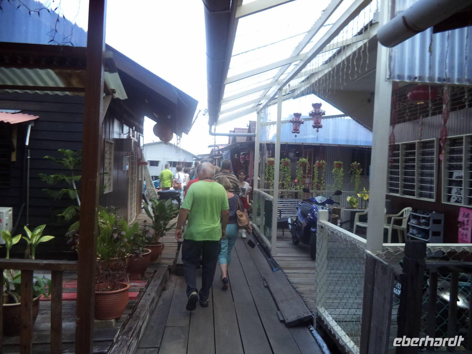 Später fuhren wir über die kilometerlange Autobrücke auf die Ferieninsel Penang, einst eine der drei bedeutenden „Strait Settlements" der britischen Kolonialzeit. Zunächst checkten wir hier ein ins Bayview Hotel, eines der größten in der Inselhauptstadt Georgetown, die wiederum zu den bedeutendsten touristischen Zentren Malaysias zählt. Am Nachmittag erwarteten uns Fahrrad-Rikschahs zu einer Rundfahrt, bei der wir die Stadt als ungewöhnliche Mischung kolonialer Vergangenheit, chinesischer und indischer Tradition sowie malaiischer Gegenwart erleben konnten. Mehrere Stopps zeigten uns die Brennpunkte der Geschichte sowie die touristischen Highlights der Stadt und der Insel: da war zunächst das flache alte holländische Artilleriefort Cornwallis, dessen Kanonen sich bis heute über die angeschrägten Mauern durch die Schießscharten der sternförmigen Kastell-Anlage recken und einst den Hafen beherrschten. Vom Fort führte uns der Weg zur „Chew Jetty", einer traditionellen Anlegestelle der chinesischen Fischer und Schiffsleichter in Form einer bebauten Landungsbrücke. Jeder bedeutende chinesische Familienclan hatte einst solch ein „Logistikzentrum", wie man es heute nennen würde, angelegt, um hier mit dem Aufstreben des Hafens mitzugehen und Arbeitsplätze als Transportarbeiter für die Familienangehörigen zu schaffen. Die Anleger für Entlade-Boote und Küstentransporter, von Häusern auf Pfählen umstanden und als Knüppeldämme und Bretterstraßen immer weiter auf See hinaus verlängert, sind bis heute als überaus malerisches Gewirr an Stegen und kleinen Landestellen erhalten. Immer noch prägen Boote, Transportarbeiter und dazwischen spielende Kinder und mit Essensbereitung oder Flickarbeiten beschäftigte Frauen das Bild zwischen den weiterhin bewohnten Häusern, die inzwischen als Gesamtanlage zum UNESCO-Erbe gehören.