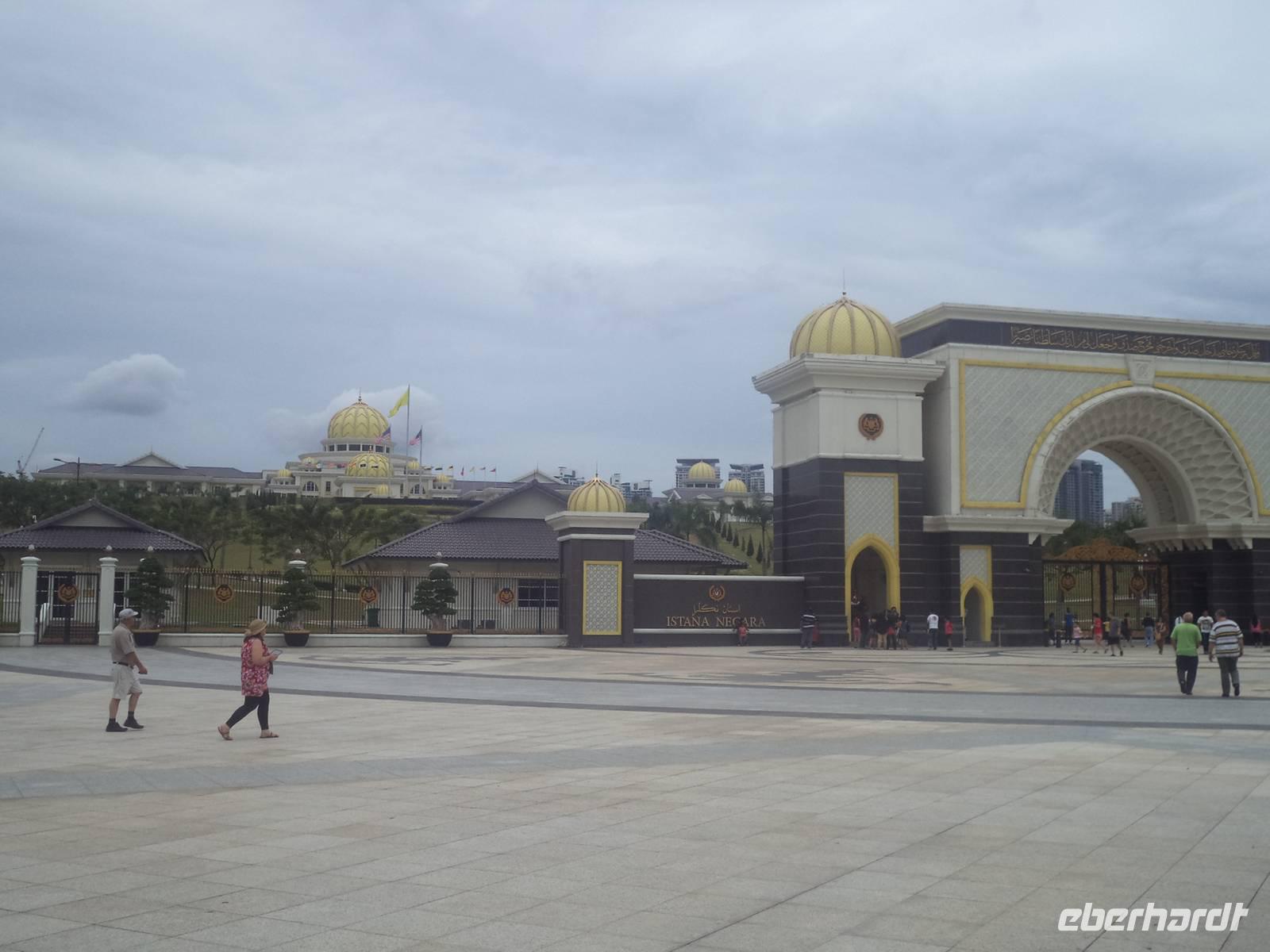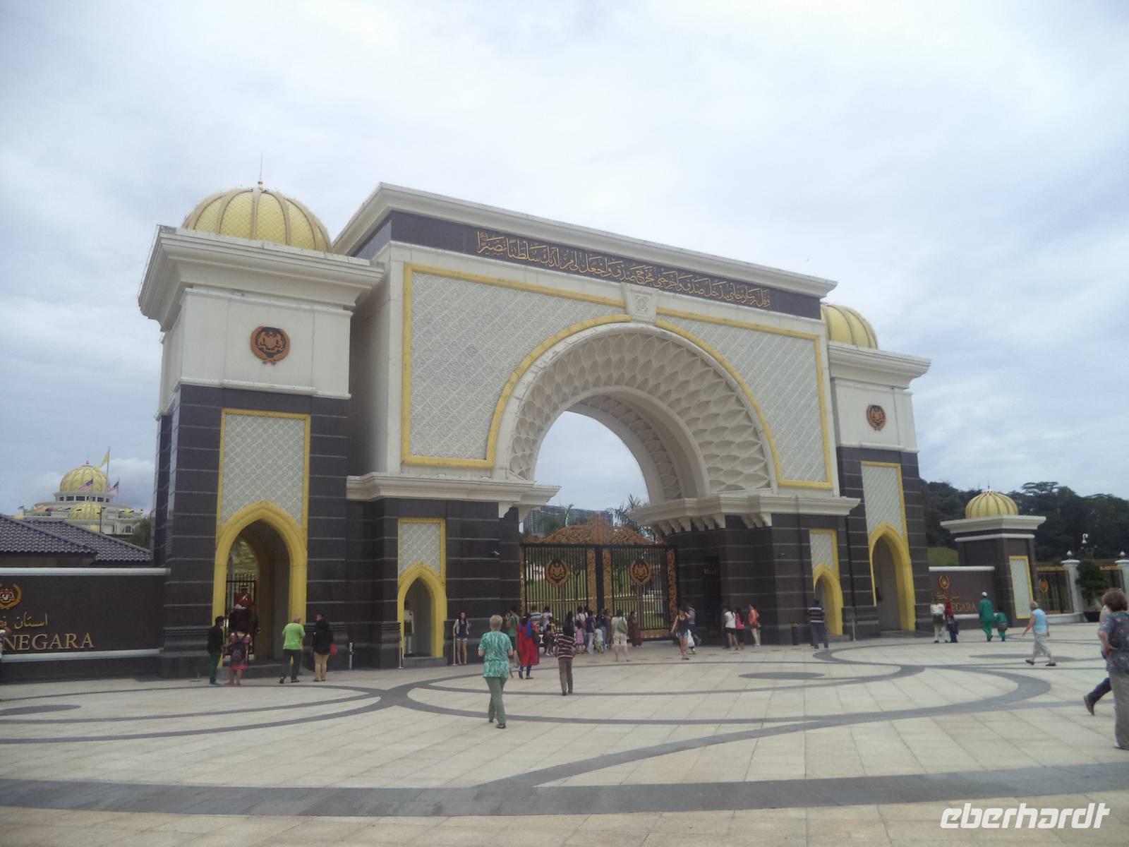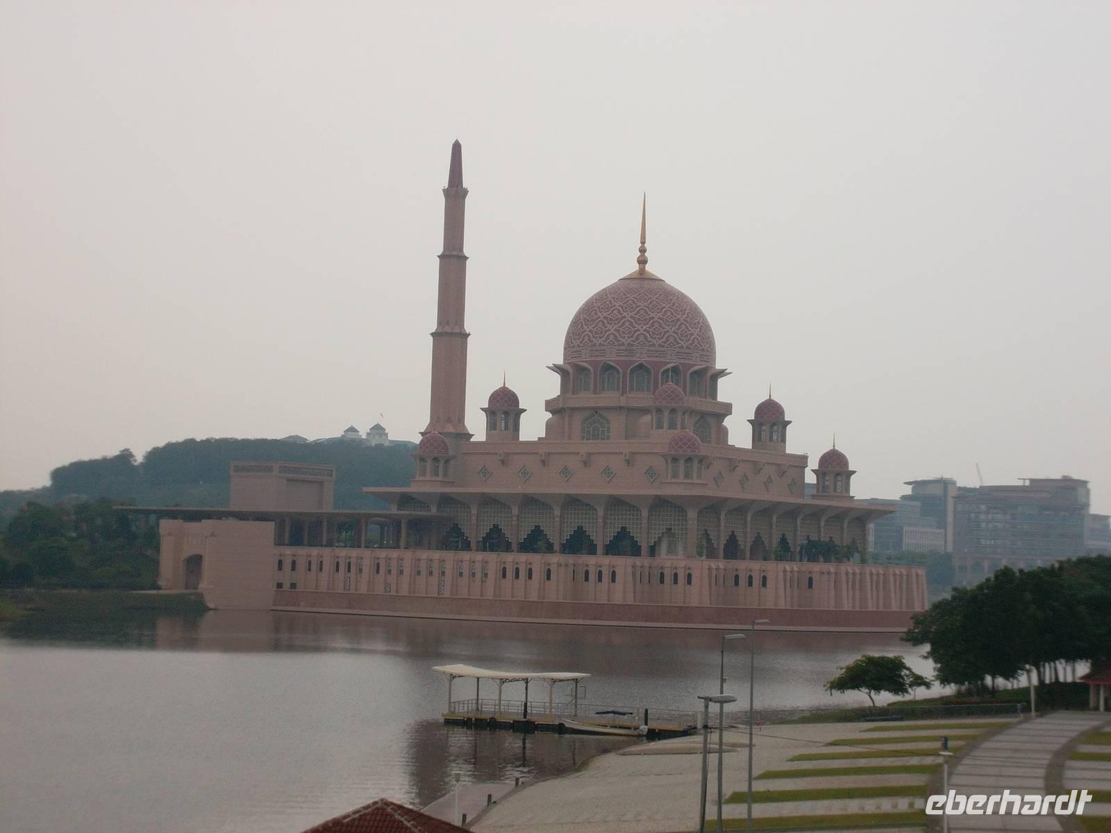 Heute erreichten wir zunächst die „Gartenstadt" Putrajaya. Die geballte Wirtschaftskraft des mitunter als „Tigerstaat" bezeichneten aufstrebenden Staates Malaysias dokumentiert sich hier als gigantisches und interessantes Projekt: erst 1995 gegründet, wird die Stadt planmäßig angelegt als neuer Regierungssitz unweit der überquellenden Hauptstadt Kuala Lumpur. Die Verkehrsanbindung, obwohl noch nicht perfekt, scheint recht gut zu funktionieren und mehr als hunderttausend Einwohner sind bereits in die moderne Stadt, bei deren Anlage neben gigantischen Hochhäusern trotz der Riesenhaftigkeit immer wieder traditionelle Bauformen zugrunde liegen, umgezogen. Ihre Stadtlandschaft wird bestimmt durch künstlich angelegte Seen und ausgedehnte Grünflächen, dominiert von Prestige- Regierungs- und Wirtschaftsgebnäuden - meist Paradebeispiele zwar moderner, aber immer noch islamisch-malaysischen Architektur. Schon beherbergt das neue Verwaltungszentrum der Föderation von Malaysia viele Ministerien, den neuen Amtssitz des Königs (der „Istana Melawati" genannt wird) und zahlreiche Amts-, Verwaltungs- und Bankgebäude. Beherrschend aber sind das neue, gewaltige Konferenzzentrum, errichtet auf einem Hügel mit gutem Blick über Putrajaya und der Komplex des Premierministers: der „Perdana Putra" mit den Arbeitsräumen des Staatschefs und der „Seri Perdana", seine Residenz. Ein bedeutsames, elegant-erhabenes Gebäude, malerisch an einem See gelegen, ist Malaysias neue Zentral- Moschee. Putra Mosque hat Platz für etwa 15.000 Gläubige und zeigt mit ihrem 116 Meter hohem Minarett das zweithöchste Sakralbauwerk Südostasiens. Ín nur zwei Jahren ab 1997 wurde die Moschee errichte, die im Untergeschoss ihrer Seeterrasse einen großen Promenaden - und Erholungskomplex mit Snack-Restaurants und alkoholfreien Kaffee- und Erfrischungsbars beherbergt.