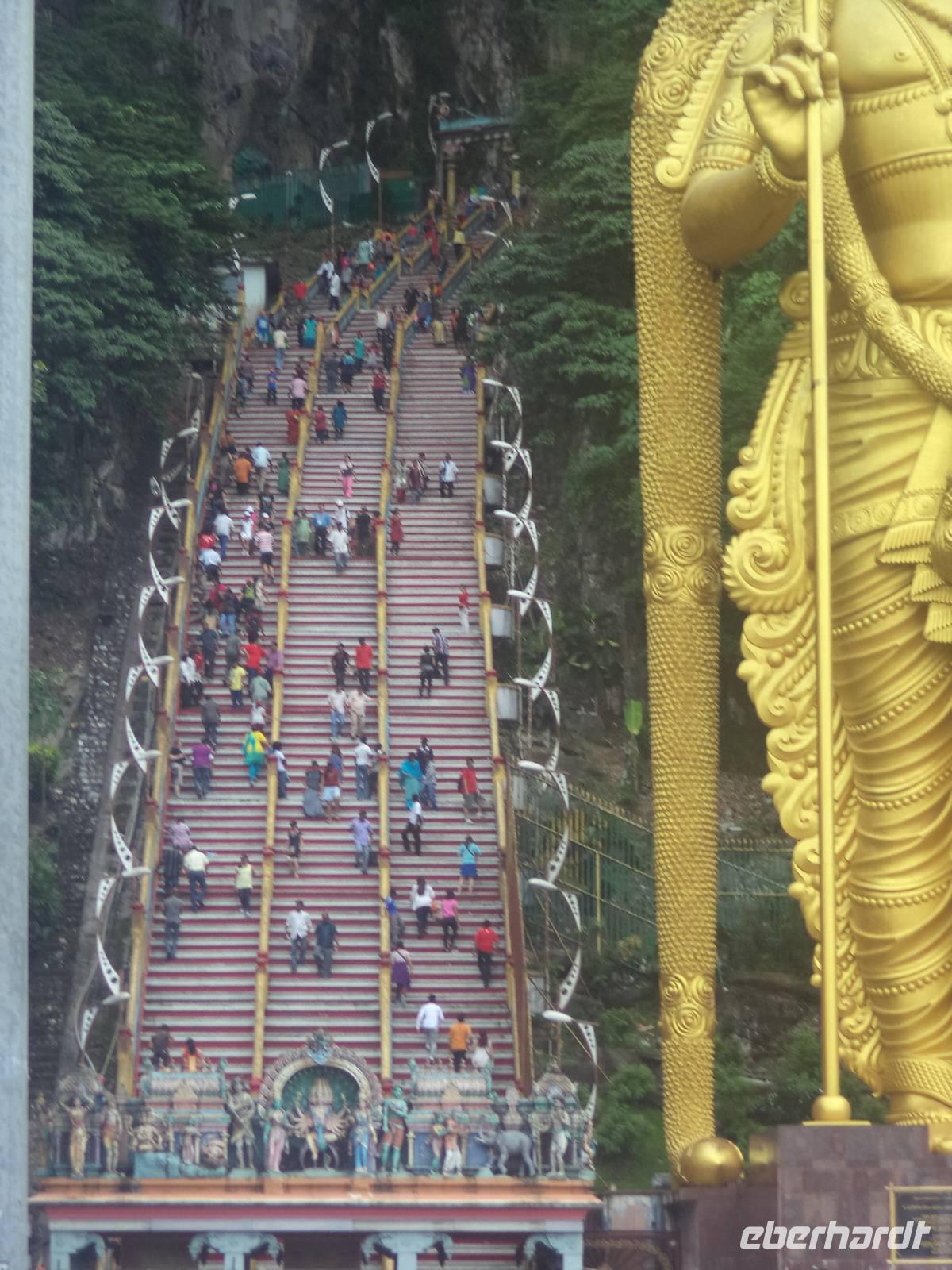 Am Morgen führen wir ein Stück hinaus aus Kuala Lumpur, das übrigens hier überall nur „KL" genannt wird. Nach kurzer Fahrt erreichten wir „wir heiligen Boden", denn in ganz Asien bekannt sind die Hinduheiligtümer in den Batu-Höhlen. Ihren Namen verlieh ihnen der gleich nebenan durch das Dorf fließende Batu-Fluß haben. Das verzweigte, an manchen Stellen mit der Höhe europäischer Kirchenschiffe konkurrierende, mehrere hundert Meter tiefe und oft helle, effektvoll von Tageslicht beleuchtete Höhlensystem beherbergt zahlreiche Hinduschreine und viele Figurten von Göttern und Dämonen. Hintergrund für die gewaltige, jährlich von Millionen Pilgern besuchte Stätte ist die Legende vom Sieg des Gottes Murugan über den Dämon Soorapadam, den er gerade hier erfocht. Eine gewaltige, 43 Meter hohe Statue des Gottes, erst 2006 fertiggestellt, beherrscht ganz in Gold gehüllt den Vorplatz. Die Höhlen befinden sich in der Mitte einer riesigen Kalkstein-Felswand und sind zu erreichen über eine breite Treppe mit 272 steilen Stufen. Dennoch sollte man den Aufstieg nicht scheuen: einzigartig in Raumwirkung und Farbenpracht ist dieser Ort das wohl wichtigste Heiligtum der Hindus in Malaysia und darüber hinaus. Das Höhlensystem war zwar schon seit Jahrhunderten bekannt, wurde aber im Jahre 1878 durch den Amerikaner William Hornaday berühmt, der den beeindruckenden größten Hohlraum beschrieb - die fast hundert Meter hohe Tempel- oder Kathedralenhöhle, in der wenig später mehrere Hindu-Schreine errichtet wurden. Relativ unberührt bis heute hingegen ist die daneben ein wenig tiefer liegende „Dunkle Höhle", über zwei Kilometer ausgedehnt und mit vielfachen Licht-Dunkel-Effekten.