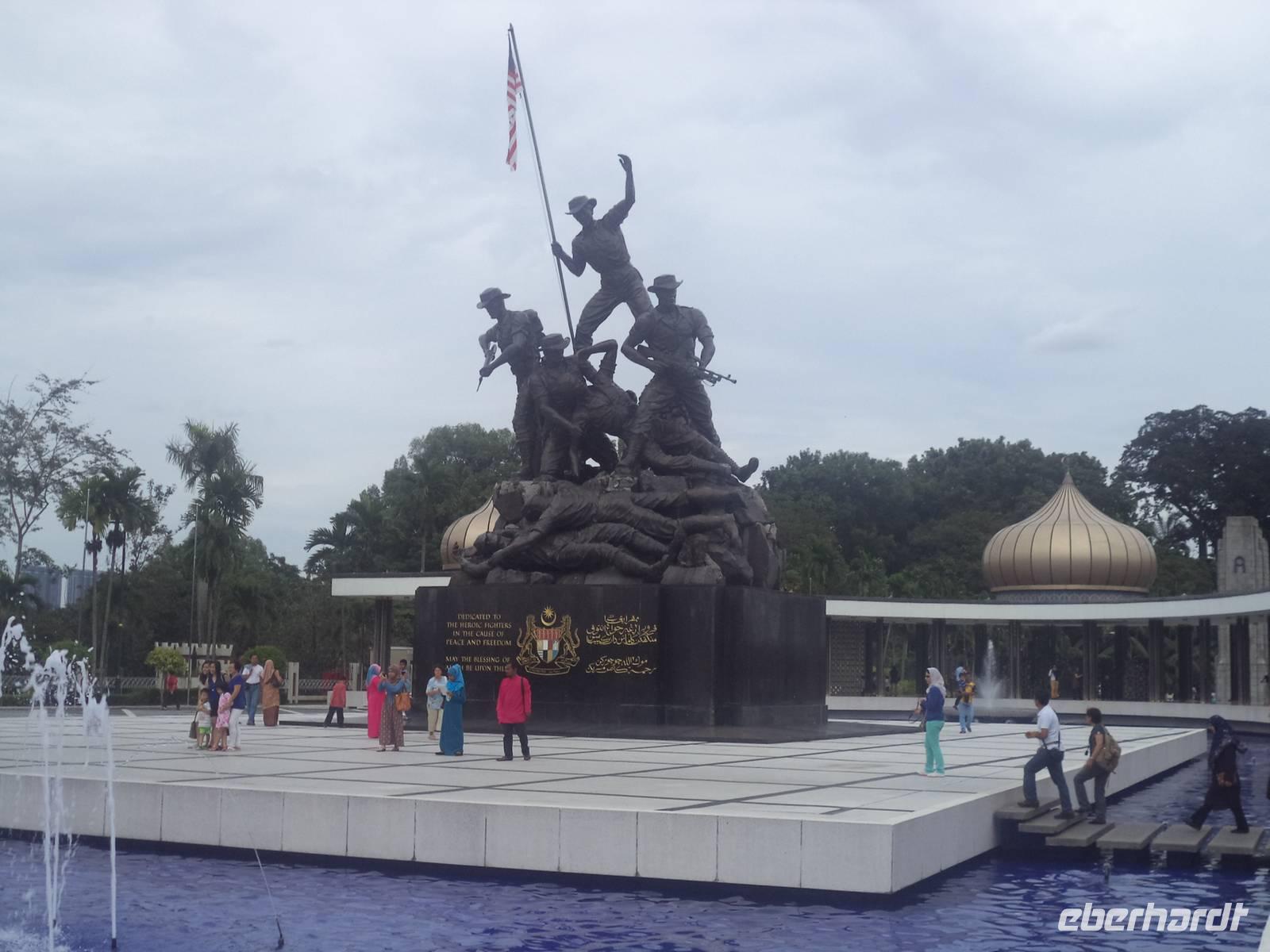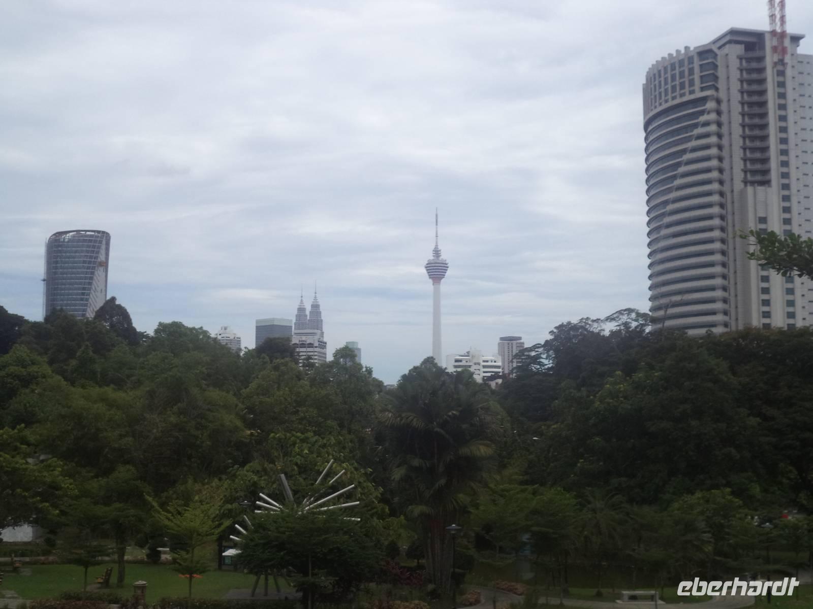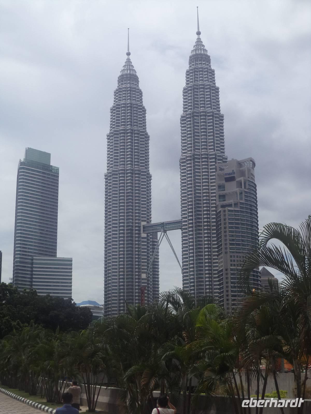 Nach ausgiebiger Besichtigung der „Batu-Caves" kehrten wir zurück nach „KL" um bei einer Rundfahrt das geschäftige Zentrum kennenzulernen. Unterwegs hielten wir am „Nationalen Gedächtnispark" gewidmet dem Kampf um Unabghängigkeit, Souveränität und Überwindung der kolonialen Vergangenheit. Deren Reste und der Ursprung des kolonialem KL finden sich rund um den Merdeka-Platz, zum Bespiel der alten viktorianische Bahnhof, die ehemalige Hauptpost, verschiedene alte Verwaltungsgebäude und der einstige britische Offiziersclub. . Zum Abschluss kamen wir natürlich auch noch zu einem lang ersehnten Fotostopp, um endlich KLs Wahrzeichen, die Petronas-Towers, zu fotograsfieren - was aber nur mit etwas Abstand zu den Kolossen möglich ist, um sie komplett aufzunehmen.
