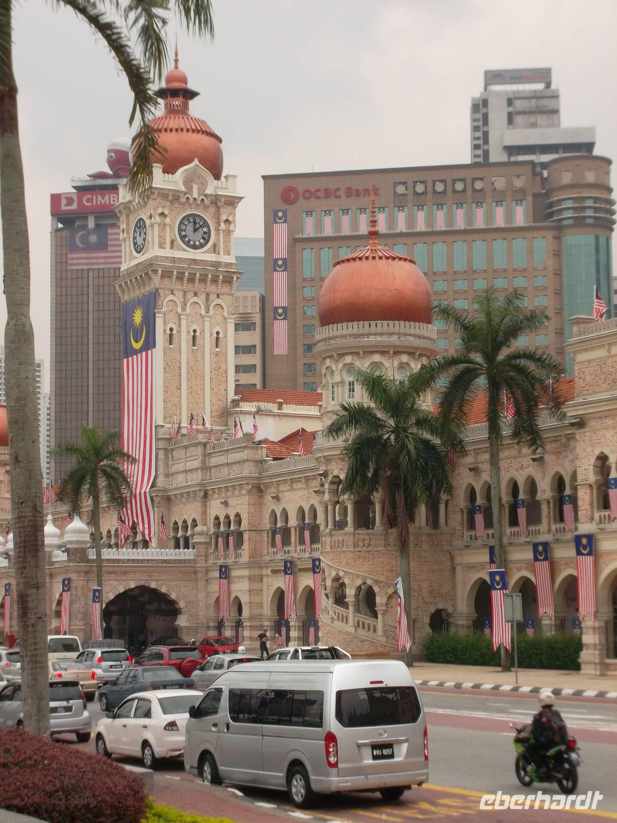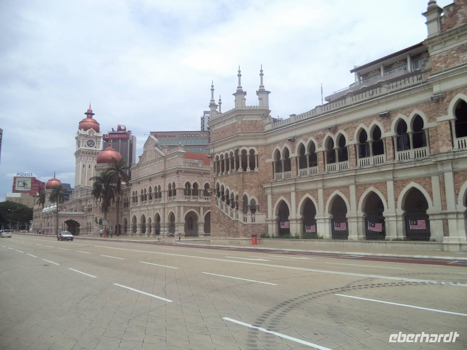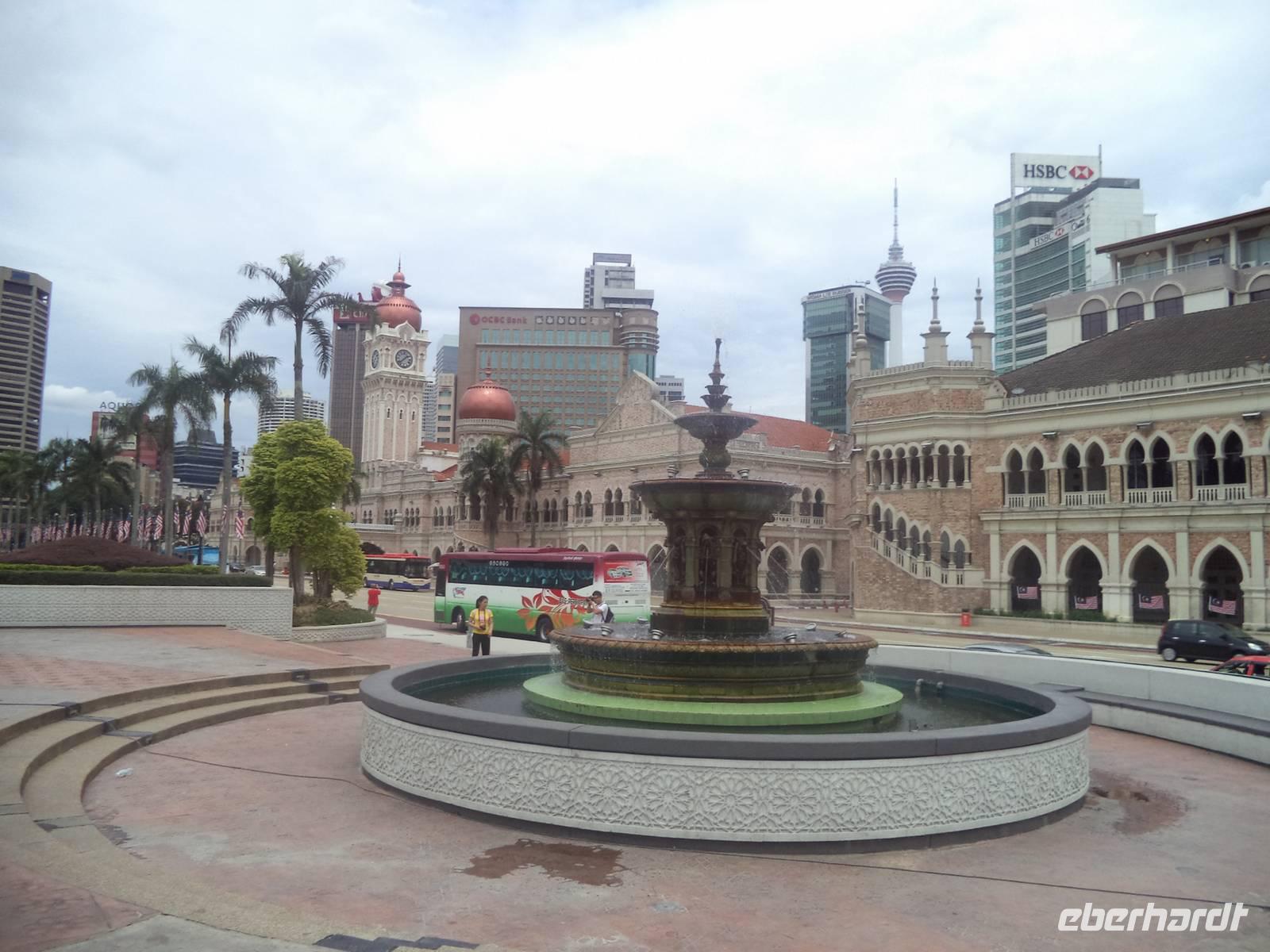 Nach ausgiebiger Besichtigung der „Batu-Caves" kehrten wir zurück nach „KL" um bei einer Rundfahrt das geschäftige Zentrum kennenzulernen. Unterwegs hielten wir am „Nationalen Gedächtnispark" gewidmet dem Kampf um Unabghängigkeit, Souveränität und Überwindung der kolonialen Vergangenheit. Deren Reste und der Ursprung des kolonialem KL finden sich rund um den Merdeka-Platz, zum Bespiel der alten viktorianische Bahnhof, die ehemalige Hauptpost, verschiedene alte Verwaltungsgebäude und der einstige britische Offiziersclub. . Zum Abschluss kamen wir natürlich auch noch zu einem lang ersehnten Fotostopp, um endlich KLs Wahrzeichen, die Petronas-Towers, zu fotograsfieren - was aber nur mit etwas Abstand zu den Kolossen möglich ist, um sie komplett aufzunehmen.