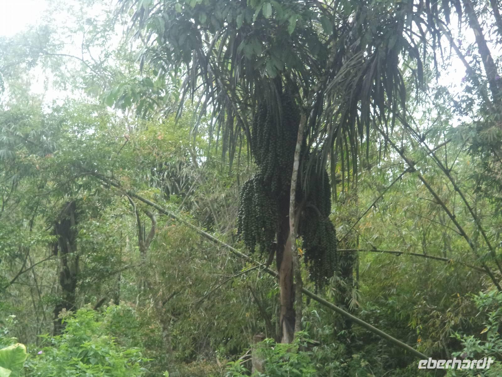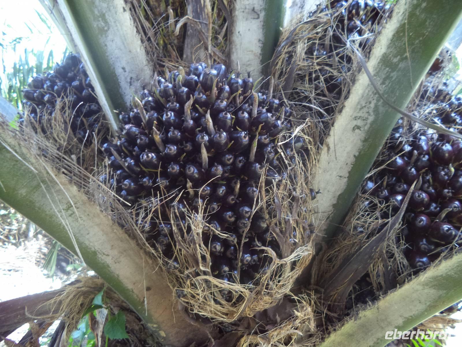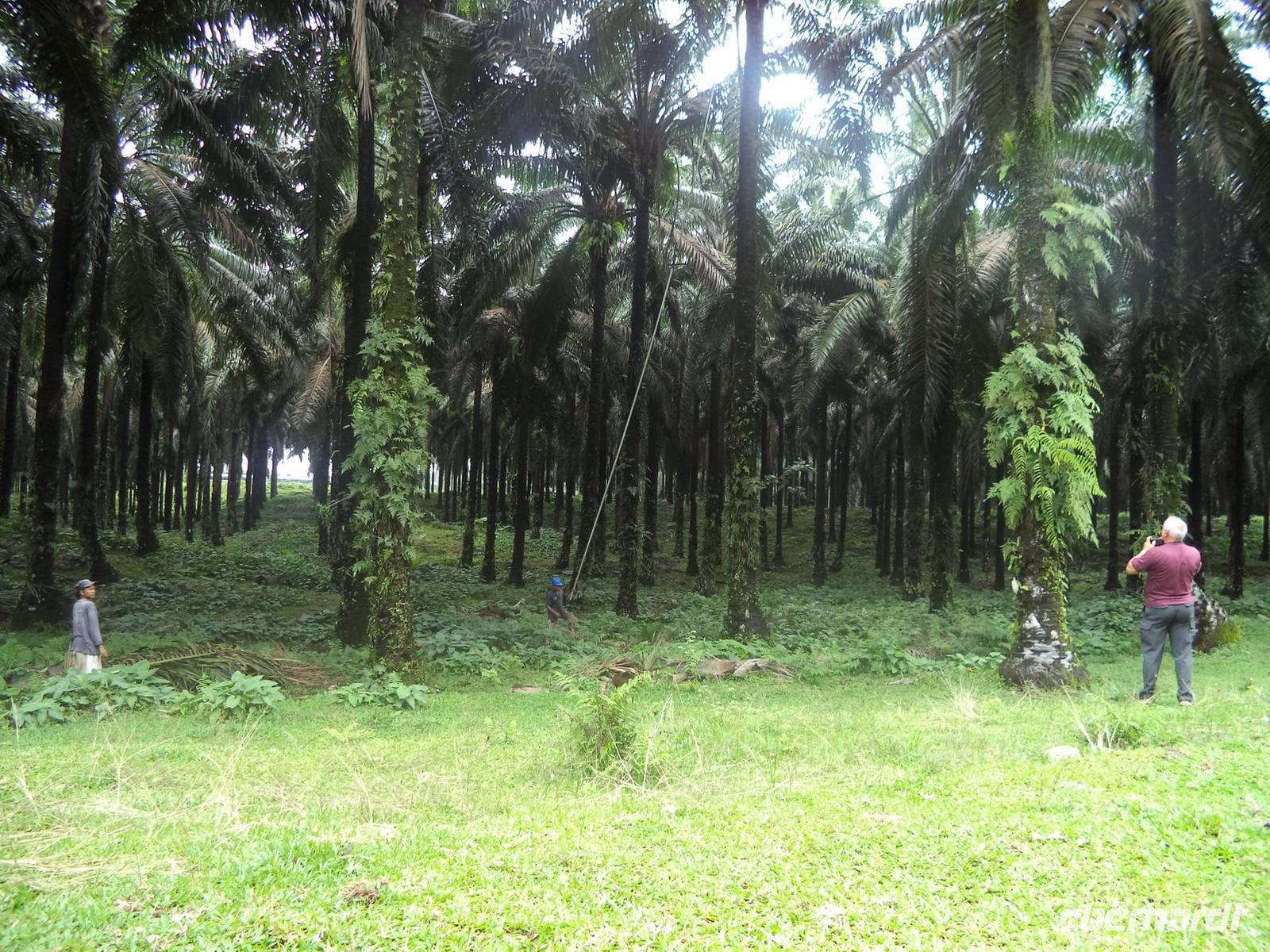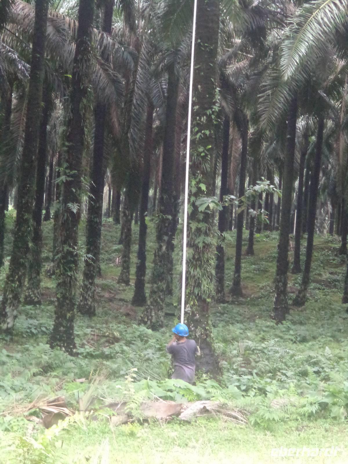 Immerhin erregten auch wir Europäer hier Aufsehen und mussten als „Fotomodelle" mit auf so manches rasche Handy-Foto. Unser Weg führte viele Kilometer lang durch Palmöl-Plantagen, deren Früchte Indonesien zum derzeit größten Palmöl-Produzenten der Welt machen. Natürlich konnten wir auch bei der Ernte der Palmfrüchte zusehen, deren Ergebnisse in großen Haufen am Boden lagen, bereit, auf vorbeifahrende LKWs aufgeladen und in die nahe Fabrik gebracht zu werden. Sowohl die Ernte als auch der Transport der reifen Palmfrucht-Trauben, die bis zu 30 kg wiegen können, ist körperliche Schwerstarbeit. Wir konnten beobachten, wie die Plantagenarbeiter vom Boden her mittels einer scharfen Sichel, befestigt an einem mehr als zehn Meter langen Aluminium- oder Bambusstab die Ansätze der Palmblätter, hinter denen die Fruchtstände lagen, durchtrennten und die Palme so lange ausästeten, bis sie schließlich die armdicken Stiele der Palmfrucht-Trauben durchschneide, konnten. Mit Getöse sausten dann die gewaltigen, schweren Fruchtstände mit Palmölfrüchten zu Boden. Die vom Baum geschlagenen reifen Palmfrüchte wurden dann mit einem speziellen Greifhaken angepickt und zu einem Sammelplatz gezogen, an dem die Ernte von einem halben oder ganzen Dutzend Palmen auf die Lastwagen wartete, die die Ölfrüchte zur Aufbereitung in die Fabrik bringen würden.