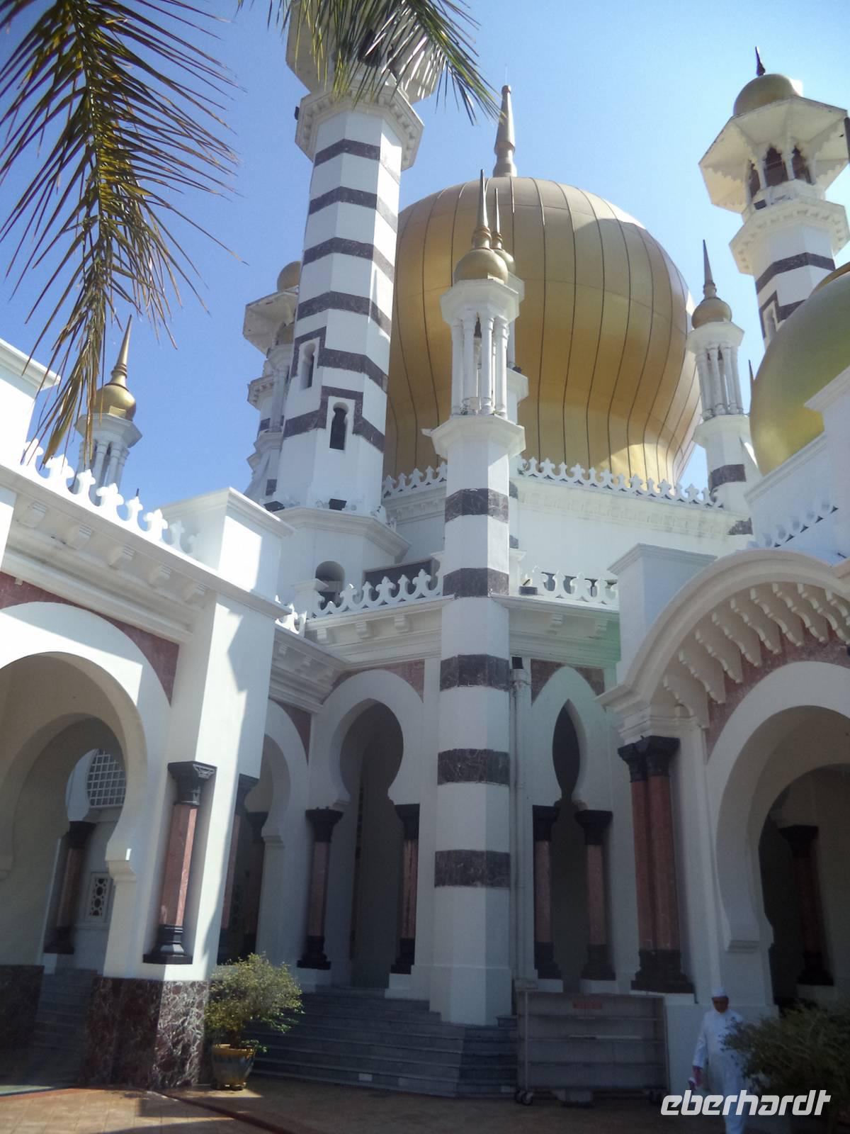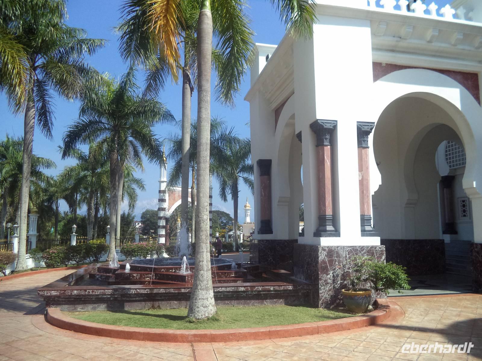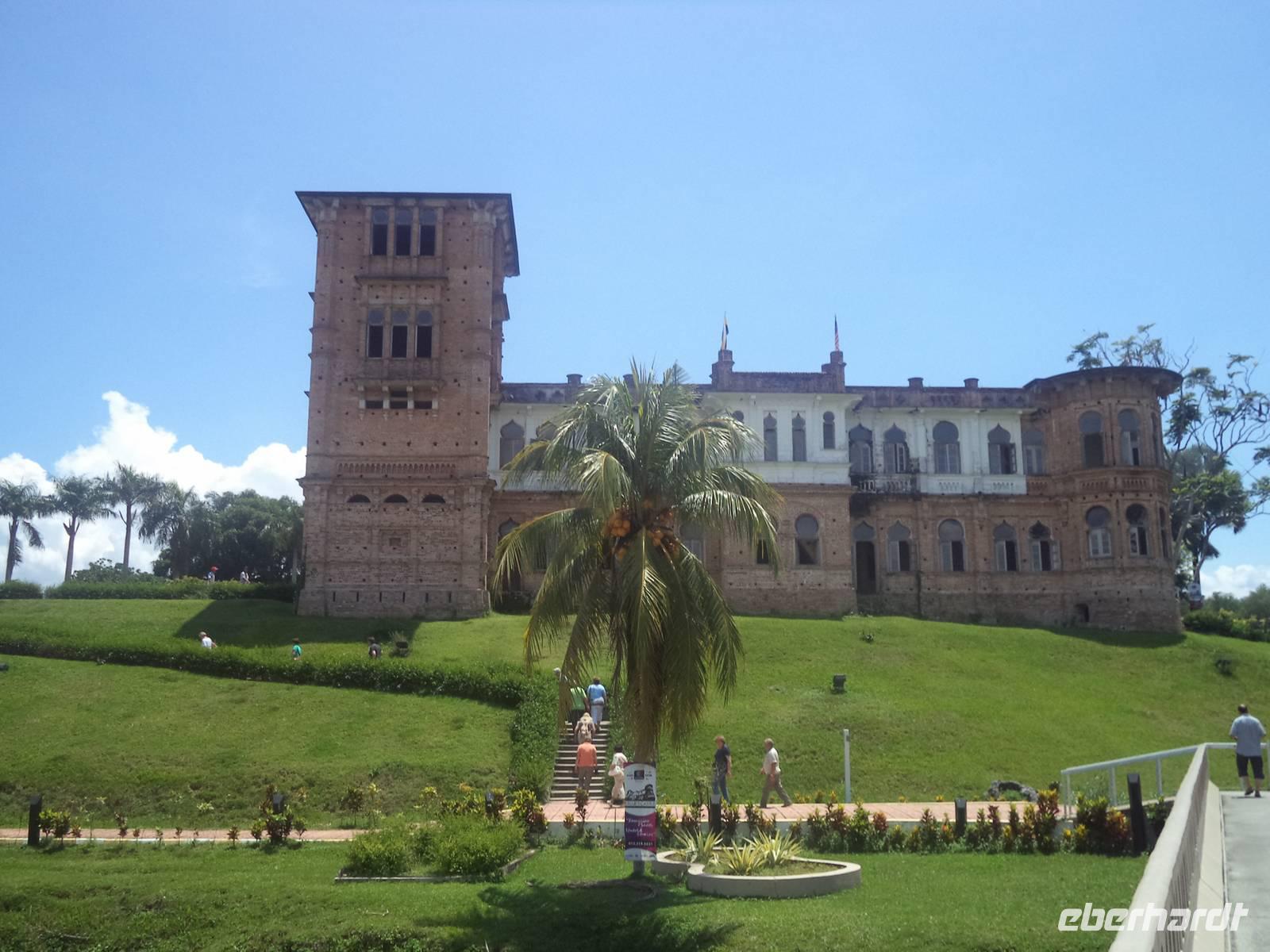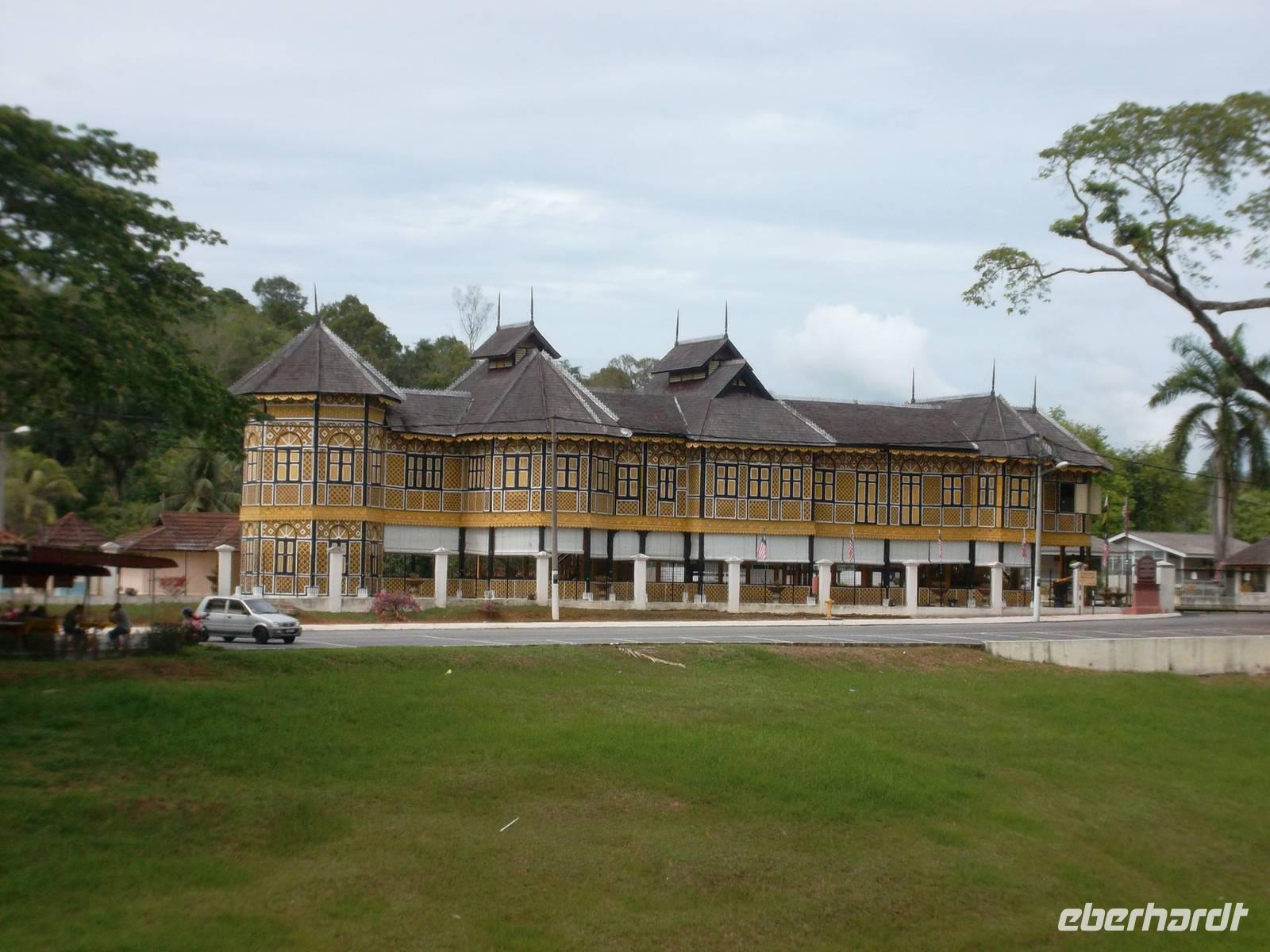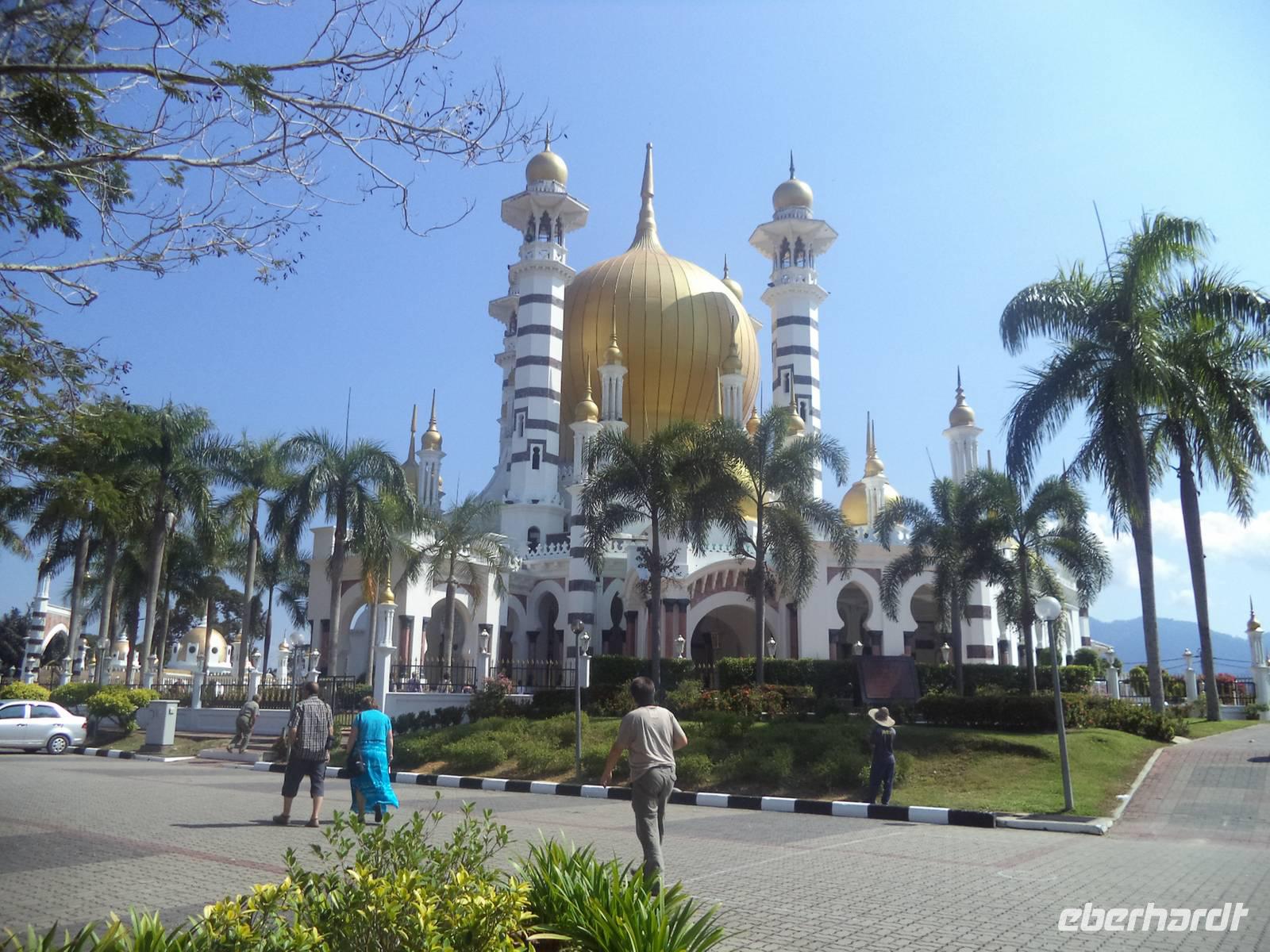 Weiter auf unserem Weg nach Norden hielten wir am Vormittag in der alten Fürstenstadt Kuala Kangsa. Sie immer noch Sultanssitz und historische wie neue Hauptstadt des malaysischen Bundesstaates und ehemaligen Sultanates Perak. Erster Höhepunkt und ein Muss für alle Besucher ist die überaus prunkvolle Ubudiah-Moschee. Das Betreten des Bethauses ist auch für Nichtmuslime gestattet, allerdings muss man sich an die religiösen Bedingungen und Vorschriften halten und ohne Schuhe sowie mit bedeckten Schultern und Beinen eintreten und sich betont ruhig verhalten. Dann allerdings kann man überaus interessante Anblicke im prunkvollen Bau und die getragene Atmosphäre einer bedeutenden religiösen Stätte genießen. Dicht neben der Moschee befindet sich der gewaltige Sultanspalast Iskanderia, immer noch Amtssitz des Sultans von Perak. Noch interessanter aber war der Gegensatz dieses Repräsentationsbaues zum alten Sultanspalast: nur einen Steinwurf weit entfernt liegt nämlich der Kenan-Bau, der ursprüngliche, auseinandernehmbare Holzpalast. Errichtet in traditioneller alter Bauweise und verziert mit raffinierten Schnitzereien, Malereien und Vergoldungen, beherbergt er heute ein Museum.