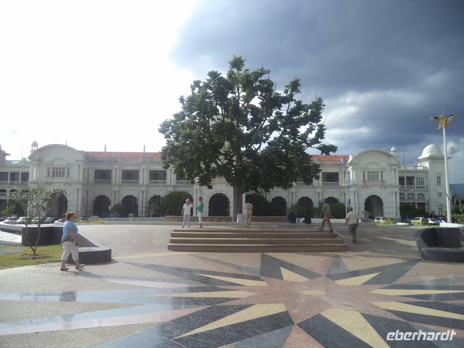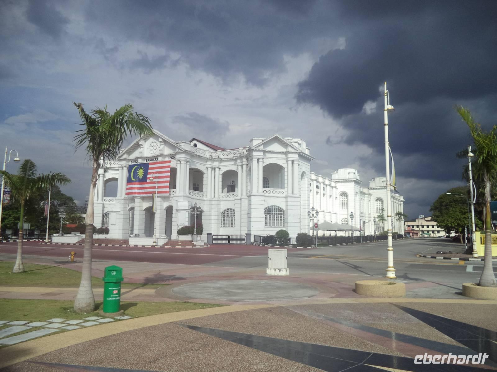 Eine kurze Stadtrundfahrt zum Hauptplatz zeigte dort beim Fotostopp die dicht zusammenliegenden Sehenswürdigkeiten der ansonsten modernen 700.000 Einwohner zählenden Stadt: das Blaue Haus, das Rathaus und den Bahnhof aus Kolonialzeiten und auf dem Vorplatz das für die Stadt namengebende Wahrzeichen, den Ipoh-Baum. Eigentlich bedeutet „Ipoh" auf Malaiisch „Gift", denn aus dem Baum, der in dieser Gegen zahlreich vorkommt, gewannen die Jäger und Krieger der hier wohnenden Stämme Ihr Pfeilgift für Speer, Pfeil und Blasrohr.