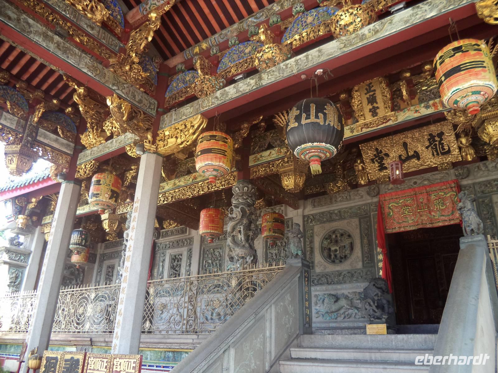 Auch mehrere der bewusst tempelartig gestalteten chinesischen Clanspaläste in der Innenstadt gehören dazu, von denen wir die prunkvollen Gebäude der Familie Khoo, die einst ein ganzes Stadtviertel beherrschte, besichtigten. Bis heute spiegelt der mitunter noch für Familientreffen genutzte Palast die würdevolle und nach wie vor traditionsverbundene Lebensweise der hiesigen chinesischen Familien wider. Später durchfuhren wir in den Rikschahs das Viertel Little India und gelangten dann als Abschluss zum Baba-Nyonya-Museum. Das alte Patrizierhaus entstand im gleichnamigen Kulturstil, erwachsen aus Verbindungen chinesischer und malaiischer Familien, die eigenen Lebens- und Baustil pflegten, eigene Traditionen und beispielsweise eine eigene typische Küche entwickelten, von der wir zum Abendessen in einem Restaurant am Meer eine Kostprobe erhielten.