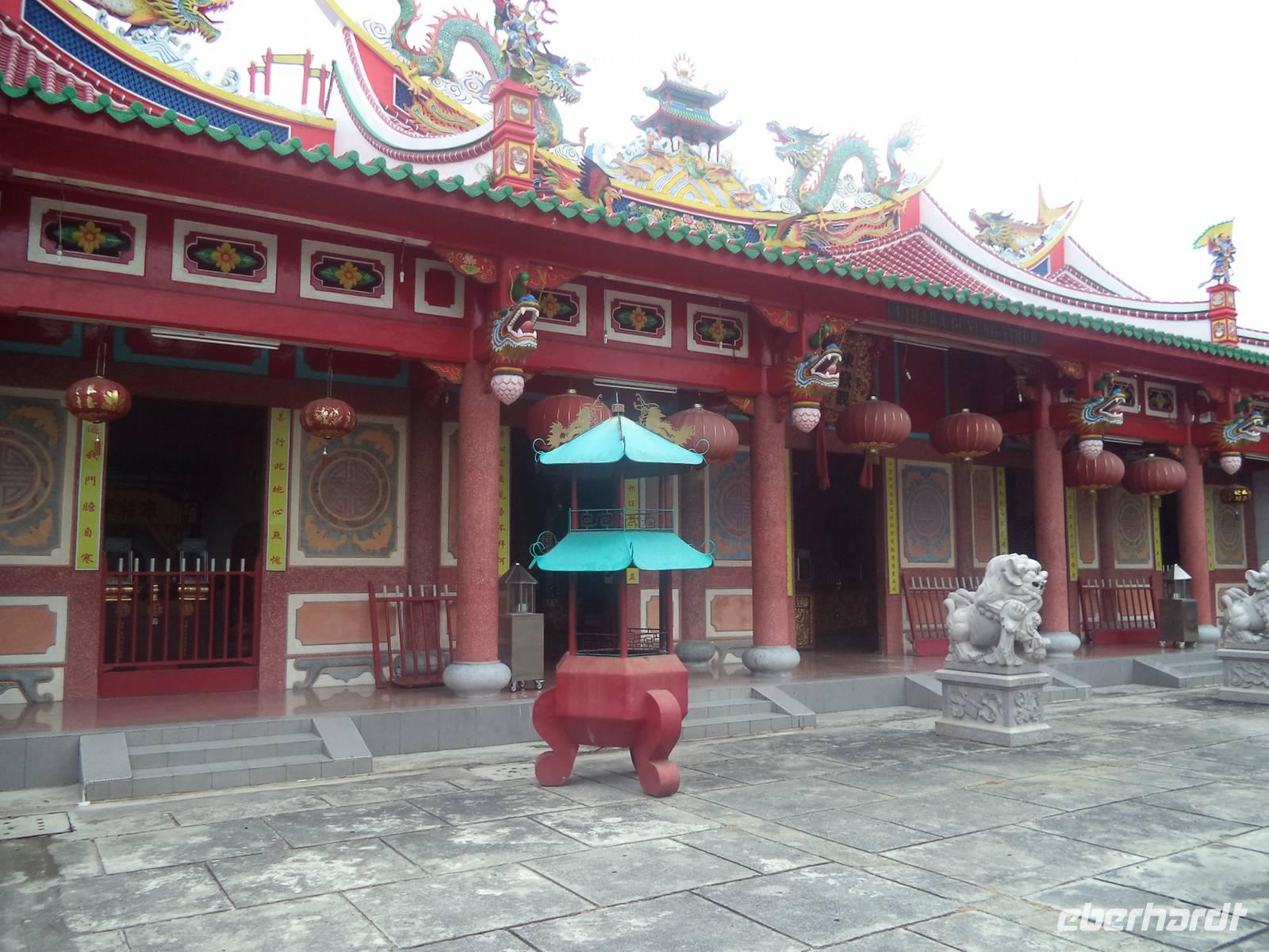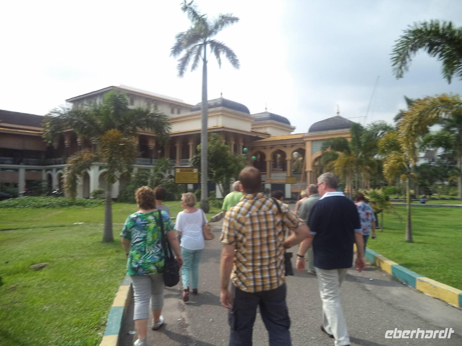 Sogleich fuhren wir nach Medan, dessen neuer Flughafen eine knappe Busstunde vom Zentrum entfernt ist und begannen unsere Stadtrundfahrt durch das leichte Verkehrschaos von Sumatras größter Stadt. Nicht allzuviel ist hier übrig vom kolonialen Erbe, wenige Gebäude in der Innenstadt deuten noch auf das alte Holländerviertel. Unsere erste Besichtigung galt dem größten buddhistisch-taoistischen Tempel Vihara Gunung Timur. Wie überall in Singapur, Malaysia und Indonesien haben die Menschen mit chinesischen Wurzeln großen Anteil innerhalb der Bevölkerung und in ihren Tempeln spiegeln sich Wohlstand und Einfluß der großen chinesischen Gemeinde. Danach hatten wir zunächst Mittagspause am Freiheitsplatz, dem „Lapangan Merdeka" mit Gelegenheit zum Bummeln und zum Mittagessen, denn die meisten sehednswerten Dinge waren durch das Freitagsgebet über die Mittagszeit nicht zugänglich. Nach der Mittagspause besuchten wir zunächst die Raya-Moschee, erbaut gegenüber dem ehemaligen Sultanspalast im Jahre 1905 von einem Holländer. Der Prachtbau zeigt muslimisch-indischen Mogulstil und Nicht-Muslime sind herzlich zum Besuch des Gebetshauses eingeladen. Wer dem Gebetsruf des Muezzin, den er traditionell mehrmals täglich zu den Gebetszeiten vom Minarett erschallen läßt, folgen will, betritt einen geräumigen, fast leeren Saal, der mit Teppichen ausgelegt, den Gebeten dient, aber zwischen den Gebetszeiten auch als Ruheplatz genutzt werden darf. Nicht weit von hier lag ein weiterer interessanter Besichtigungspunkt, der historische Sultanspalast Istana Maimoon. Bis heute ist das Betreten des alten Regierungssitzes, den 1888 ein Architekt aus Italien als „Märchenschloss" erbaute eine Besonderheit. Viele Indonesier nutzen die Gelegenheit, sich hier prachtvolle Kostüme auszuleihen und sich auf dem Thron fotografieren zu lassen.