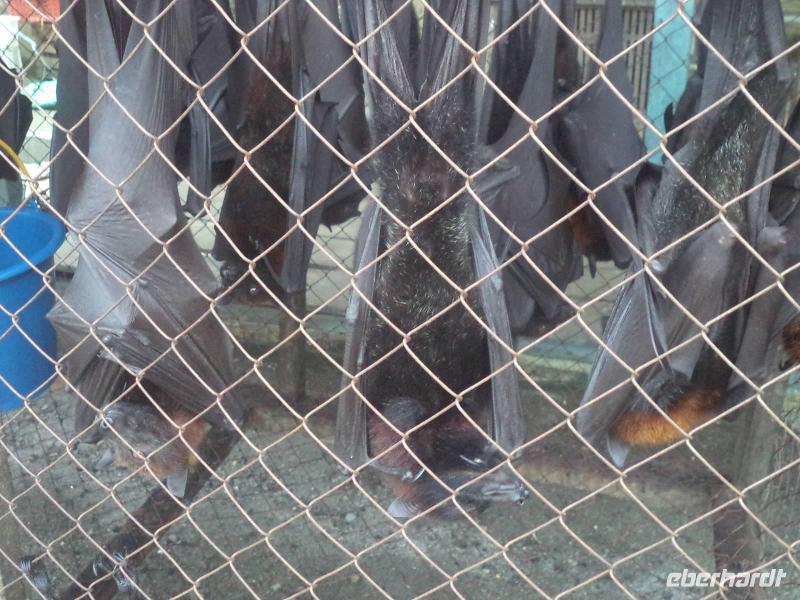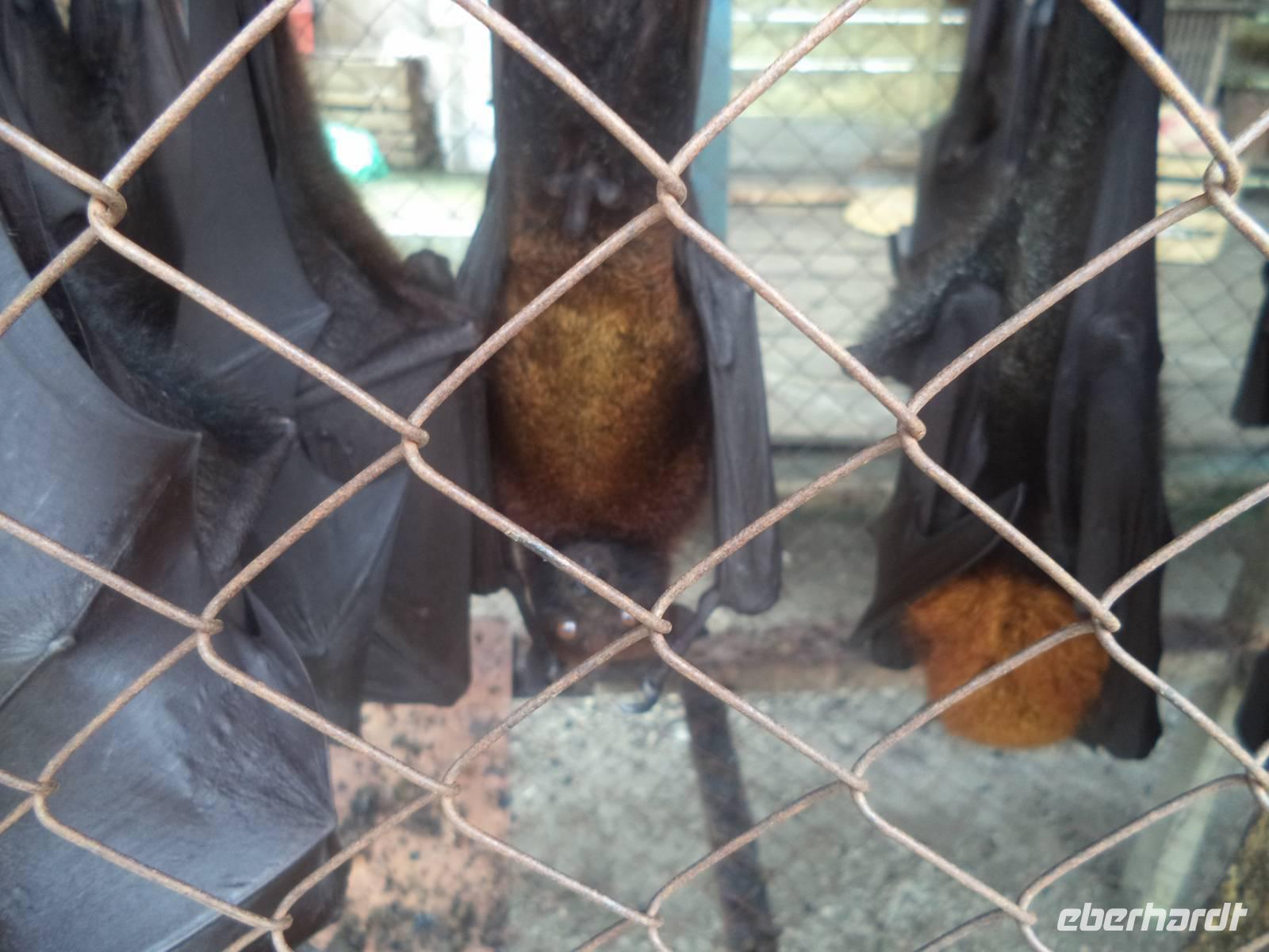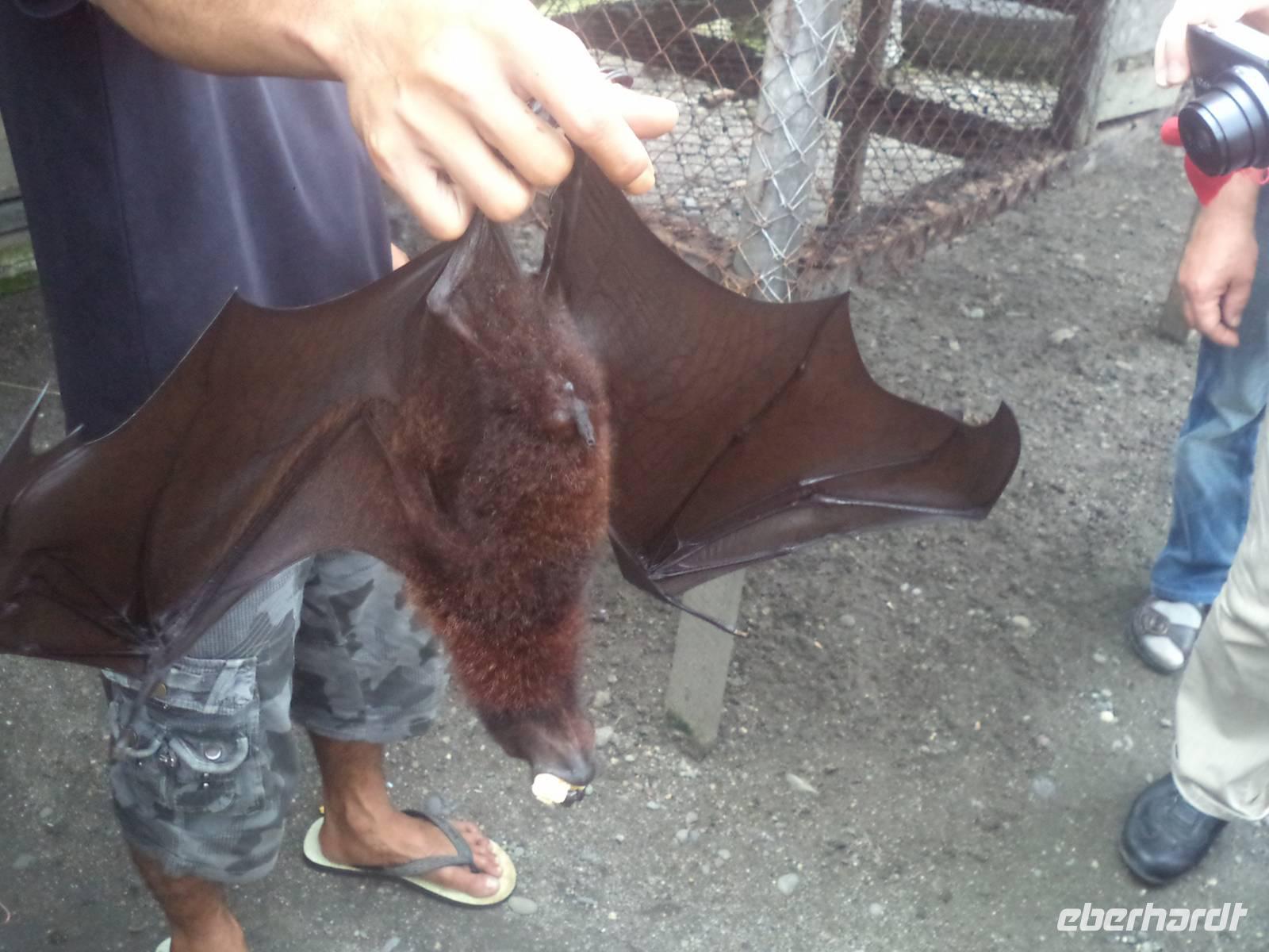 Um nun in den Süden zur weiteren Strecke und in Richtung Tobasee zu gelangen, mussten wir zunächst zurück bis Medan und dann weiter Richtung Südost bis ins Batak-Land. Im Vergnügungsort Greenhill hatten wir Mittagspause und Gelegenheit zum Mittagessen und konnten dann einen Fotostopp am Sembaha Fluss einlegen, einer Sommerfrische für die Einheimischen, die gern in der Ferienzeit oder am Wochenende zum Kurzurlaub herkommen Kleine Hüttchen und Gästeunterkünfte säumen den Fluss, an dem sich die Sommerfrischler die Zeit mit Baden oder „Rafting" mit aufgeblasenen Autoreifen vertreiben oder immer wieder Drinks oder kleine Snacks an den zahlreichen einheimischen Imbissbuden zu sich nehmen. Auf der Weiterfahrt hielten wir auf Vorschlag unserer Reiseleiterin Linda an einer Stelle an der Straße, wo wir lebende Flughunde - leider im Käfig - sehen konnten. Überall in den Regenwäldern Sumatras kommen diese zu den Fledertieren gehörenden Säuger vor. Sie sind den Fledermäusen ähnlich aber zumeist größer als diese, wirken aufgrund ihrer Flügelspannweite von mehr als einem Meter oft sogar bedrohlich. Dabei sind die Pflanzenfresser, deren länglicher hundeähnlicher Kopf zu ihrem Namen geführt hat, völlig ungefährlich. Sie sind inzwischen stark vom Aussterben bedroht, da sie mancherorts als Plantagenschädlinge, anderswo wegen ihres Fleisches gejagt werden. Auch hier, an der Stelle wo wir sie fotografieren konnten, sollten die aus der Wildnis gefangenen Tiere an Einheimische verkauft werden, die sie als Heilmittel benötigen. Für uns war es diesmal die einzige und einmalige Gelegenheit, die possierlich wirkenden Tiere einmal aus der Nähe zu betrachten und fotografieren zu können.