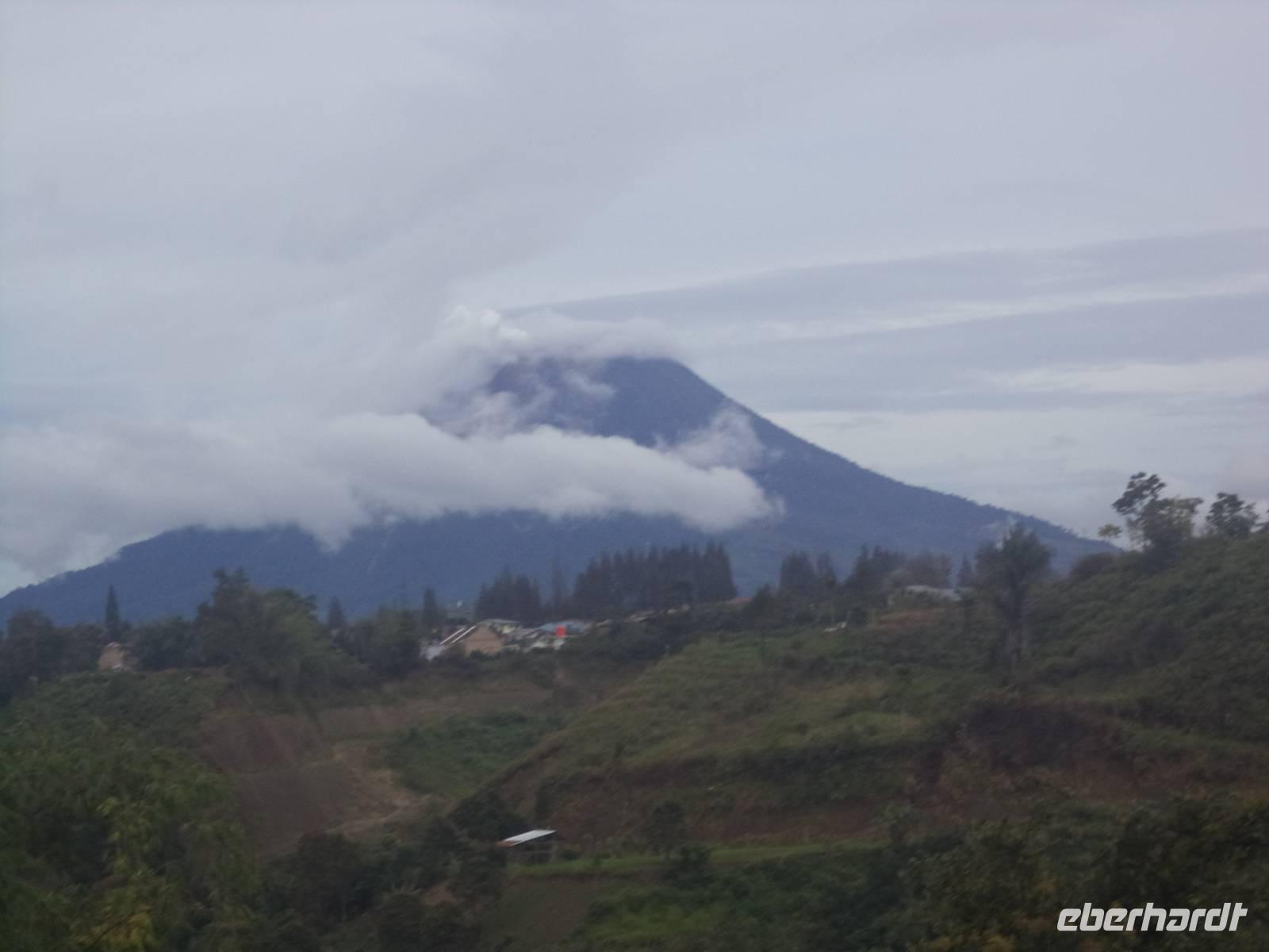 Heute Morgen gab es zunächst einen Fotostopp am Gundaling-Hügel. Am Vorabend hatte man aufgrund des regnerischen Wetters fast gar nichts von der schönen Umgebung gesehen und auch heute früh war es nicht besonders klar. Dennoch konnten wir einen ganz guten Blick auf den gerade leicht tätigen Vulkan Sinabung werfen, während der benachbarte Sibayak sich kaum zeigte.