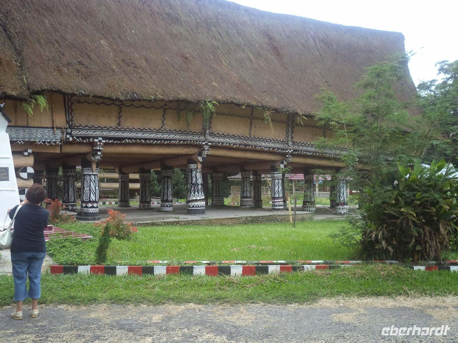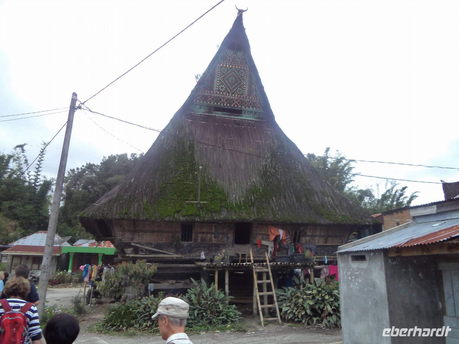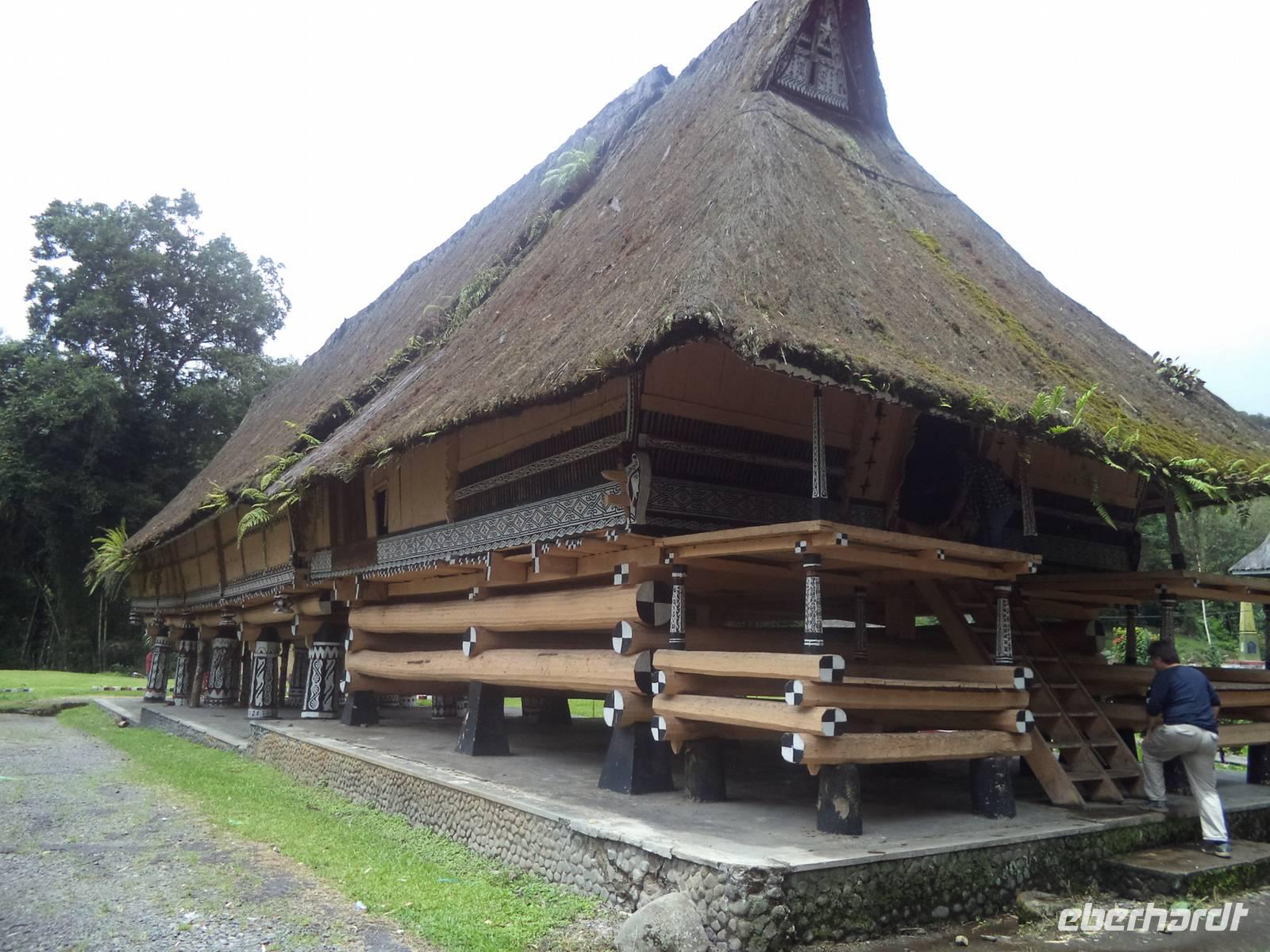 Schon seit gestern Nachmittag waren wir unterwegs im Land der Batak, die sich in fünf Hauptstämme unterteilen. Heute begannen wir mit einem Besuch im Batak-Karo-Dorf Dokan. Hier gab es die Möglichkeit, mit Billigung des Clanchefs natürlich, eines der noch in traditioneller Bauweise aus Holz und Bambus errichteten Privathäuser von innen zu sehen. Hier leben bis zu acht Familien unter Führung des ältesten Mannes, in einem riesigen Haus mkt steiler Dachkonstruktion zusammen, das immer noch so gebaut und eingerichtet ist wie vor Jahrhunderten. Obwohl wir ohne Vorankündigung kamen, hieß uns die Großfamilie herzlich willkommen und ließ uns bereitwillig überall herumschauen und fotografieren. Es ist ein einmaliges Erlebnis und genau „richtiges Reisen", wenn man so wie hier „hinter die Kulissen" des Alltagslebens der Menschen blicken darf! Nach dem Abschied von den Hausbewohnern und dem Ende der Runde durch das Dorf konnten wir die Eindrücke dann beim nachfolgenden Besuch eines Langhauses mit Museum vertiefen. Das „Rumah Bolong"-Langhaus war einst Sitz der letzten Simalungun-Könige, die nach der Unabhängigkeit Indonesiens entmachtet wurden. Das interessante Ensemble aus „Schloss", Wachhaus, Repräsentationsgebäuden und Speichern steht noch an historischem Ort und ist sehr malerisch und fotogen und vertieft den Eindruck der typischen Architektur und Lebensweise der Batak-Völker