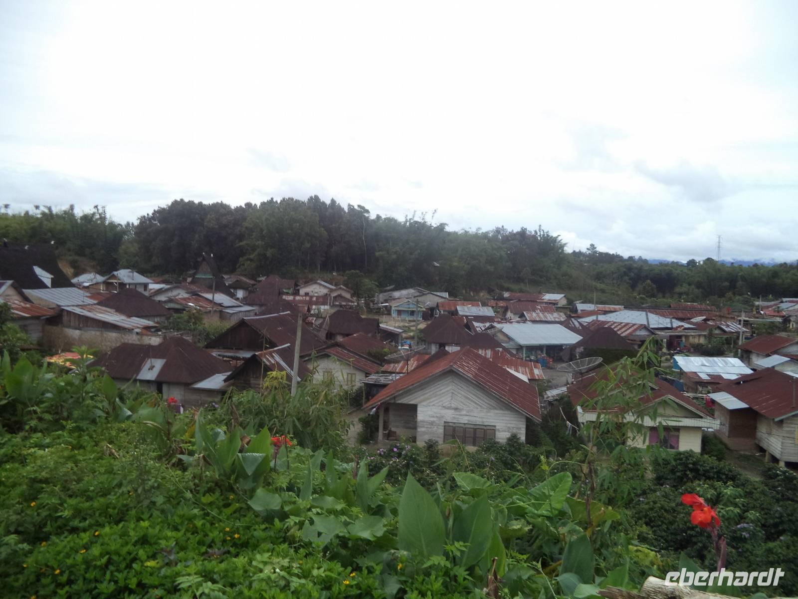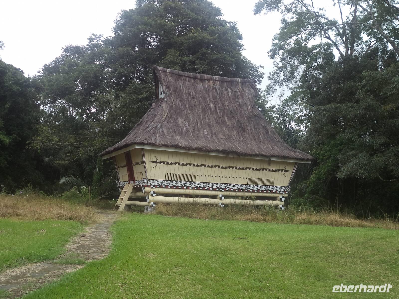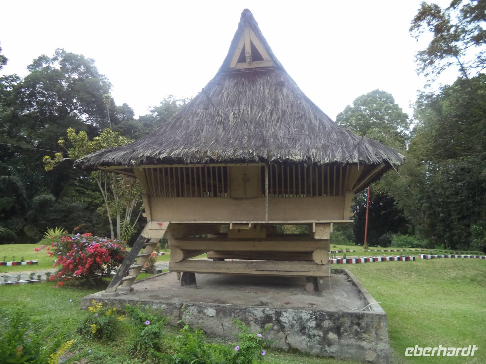 Schon seit gestern Nachmittag waren wir unterwegs im Land der Batak, die sich in fünf Hauptstämme unterteilen. Heute begannen wir mit einem Besuch im Batak-Karo-Dorf Dokan. Hier gab es die Möglichkeit, mit Billigung des Clanchefs natürlich, eines der noch in traditioneller Bauweise aus Holz und Bambus errichteten Privathäuser von innen zu sehen. Hier leben bis zu acht Familien unter Führung des ältesten Mannes, in einem riesigen Haus mkt steiler Dachkonstruktion zusammen, das immer noch so gebaut und eingerichtet ist wie vor Jahrhunderten. Obwohl wir ohne Vorankündigung kamen, hieß uns die Großfamilie herzlich willkommen und ließ uns bereitwillig überall herumschauen und fotografieren. Es ist ein einmaliges Erlebnis und genau „richtiges Reisen", wenn man so wie hier „hinter die Kulissen" des Alltagslebens der Menschen blicken darf! Nach dem Abschied von den Hausbewohnern und dem Ende der Runde durch das Dorf konnten wir die Eindrücke dann beim nachfolgenden Besuch eines Langhauses mit Museum vertiefen. Das „Rumah Bolong"-Langhaus war einst Sitz der letzten Simalungun-Könige, die nach der Unabhängigkeit Indonesiens entmachtet wurden. Das interessante Ensemble aus „Schloss", Wachhaus, Repräsentationsgebäuden und Speichern steht noch an historischem Ort und ist sehr malerisch und fotogen und vertieft den Eindruck der typischen Architektur und Lebensweise der Batak-Völker