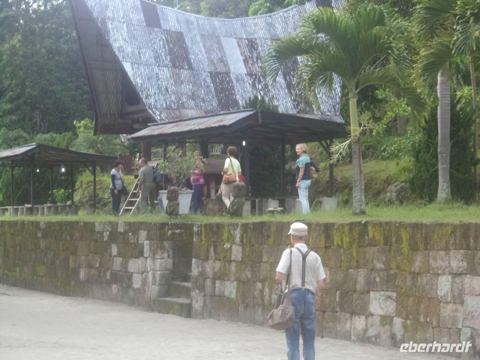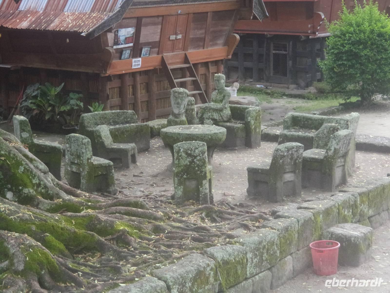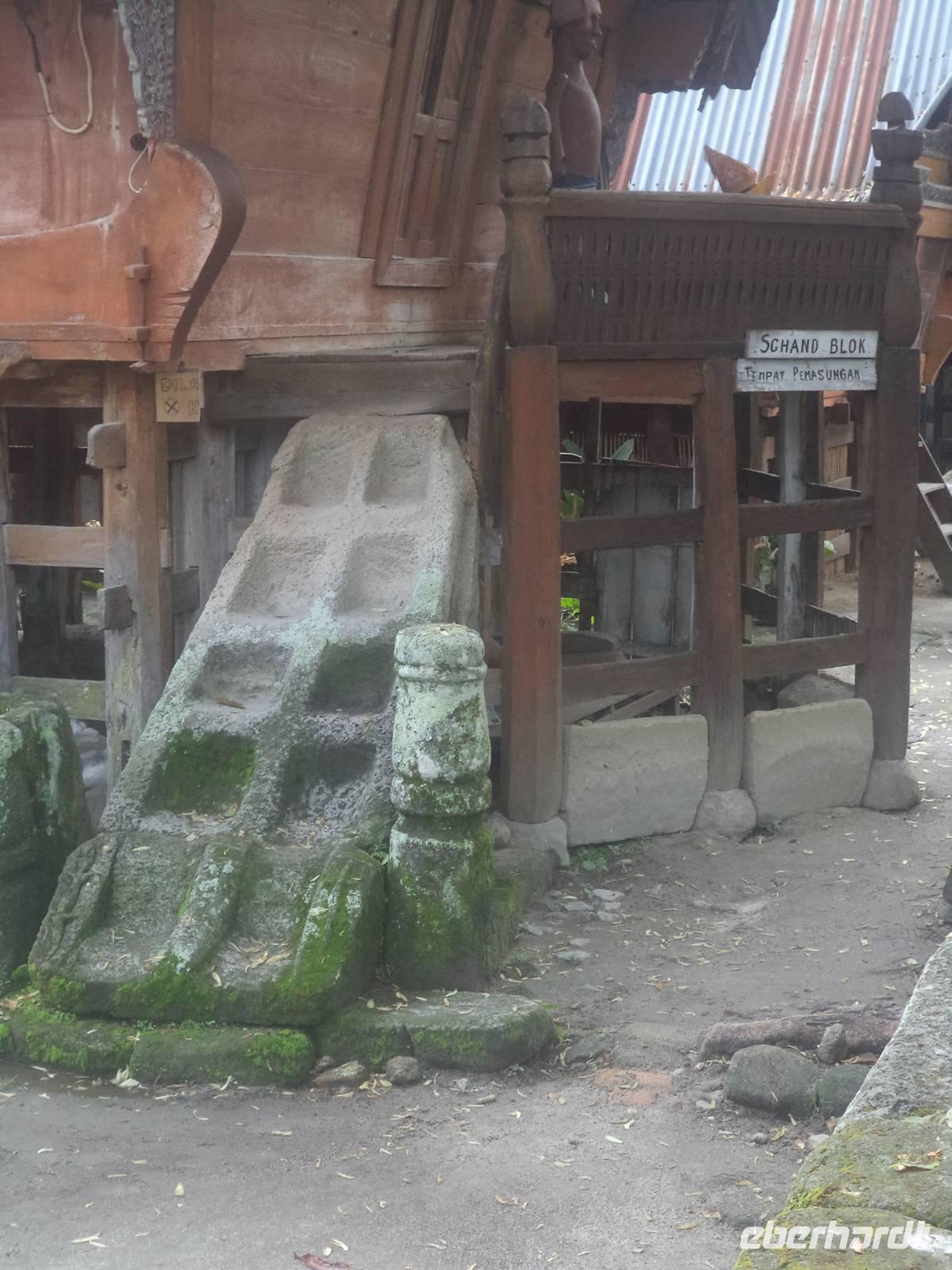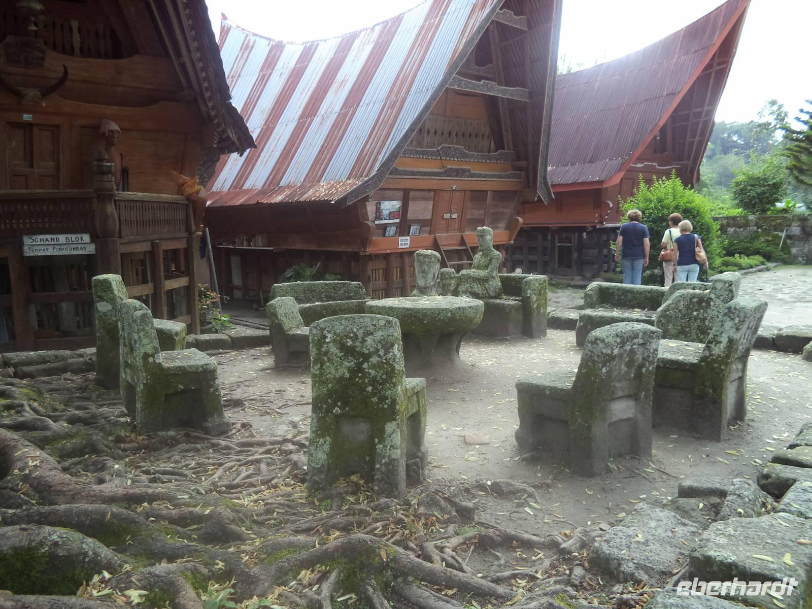 Unser Wasserfahrzeug brachte uns zunächst in den urwüchsigen Ort Ambarita mit seinem original erhaltenen Dorfkern ganz in der Art der Batak-Toba-Dörfer. Der bescheidene Königspalast ist umgeben von Häusern in traditioneller Bauweise auf Stelzen und beherbergt eine gut erhaltene Gerichts- und Ritualstelle der Batak. Alles im Dorf atmet noch komplett die alten Traditionen und Lebensweise, beginnend bei der Umfassungsmauer, die nur einen einzigen Durchschlupf hinein und einen hinaus bietet - die der Tradition folgend genauso hoch sein müssen, dass eine Frau mit Reissack auf dem Kopf und so breit, das ein Wasserbüffel hindurchpasst. Das Besondere an Ambarita sind die beiden original erhaltenen Kultstätten mit steinernen Möbeln: der Versammlungs- und Gerichtsplatz vor dem Königspalast und direkt an der Umfassungsmauer des Dorfes der Richtplatzt für rituelle Hinrichtungen. Mit ausführlichen Erklärungen zu Glauben und Rechtsgebaren der Batak Toba und Schilderung der Riten zum Erfassen und Beherrschen der magischen Kräfte potentiell böser Menschen gelang es uns ziemlich gut, die geschilderten Abläufe des Dorflebens vor noch nicht allzu langer Zeit vorzustellen.