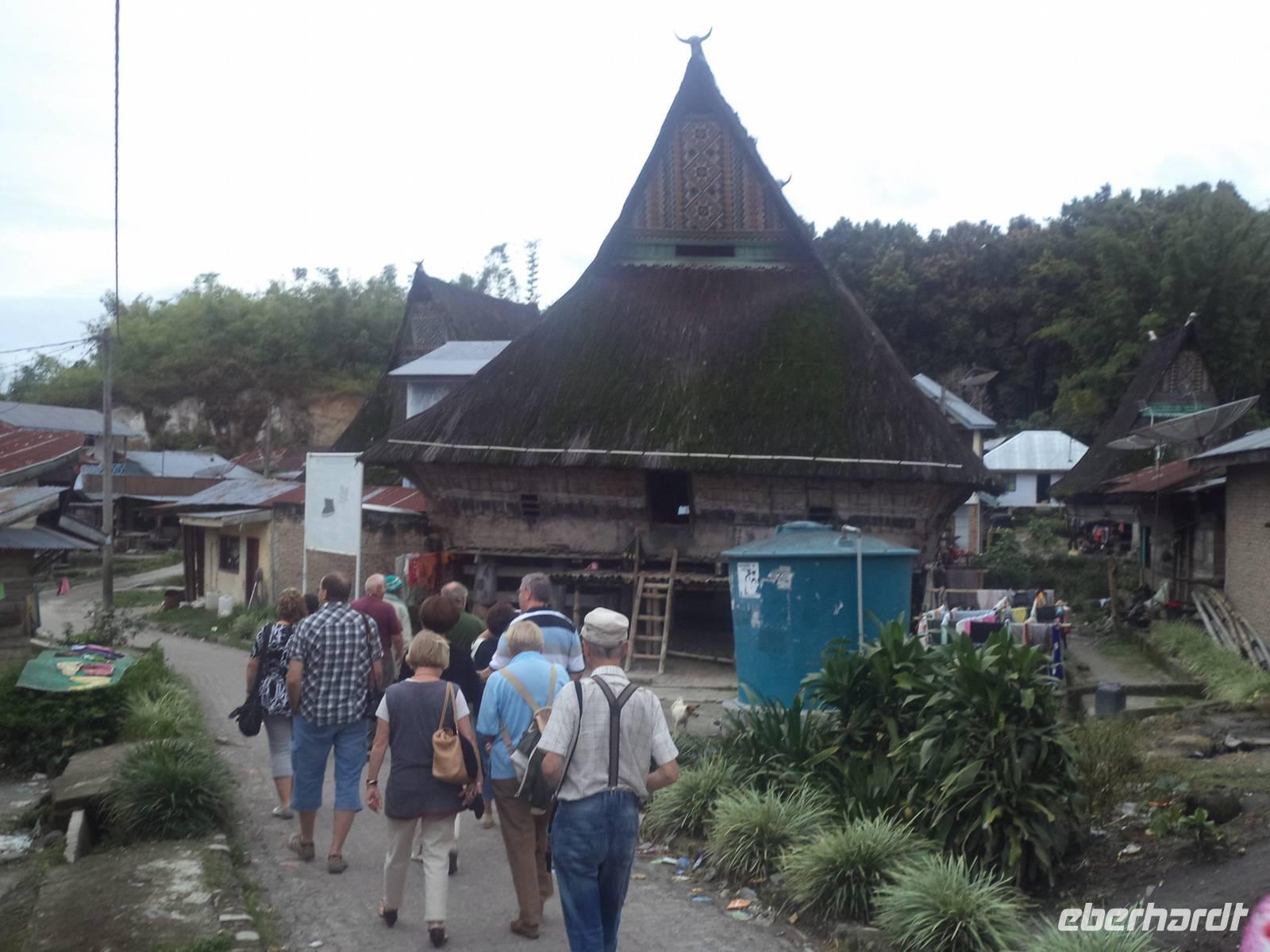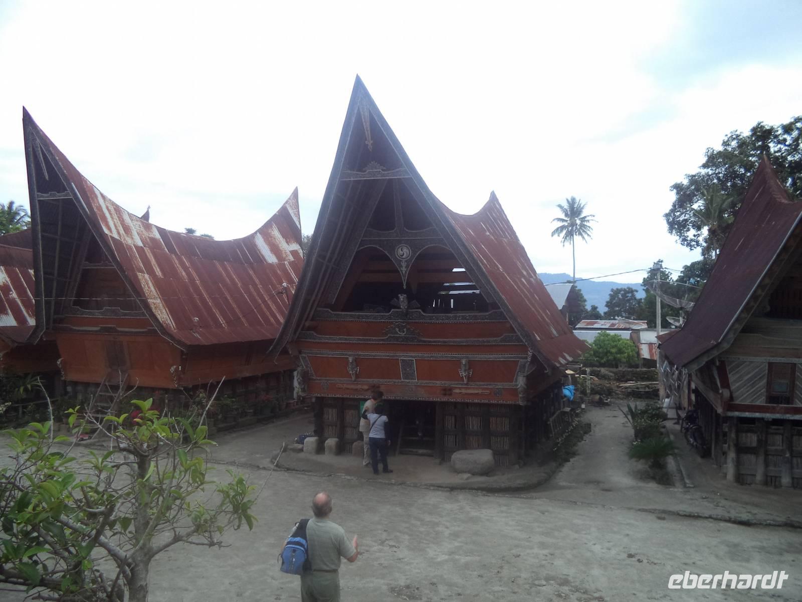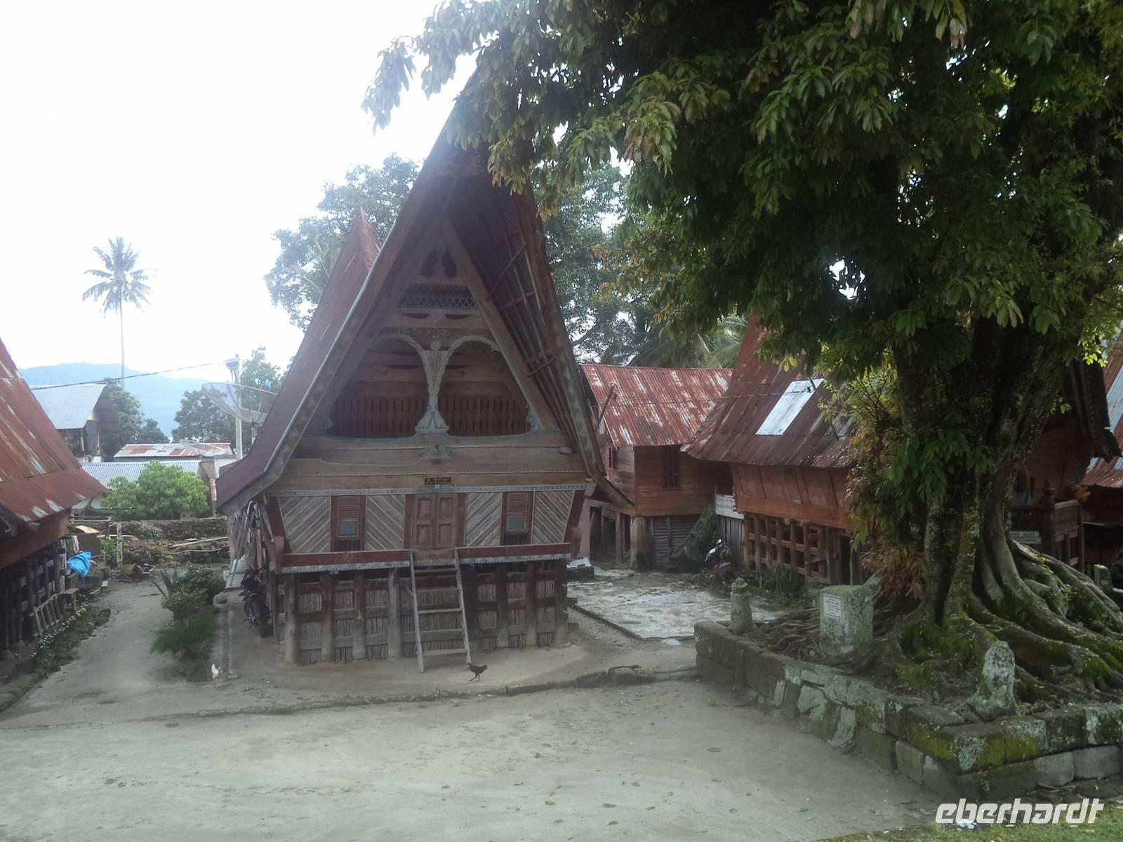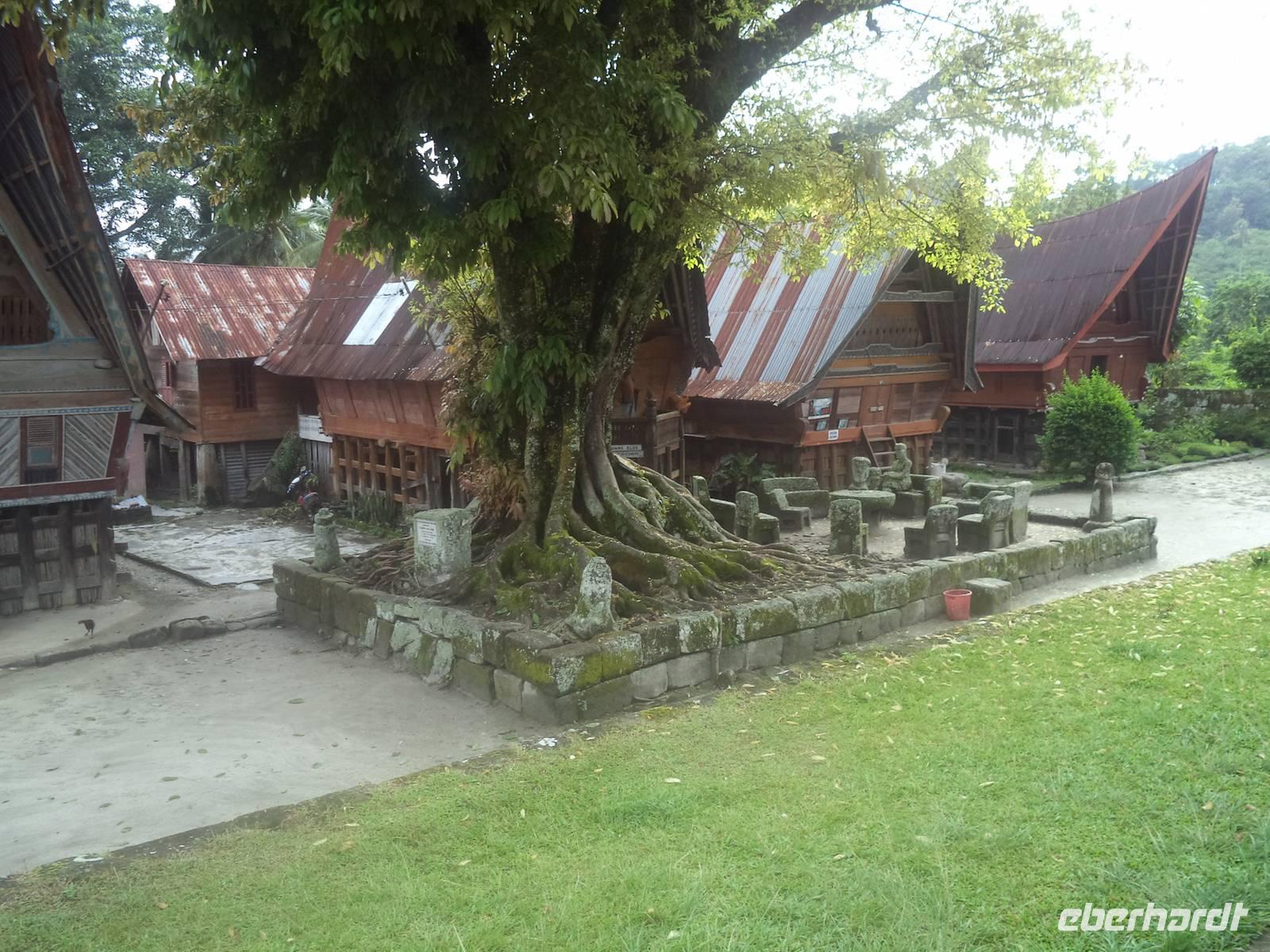 Unser Wasserfahrzeug brachte uns zunächst in den urwüchsigen Ort Ambarita mit seinem original erhaltenen Dorfkern ganz in der Art der Batak-Toba-Dörfer. Der bescheidene Königspalast ist umgeben von Häusern in traditioneller Bauweise auf Stelzen und beherbergt eine gut erhaltene Gerichts- und Ritualstelle der Batak. Alles im Dorf atmet noch komplett die alten Traditionen und Lebensweise, beginnend bei der Umfassungsmauer, die nur einen einzigen Durchschlupf hinein und einen hinaus bietet - die der Tradition folgend genauso hoch sein müssen, dass eine Frau mit Reissack auf dem Kopf und so breit, das ein Wasserbüffel hindurchpasst. Das Besondere an Ambarita sind die beiden original erhaltenen Kultstätten mit steinernen Möbeln: der Versammlungs- und Gerichtsplatz vor dem Königspalast und direkt an der Umfassungsmauer des Dorfes der Richtplatzt für rituelle Hinrichtungen. Mit ausführlichen Erklärungen zu Glauben und Rechtsgebaren der Batak Toba und Schilderung der Riten zum Erfassen und Beherrschen der magischen Kräfte potentiell böser Menschen gelang es uns ziemlich gut, die geschilderten Abläufe des Dorflebens vor noch nicht allzu langer Zeit vorzustellen.