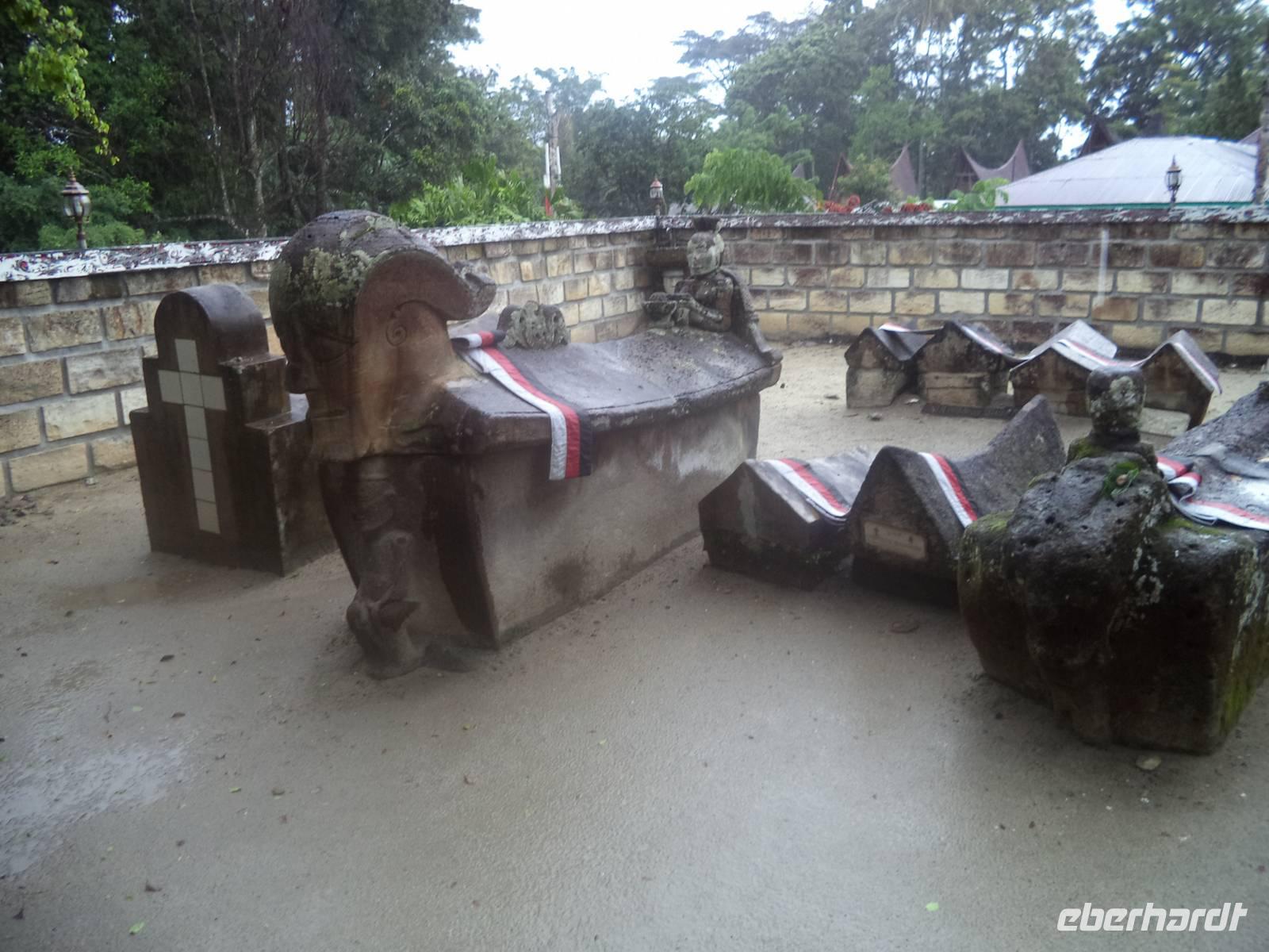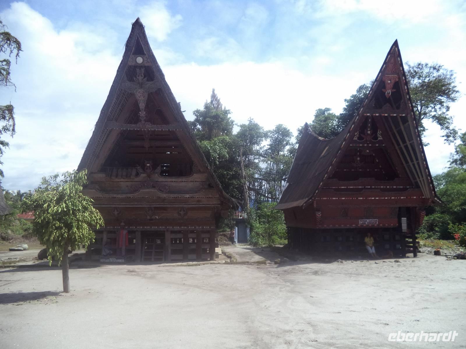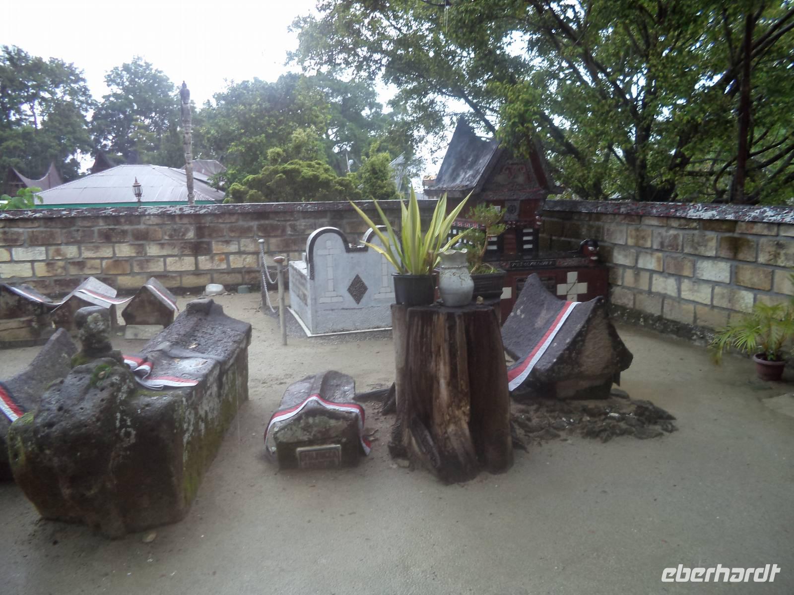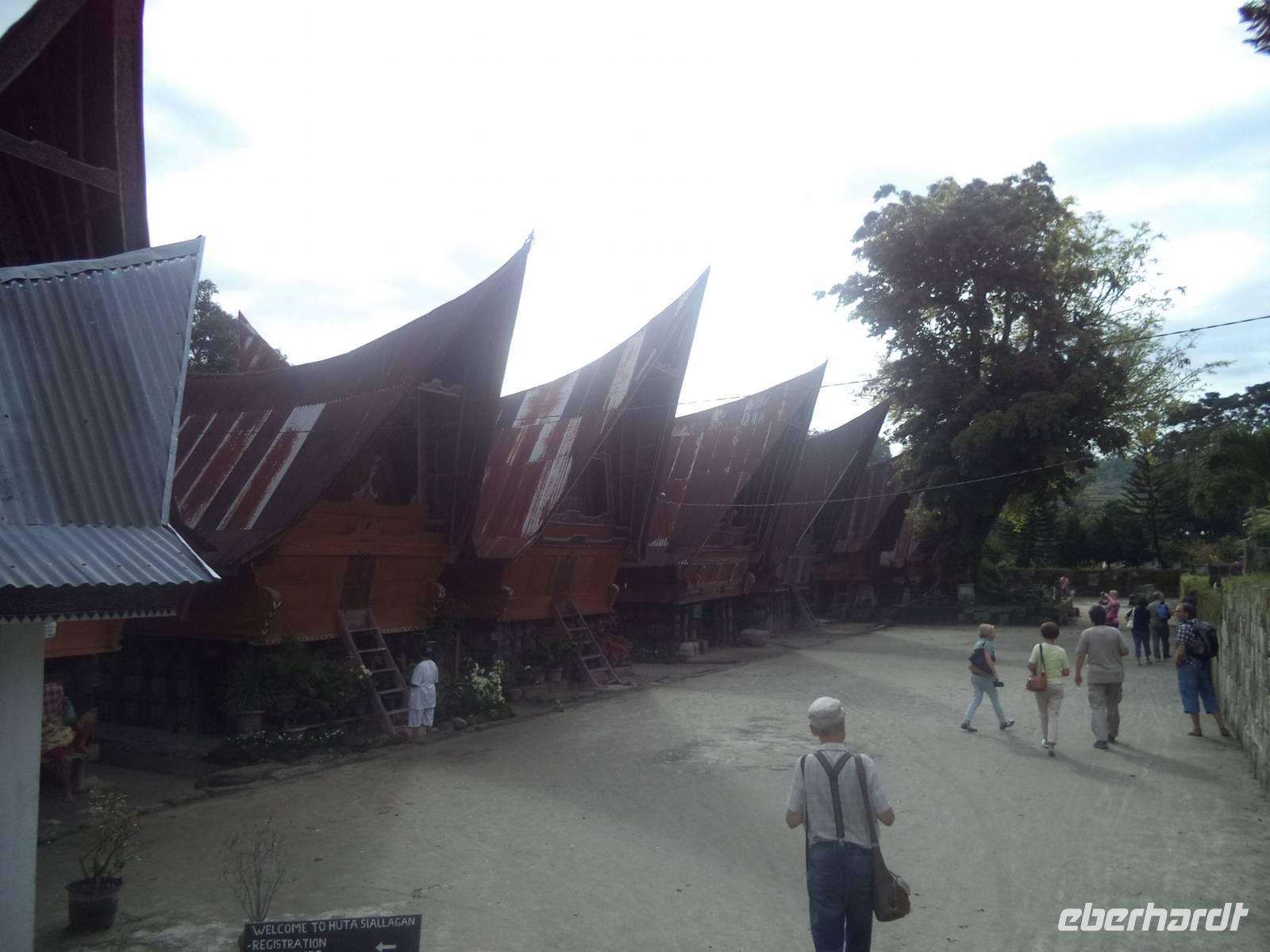 Unser Wasserfahrzeug brachte uns zunächst in den urwüchsigen Ort Ambarita mit seinem original erhaltenen Dorfkern ganz in der Art der Batak-Toba-Dörfer. Der bescheidene Königspalast ist umgeben von Häusern in traditioneller Bauweise auf Stelzen und beherbergt eine gut erhaltene Gerichts- und Ritualstelle der Batak. Alles im Dorf atmet noch komplett die alten Traditionen und Lebensweise, beginnend bei der Umfassungsmauer, die nur einen einzigen Durchschlupf hinein und einen hinaus bietet - die der Tradition folgend genauso hoch sein müssen, dass eine Frau mit Reissack auf dem Kopf und so breit, das ein Wasserbüffel hindurchpasst. Das Besondere an Ambarita sind die beiden original erhaltenen Kultstätten mit steinernen Möbeln: der Versammlungs- und Gerichtsplatz vor dem Königspalast und direkt an der Umfassungsmauer des Dorfes der Richtplatzt für rituelle Hinrichtungen. Mit ausführlichen Erklärungen zu Glauben und Rechtsgebaren der Batak Toba und Schilderung der Riten zum Erfassen und Beherrschen der magischen Kräfte potentiell böser Menschen gelang es uns ziemlich gut, die geschilderten Abläufe des Dorflebens vor noch nicht allzu langer Zeit vorzustellen.