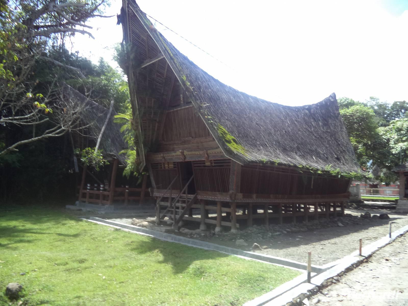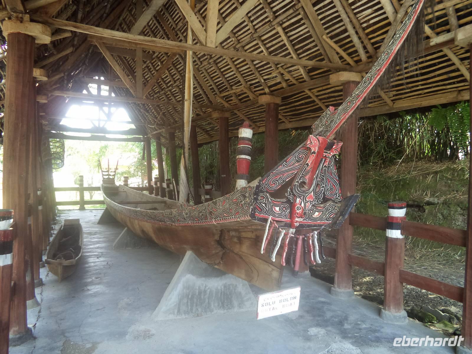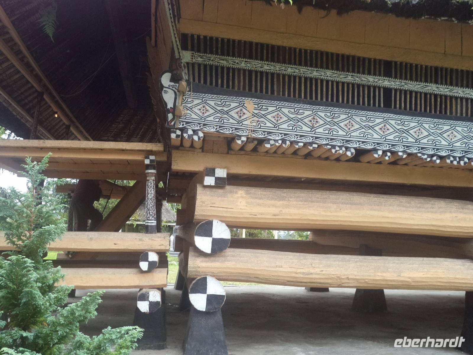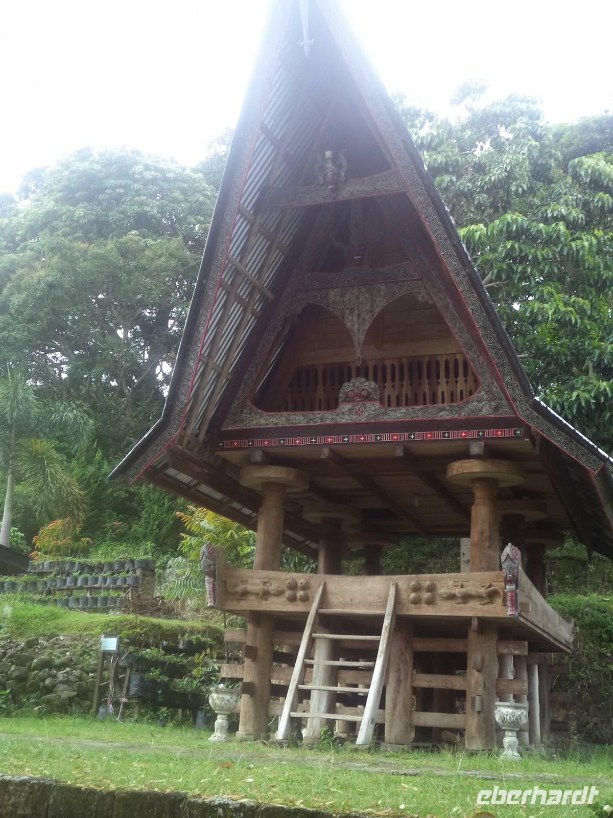 Unser Wasserfahrzeug brachte uns zunächst in den urwüchsigen Ort Ambarita mit seinem original erhaltenen Dorfkern ganz in der Art der Batak-Toba-Dörfer. Der bescheidene Königspalast ist umgeben von Häusern in traditioneller Bauweise auf Stelzen und beherbergt eine gut erhaltene Gerichts- und Ritualstelle der Batak. Alles im Dorf atmet noch komplett die alten Traditionen und Lebensweise, beginnend bei der Umfassungsmauer, die nur einen einzigen Durchschlupf hinein und einen hinaus bietet - die der Tradition folgend genauso hoch sein müssen, dass eine Frau mit Reissack auf dem Kopf und so breit, das ein Wasserbüffel hindurchpasst. Das Besondere an Ambarita sind die beiden original erhaltenen Kultstätten mit steinernen Möbeln: der Versammlungs- und Gerichtsplatz vor dem Königspalast und direkt an der Umfassungsmauer des Dorfes der Richtplatzt für rituelle Hinrichtungen. Mit ausführlichen Erklärungen zu Glauben und Rechtsgebaren der Batak Toba und Schilderung der Riten zum Erfassen und Beherrschen der magischen Kräfte potentiell böser Menschen gelang es uns ziemlich gut, die geschilderten Abläufe des Dorflebens vor noch nicht allzu langer Zeit vorzustellen.
