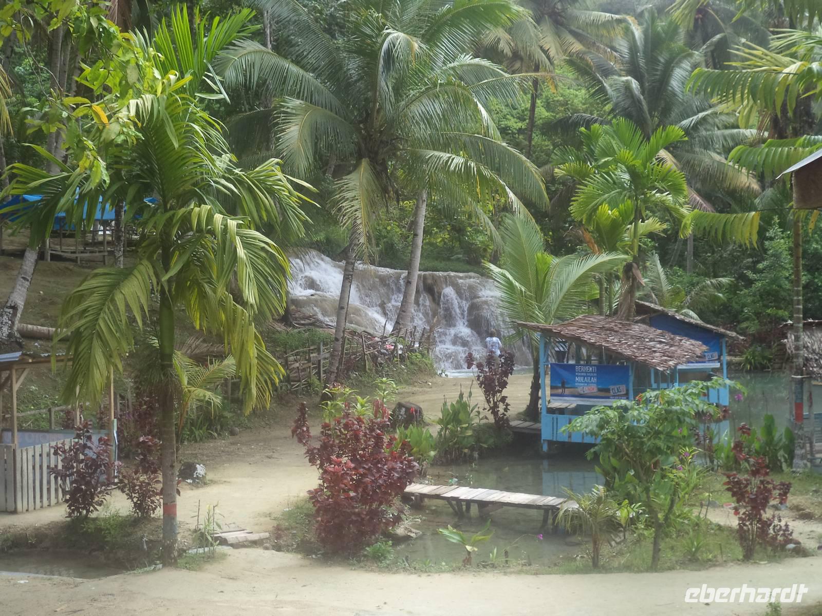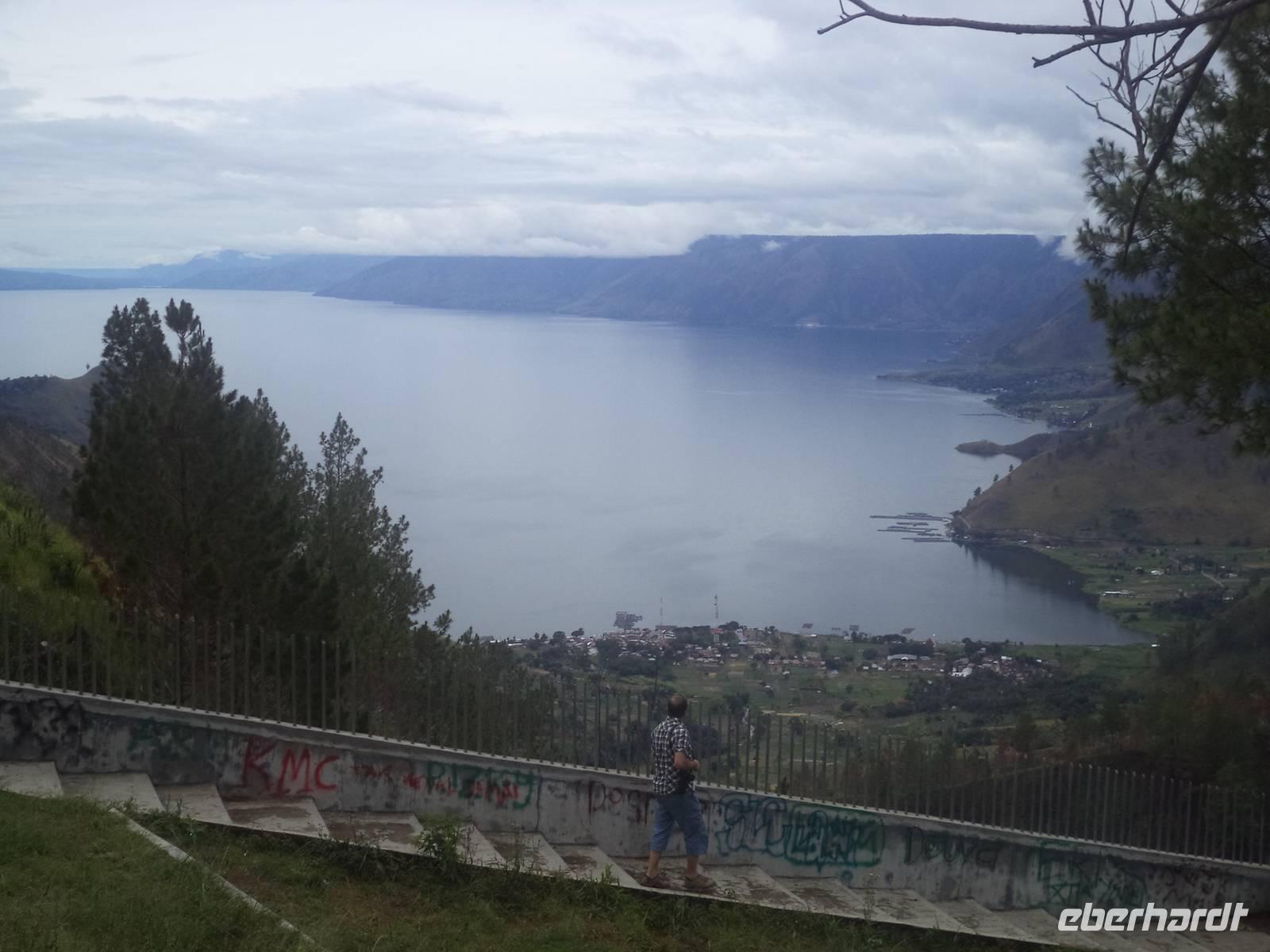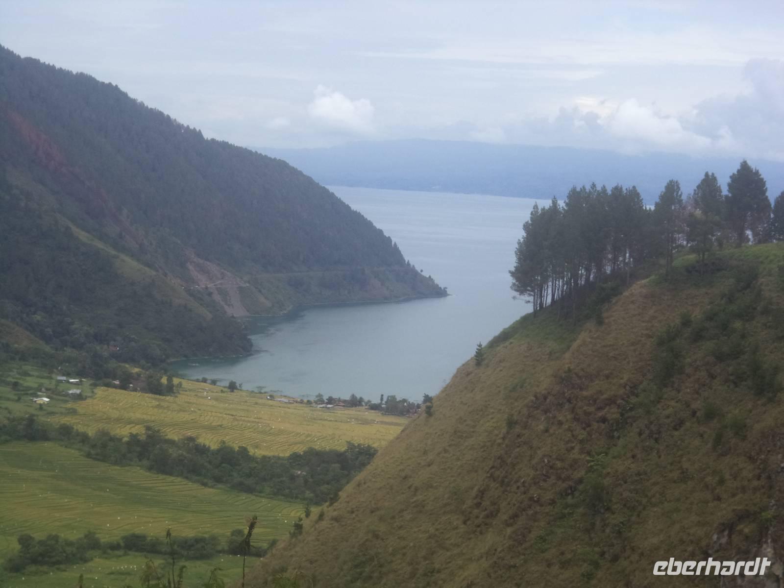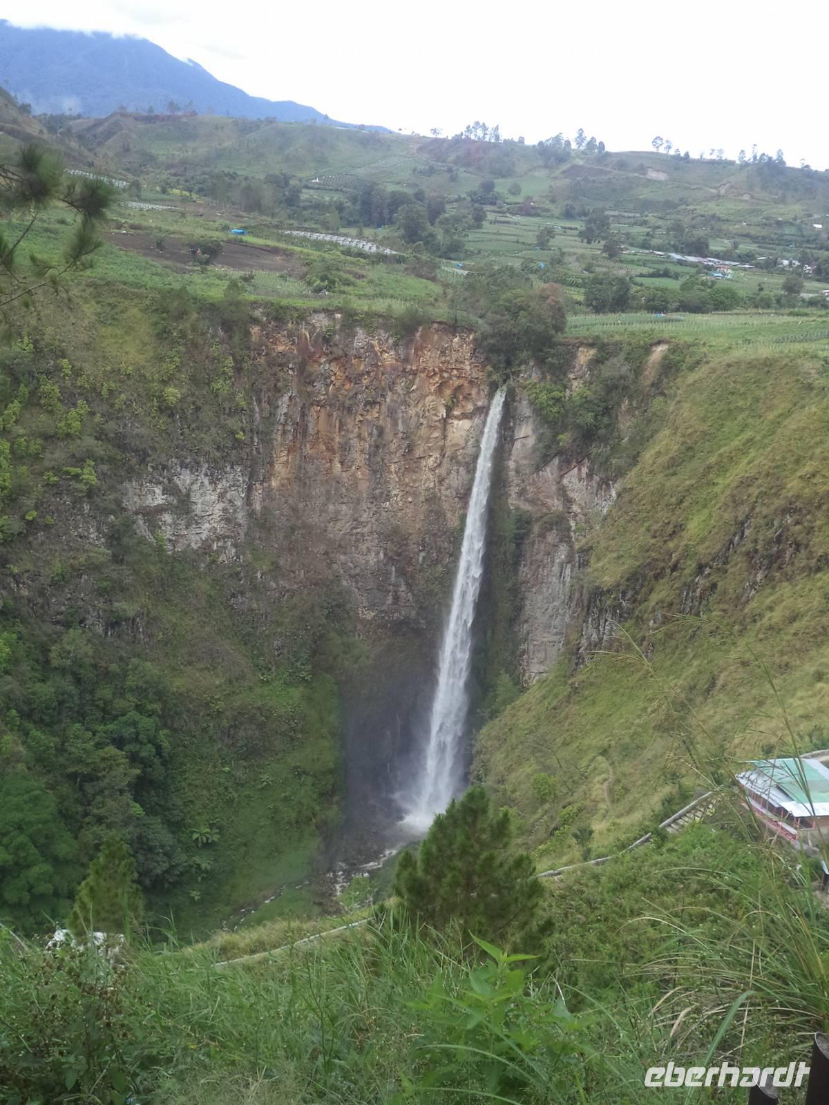 Etwas später hatten wir dann den ersten Blick auf den Tobasee. Natürlich gab es hier einen Fotostopp, denn neben der Aussicht auf den See hatten wir einen herrlichen Panoramablick zum über hundert Meter hohen Sipiso-Piso-Wasserfall.