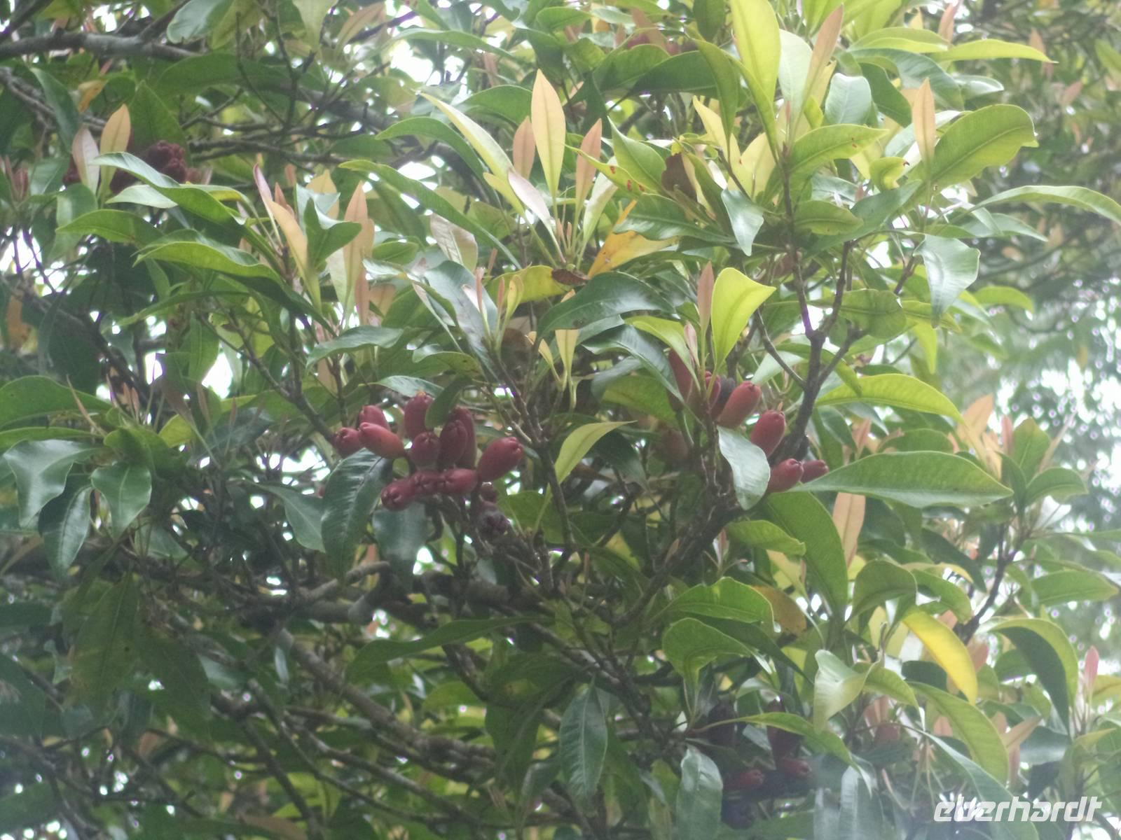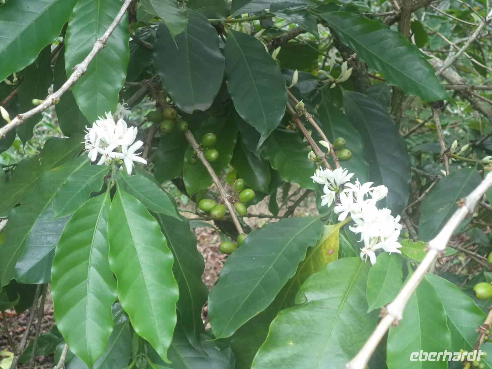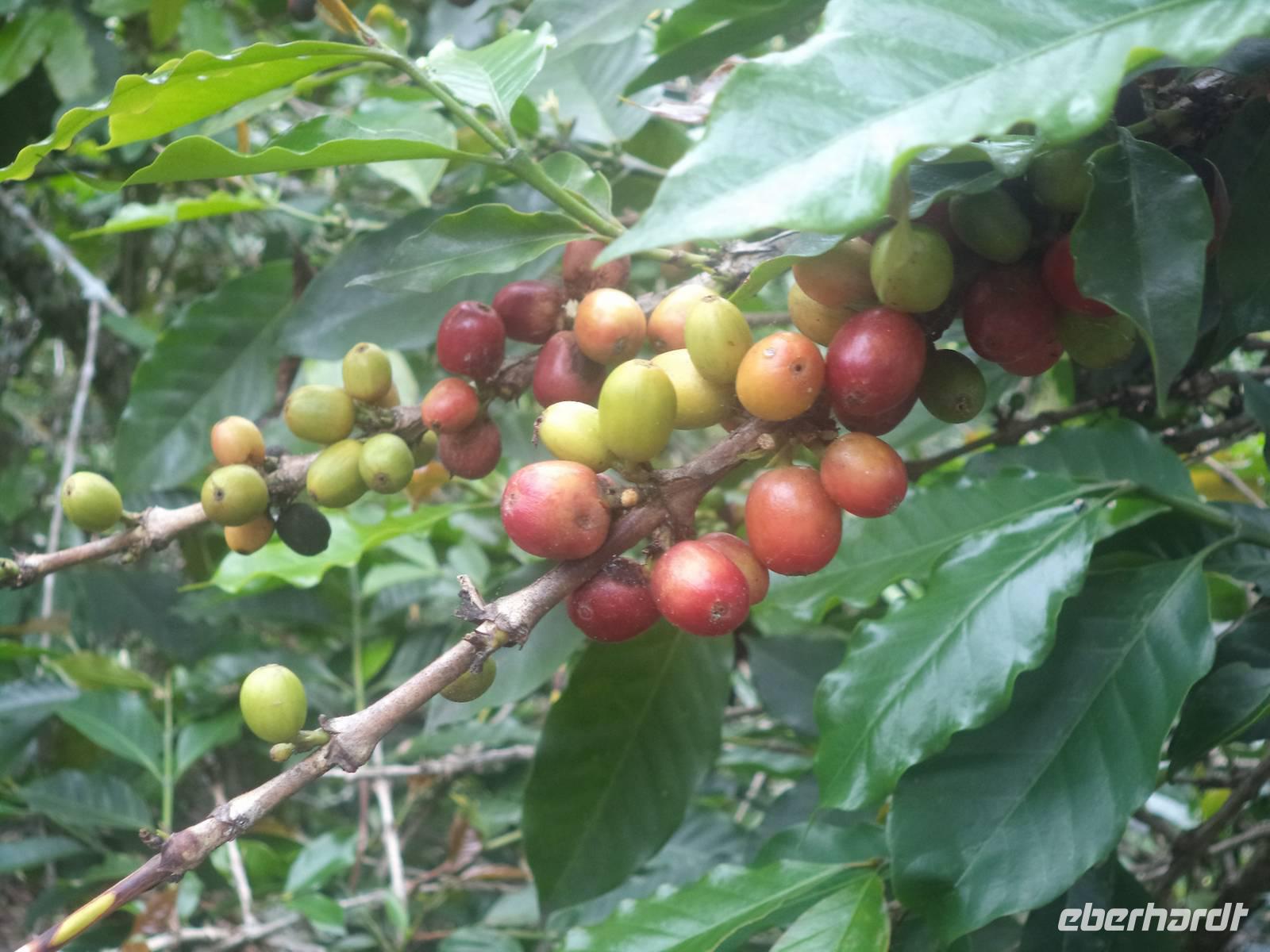 Unterwegs hielten wir danach für Fotos und Erklärungen an einer Stelle an, an der Linda uns einen Gewürznelken-Baum und Kaffeesträucher erläutern konnte. Viele von uns hatten bis dahin noch nicht gesehen, wie Gewürznelken am Baum und Kaffee an den Sträuchern reift. Hier hatten wir Gelegenheit zum Foto eines besonders üppigen Kaffeestrauches, an dem sowohl die hübschen weißen Blüten als auch grüne und unreife sowie auch reife, sattrote Kaffeekirschen hingen.