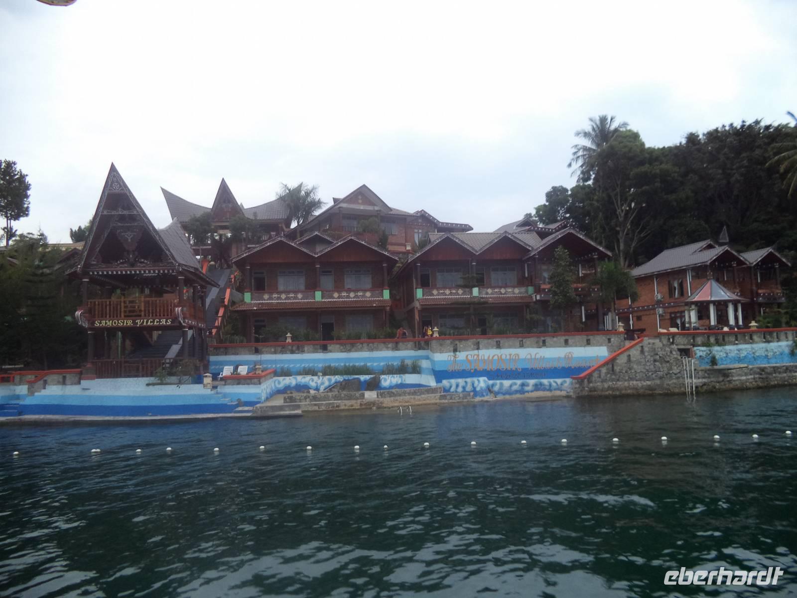Nachmittags waren wir dann im Städtchen Parapat angekommen, einem der Fährorte und Anleger für Fahrten über den Tobasee Parapat am Tobasee. Der Bus wurde entladen und der Fahrer und sein Helfer bereiteten sich darauf vor, uns erst am übernächsten Tag wiederzusehen, da der Bus mangels Transportmöglichkeit und wegen der engen Straßen dort nicht mit zur Insel Samosir durfte. Gepäckträger luden unsere Koffer auf das Boot und wir fuhren entspannt etwas mehr als eine Stunde über den See. Dann konnten wir direkt am Hotel „Samosir Villas" an Land gehen, das einen herrlichen Anblick bereits vom Wasser bietet. Das Hotel hat sein eigenes Ambiente und die herrlich geräumigen, schön eingerichteten Zimmer waren eine wirkliche positive Überraschung. Es blieb Freizeit - zum, Beispiel zur Entspannung an einem der beiden Pools oder auch einem Bad im Tobasee - bis wir uns zum Abendessen zusammenfanden, nach dem es noch mitreißende Live-Musik im Stil und mit Liedern der Batak und eine Tanzvorführung gab.