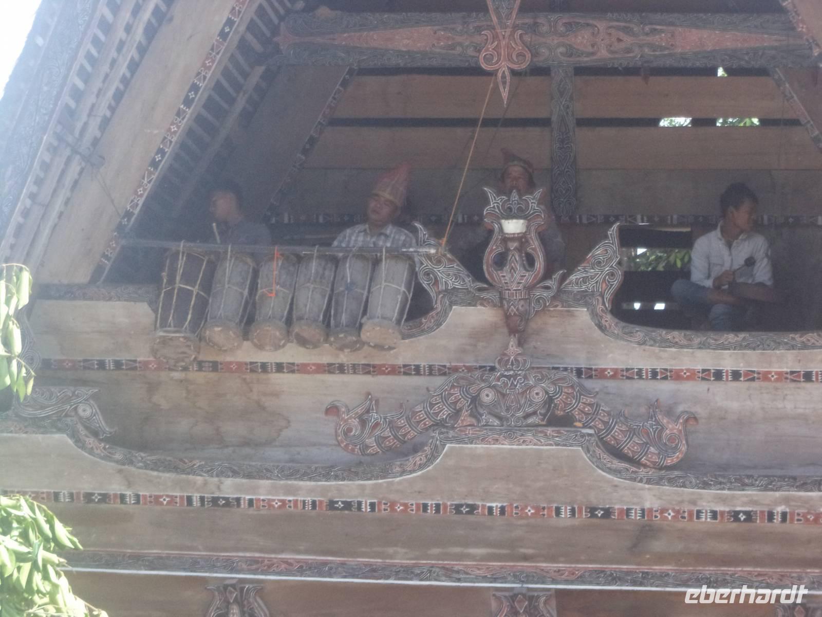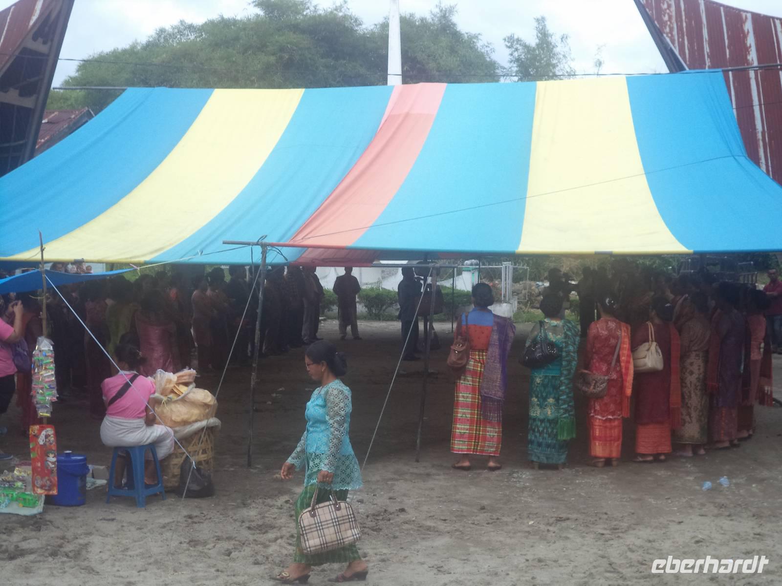 Danach brachte uns das Boot in das nächste traditionelle Batak-Toba Dorf: Simanindo. Auch hier gibt es im Dorfkern noch die traditionellen geschnitzten Pfahlhäuser, vor deren Kulisse eine kleine Vorführung der traditionellen Tänze der Batak stattfand, bei der die Fotografen ebenso auf ihre Kosten kamen wie bei der Szenerie aus den interessanten verzierten Häusern und Reisspeichern, dem kleinen Museum im Dorfhaus oder dem reichverzierten riesigen Einbaum. Reiseleiterin Linda überraschte uns dann mit dem Hinweis auf eine gerade stattfindende Hochzeit und schon nach wenigen Schritten trafen wir einen bunten Hochzeitszug, dem wir bis zu einem Gehöft folgen durften, wo schon hunderte Hochzeitsgäste warteten und bereits traditionelle Musik gespielt wurde. Wir konnten uns unter die Gäste mischen, ein paar Fotos machen und die ersten Tänze abwarten, bevor wir uns wieder unserem Programm zuwandten. Das sah noch den Besuch des Traditionsdorfes Tomok mit seinem Königsfriedhof vor, aber unterwegs setzte starker Regen ein, der uns unter das Dach des Bootes trieb. So ganz war er auch noch nicht abgeklungen, als wir durch das kleine Dorf Tomok zu den alten Königsgräbern marschierten. Hier erfuhren wir einiges über die Geschichte der Batak Toba, vor allem über deren am meisten verehrte Könige, die - von der Naturreligion kommend - später christlichen Glauben annahmen. Auf dem Rückweg zum Boot passierten wir wie auch schon in Ambarita Gassen voller Souvenirverkäufer. Hier in Ambarita und Tomok wurden neben Hemden, Taschen, für Touristen aufbereitete Schnitzereien und allerlei Tand auch recht originelle Souvenirs feilgeboten, z.B. Zauberstäbe zur Ausübung weißer und schwarzer Magie, Medizinmann-Bücher und die hier beliebten geschnitzten Batak-Häuser und rituelle Batak-Kalender. Der Regen hörte auch später erst langsam auf, während wir mit dem Boot in unser Hotel zurück kehrten und nach etwas Freizeit unser Abendessen einnahmen.