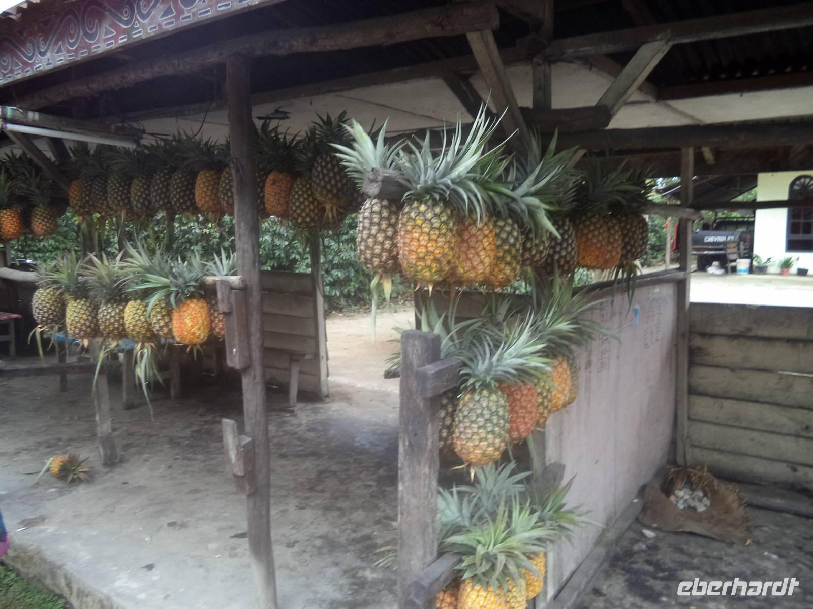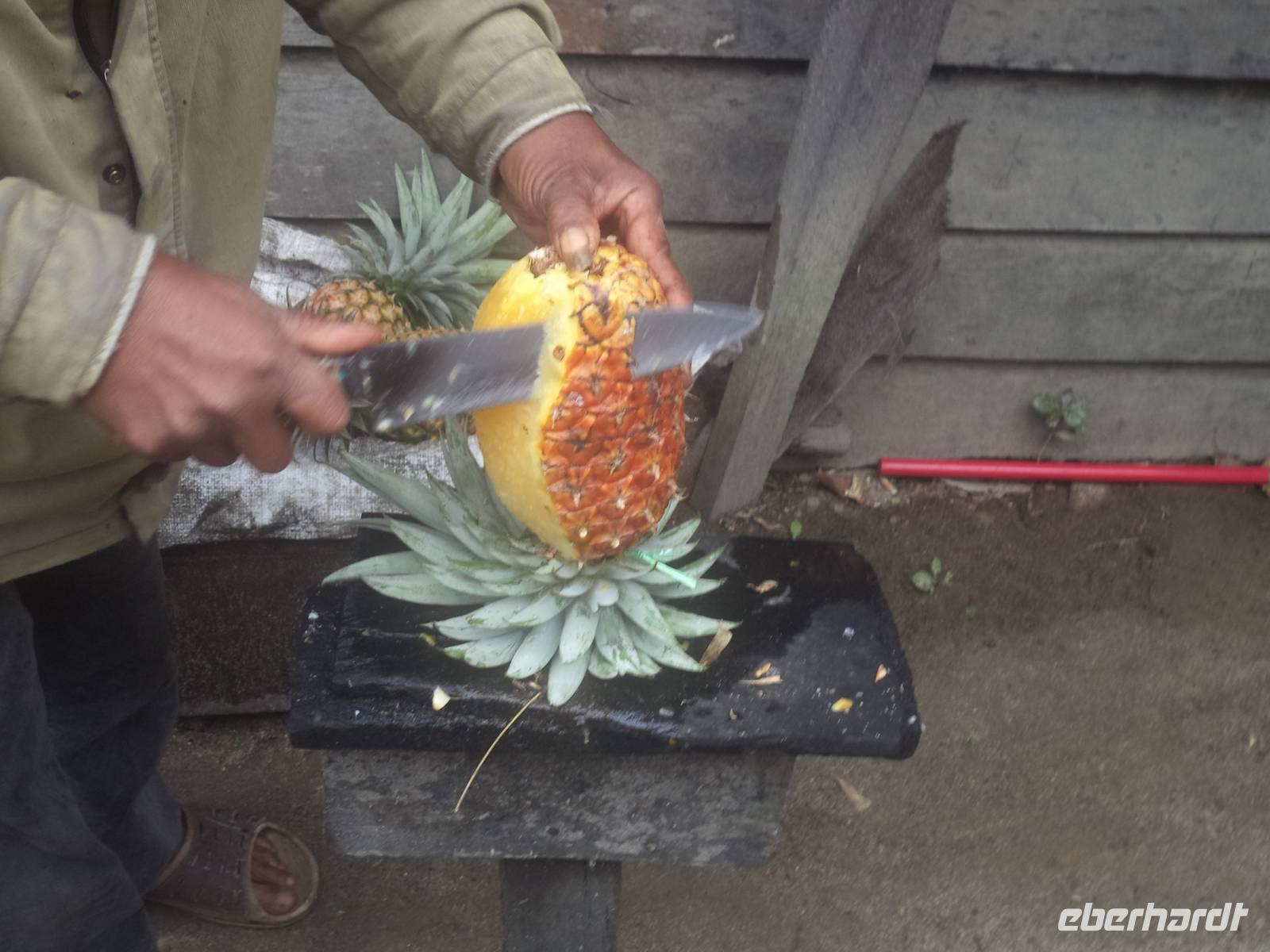 Nachdem unsere Koffer wieder auf das Boot verladen worden waren, kehrten wir zurück nach Parapat, wo uns die Busbesatzung empfing. Den weiteren Weg legten wir per Bus zurück und hielten schon bald an einer Ananasplantage. Es war interessant zu sehen, wie diese auch bei uns sehr beliebten Früchte wachsen und natürlich äußerst lecker, sie ganz frisch zu verkosten. Jeder musste zugeben, dass sie anders schmecken als zu Hause: frisch geerntet, von sachkundiger Hand geschält und zerteilt sind sie viel süßer und saftiger als man sie bei uns im Supermarkt kennt - und erst recht natürlich nicht vergleichbar mit Ananaskonserven.
