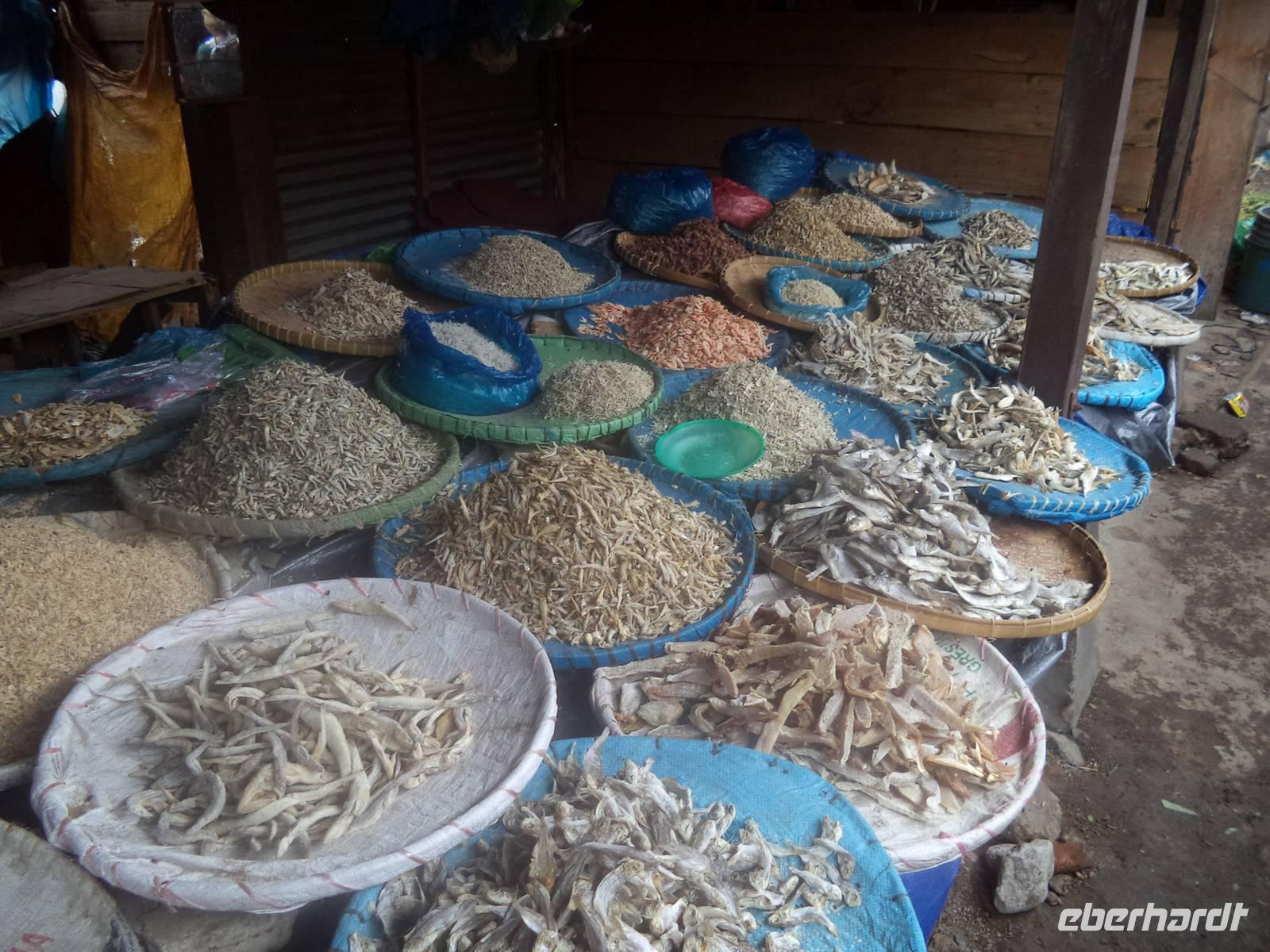 Noch mehr Verkostung gab es auf bzw. nach dem Traditionsmarkt von Balige, der mit seinem vielen Trockenfisch für ein Geruchserlebnis sorgte, aber auch für Erstaunen über die Vielfalt des Angebots, neben dem natürlich Obst und Gemüse nicht fehlen durften. Interessant war dann die Verkostung der merkwürdig aussehenden, oft herzförmigen Früchte der Salak-Palme. Besser bekannt als „Schlangenhautfrucht" wegen ihrer schuppigen Schale, sind die bittersüßen und nicht gerade saftigen Früchte in Indonesien sehre beliebt, aber nicht in jedem Fall treffen sie europäischen Geschmack.