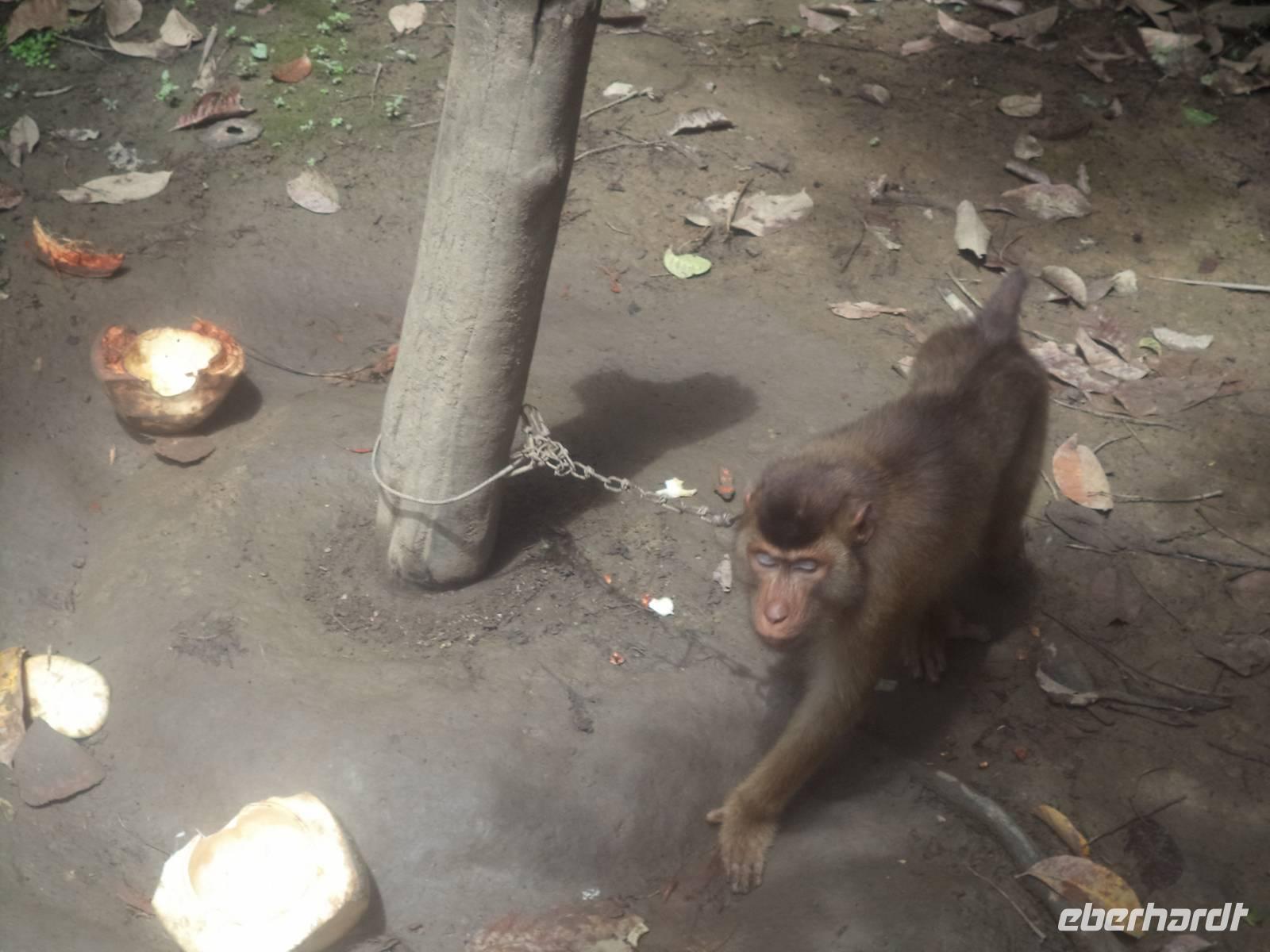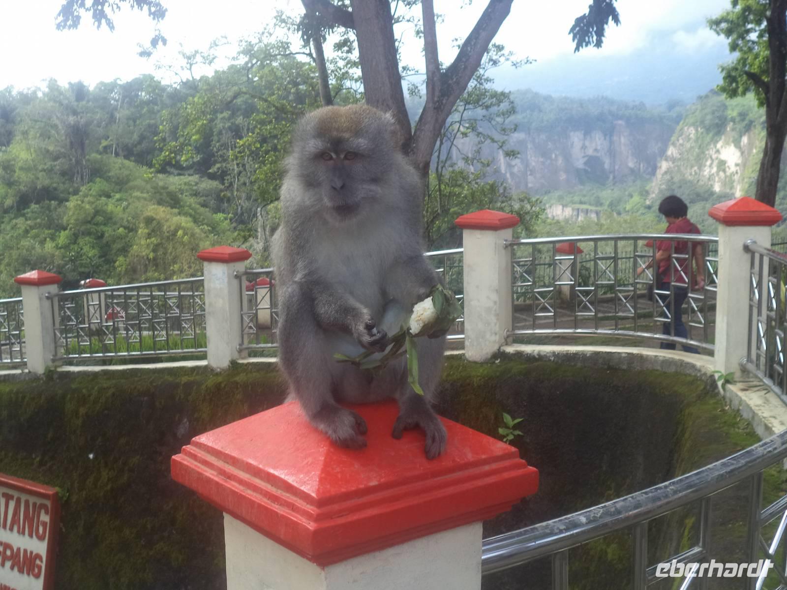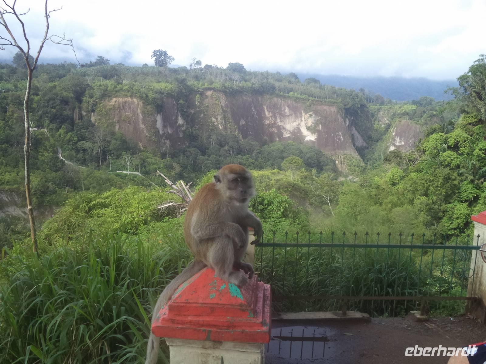 Heute hatten wir die längste Strecke in Sumatra vor uns, also hieß es: früh aufbrechen. Vormittags stand zunächst der Besuch in einem Gewürzgarten im Programm. Wir erfuhren „wie der Pfeffer wächst", wie Kardamom, Koriander oder die Bäume mit Muskatnüssen aussehen, wie unsere Küchengewürze wachsen und aufbereitet werden. In diesem Gewürzgarten wachsen auch Kokospalmen und zum Abschluss unseres Besuches erlebten wir eine kleine Vorführung, bei der ein abgerichteter Affe Kokosnüsse erntete. Natürlich konnten wir danach gleich von der Milch junger Kokosnüsse kosten, ebenso wie ganz frisches Kokosfleisch naschen, das mit braunem Palmzucker verfeinert worden war.