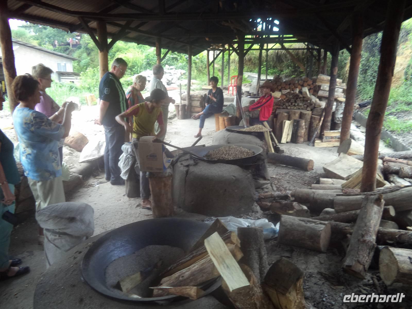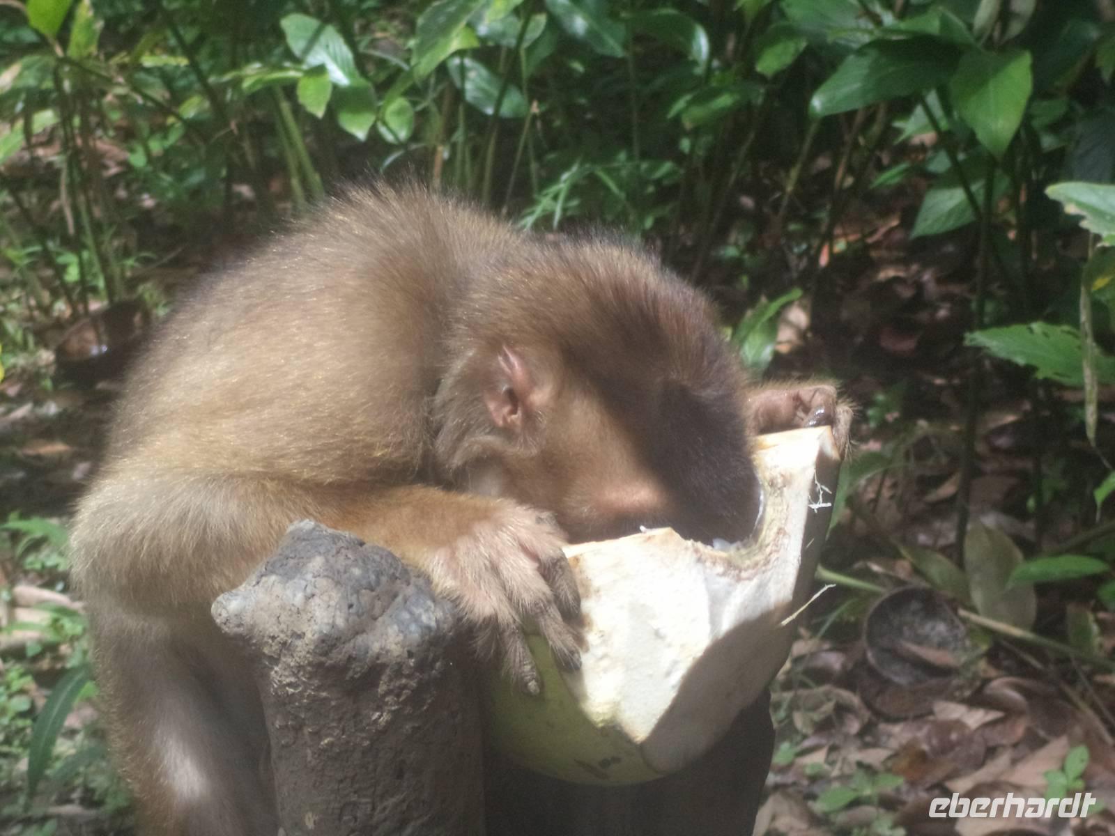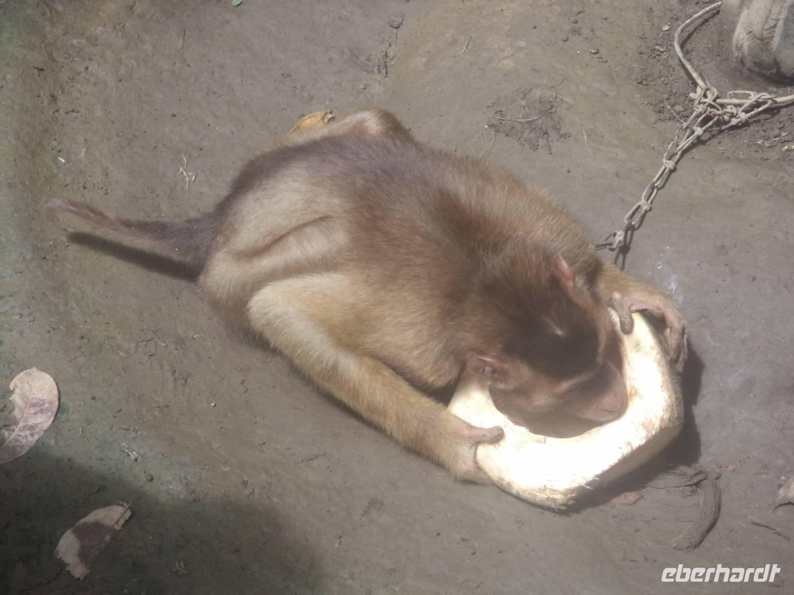 Heute hatten wir die längste Strecke in Sumatra vor uns, also hieß es: früh aufbrechen. Vormittags stand zunächst der Besuch in einem Gewürzgarten im Programm. Wir erfuhren „wie der Pfeffer wächst", wie Kardamom, Koriander oder die Bäume mit Muskatnüssen aussehen, wie unsere Küchengewürze wachsen und aufbereitet werden. In diesem Gewürzgarten wachsen auch Kokospalmen und zum Abschluss unseres Besuches erlebten wir eine kleine Vorführung, bei der ein abgerichteter Affe Kokosnüsse erntete. Natürlich konnten wir danach gleich von der Milch junger Kokosnüsse kosten, ebenso wie ganz frisches Kokosfleisch naschen, das mit braunem Palmzucker verfeinert worden war.