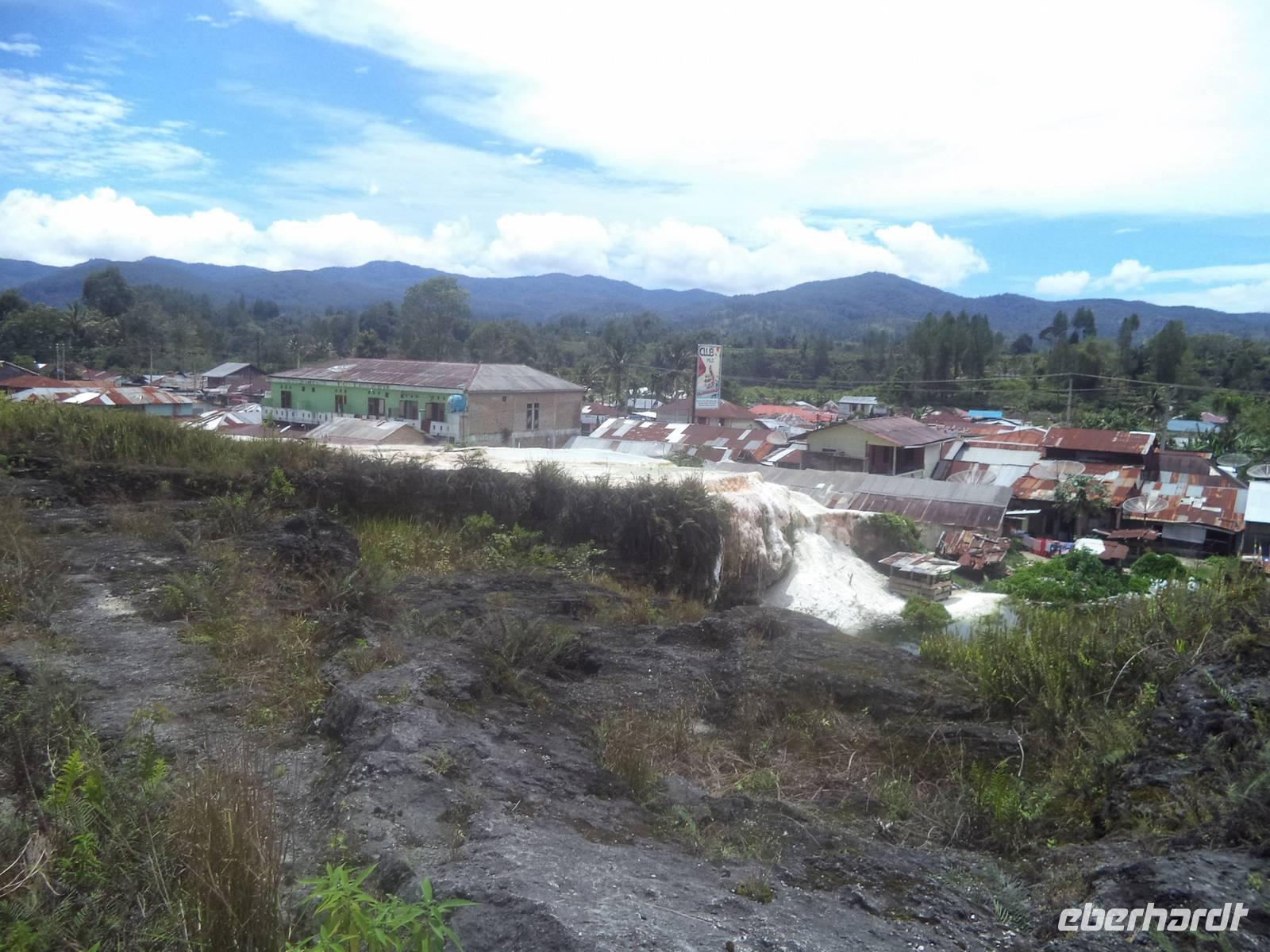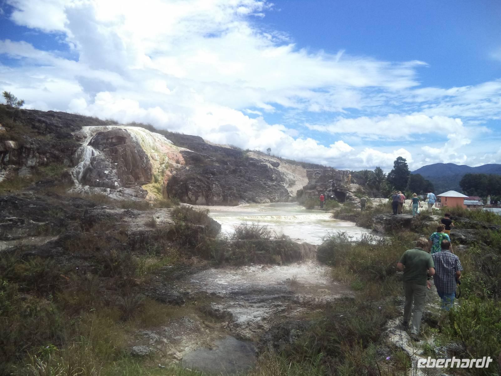 Eine kurze Mittagspause gab es in der Stadt Tarutung und danach noch einen Fotostopp am letzten Blick auf den Tobasee. Aussteigen und Hinwandern war noch einmal gefragt, als wir an den heißen Schwefelquellen von Sipoholon hielten. Qualmenden und nach Schwefel riechenden Rinnsale und flache weißgelbe Berge bezeichnen die vulkanischen Schwefelaufbrüche, an denen die Einheimischen Schwefelkalk abbauen.