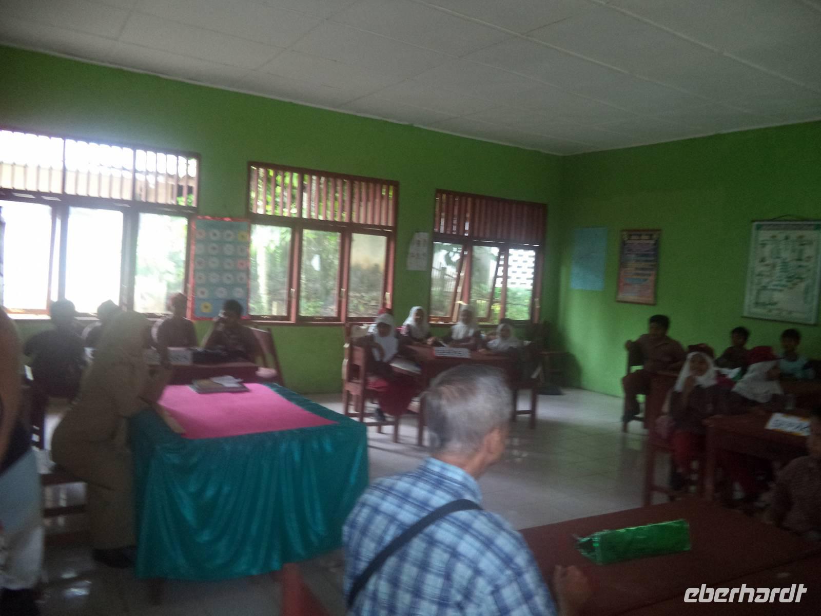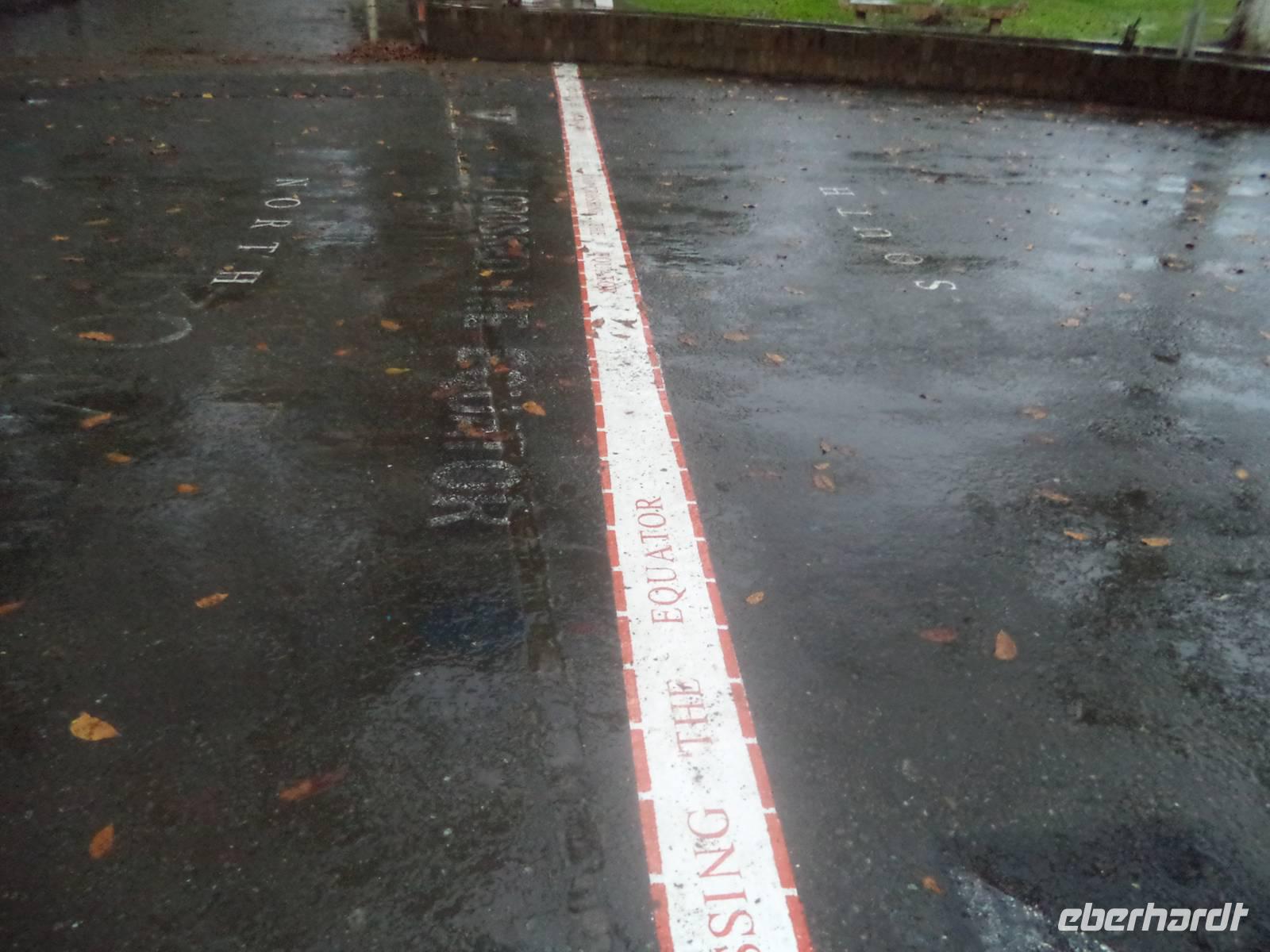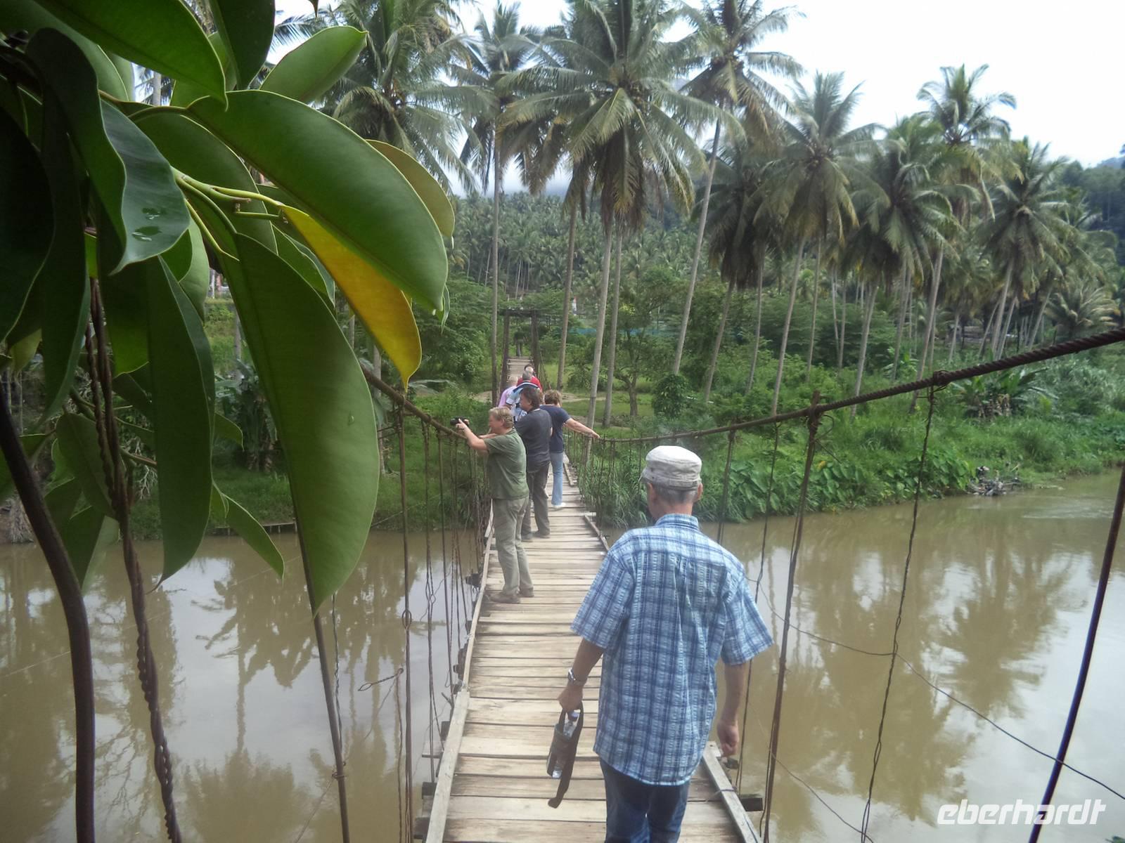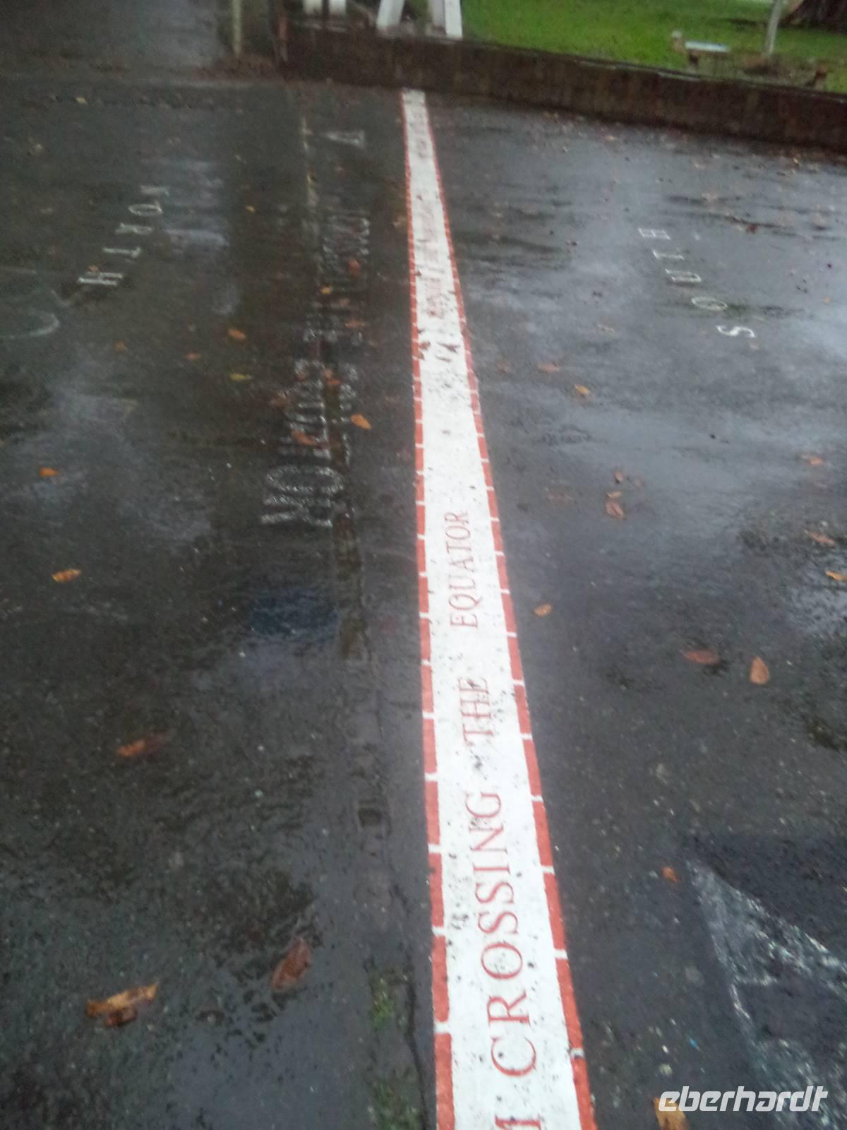 Später führte ein Spaziergang zum Aek Sijornih-Wasserfall über eine abenteuerliche Hängebrücke zum beginnenden Ausbau als Naherholungszentrum. Nach etwas Freizeit hier konnten wir gleich noch eine staatliche Schule besuchen. Wir begeisterten als „exotische" Besucher die Schüler (und brachten wohl deren Unterricht gehörig durcheinander), wurden aber von den Lehrerinnen sehr freundlich empfangen und von den Kinder emphatisch begrüßt, die uns sodann voller Inbrunst die indonesische Nationalhymne vorsangen. Ein weiterer Stopp in Rimbo Panti am Regenwald Resort führte uns bei strömendem Regen auf einem kleinen Spazierweg zu einer heißen Quelle und dann durch ein winziges Stück Dschungel. Der letzte große Höhepunkt erwartete uns dann jedoch - leider immer noch bei starkem Regen - in Bonjol. Kurz vor dem Dunkelwerden erreichten wir den Äquator, die gedachte Linie, die die Erde in eine Nord- und eine Südhalbkugel trennt. Knapp zwei Autostunden nördlich von unserem Tagesziel Bukit-Tinggi überschritten wir den Äquator von der Nord- in Richtung Südhalbkugel. Reiseleiterin Linda hatte für alle ein entsprechendes Zertifikat vorbereitet um das Ereignis zu dokumentieren - und sie hatte jungen Palmwein besorgt, um das Ereignis zu begießen. Zugegeben - er schmeckt durchaus gewöhnungsbedürftig - und das lag weder am Regen noch am Äquator.