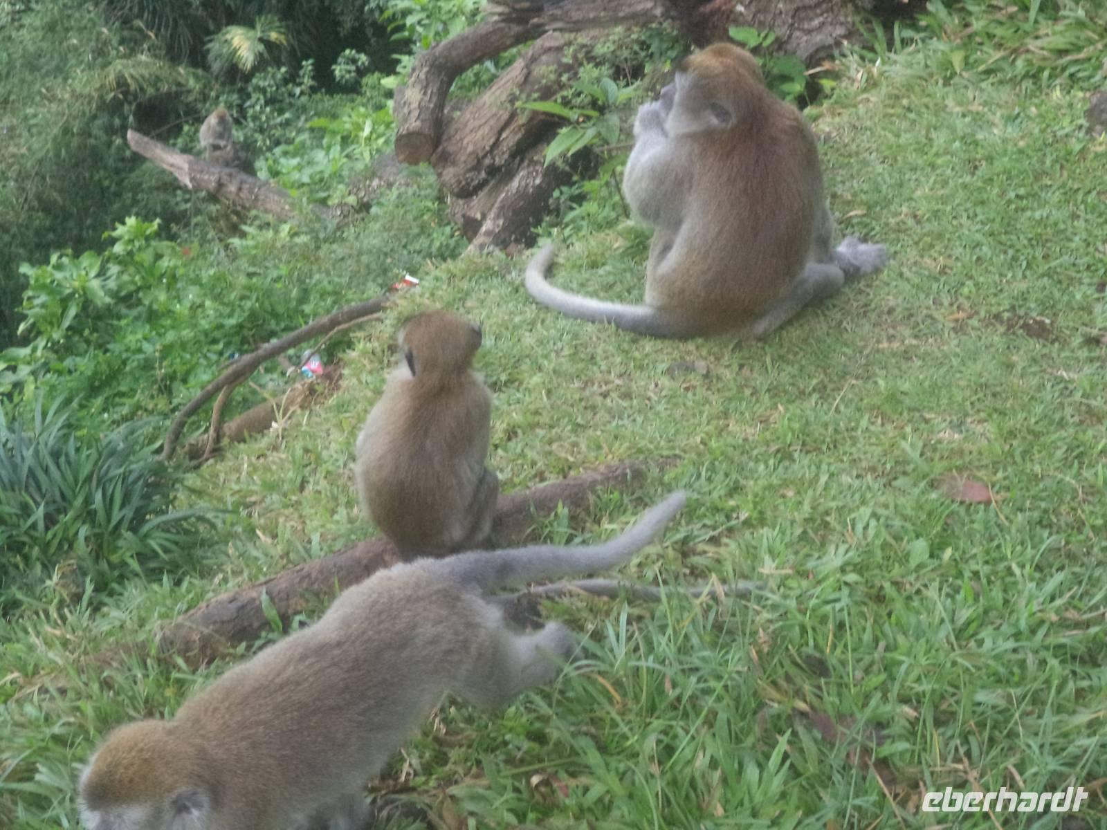 Mittags waren unser Ziel Bukit Lawang und unser Hotel Rindu Alam erreicht, inmitten des Gunung-Leuser Nationalparks gelegen. Das Hotel, der Umgebung entsprechend bequem aber einfach gestaltet ist der Ausgangspunkt für verschiedene Dschungelwanderungen in den Nationalpark, dessen 9000 km² ihn zu einem der größten Naturreservate Indonesiens machen. Bekannt ist er nicht nur für seine Sumatra-Tiger und die letzte große Population an Sumatra-Nashörnern, sondern vor allem für seine Affen. In Bukit Lawang, am Rande des Nationalparks, befindet sich das „Orang Utan Rehabilitation Center", wo seit 1973 - übrigens in Kooperation mit dem Frankfurter Zoo - Orang Utans ausgewildert werden, nachdem das Verbot, sie als Haustiere zu halten, sich langsam durchsetzt. Nach einer Mittagspause brachen die meisten von uns in Begleitung eines Nationalpark-Rangers auf, um im Dschungel die dem Menschen so ähnlichen Tiere zu beobachten. In Indonesien werden sie als enge Gefährten der Menschen Betrachtet: Orang heißt Mensch, utan Wald - also bedeutet der Name „Waldmensch". In diesem Jahr war uns das Glück hold - nach recht beschwerlicher Wanderung kam die Belohnung: mehrere Affen, von denen sich einige fast ohne Scheu näherten trafen auf unsere Gruppe und es gelangen viele gute Fotos. Völlig begeistert kehrten die Teilnehmer an der Wanderung zurück - verschwitzt, aber glücklich.