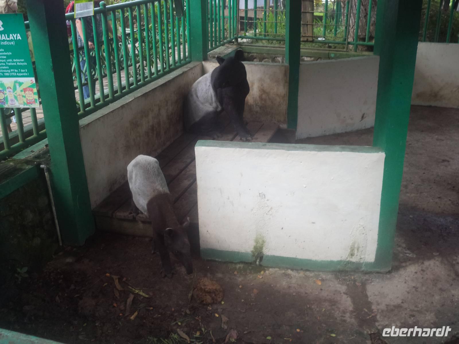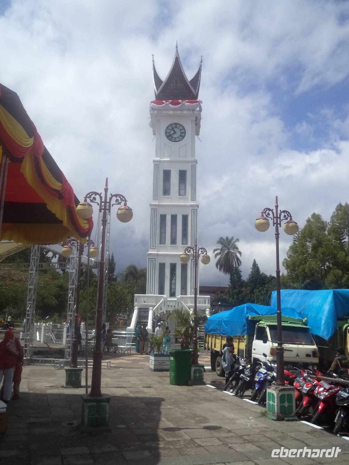 Die koloniale Vergangenheit des Ortes kann man noch in den Resten des Fort de Kock erkennen, das 1825 die Holländer am höchsten Punkt anlegten. Bis auf Mauerreste, Erdwerke und ein paar rostige Kanonen ist nicht mehr viel zu sehen von der einstigen Festung, denn sie hat sich in die Landschaft eingepasst. Bukittinggis kleinen Zoo mit einheimischen Tieren, Sumatra-Elefanten, Tapiren, Kragenbären, Sumatra-Tigern und zahlreichen Vögeln sowie gekrönt vom Nachbau eines traditionellen Hauses der Minangkabau konnten wir dann durchwandern, bevor wir mit dem Besuch des großen Marktes, der für seine Snacks und Knabbereien berühmt ist und einem kurzen Aufenthalt am Wahrzeichen der Stadt, dem von einem büffelhornförmigen Dach im Minangkabau-Stil gekrönten Uhrturm am Rande des Marktes unseren Aufenthalt hier beendeten.