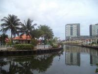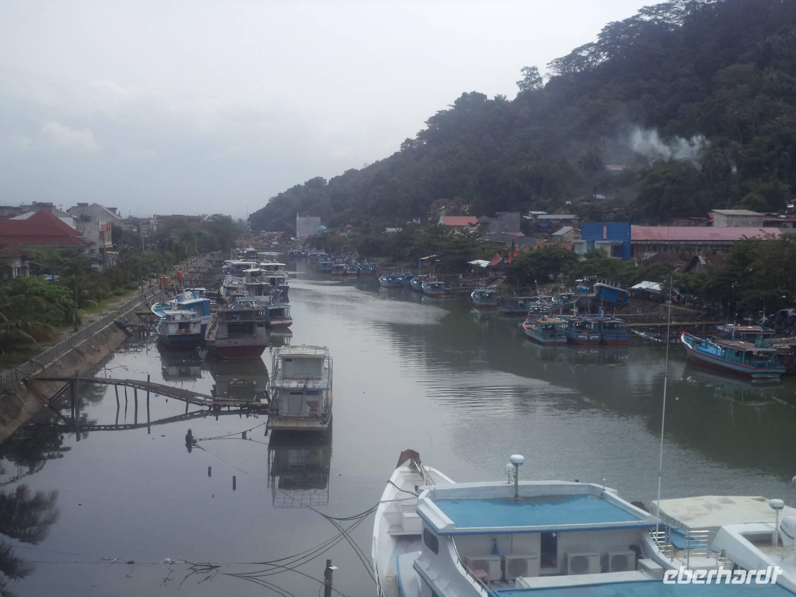 Morgens auf dem Weg zum Flughafen wart noch Zeit für einen kleinen Umweg zum Fischereihafen von Padang. Er bildet eine Art Vorstadt, gelegen an einem Fluss, von dem aus morgens die Fischerboote zum Fang auf den Indischen Ozean starten. Nach einem Fotostopp hier fuhren wir dann mittags zum Flughafen und verabschiedeten uns von Busfahrer, Busbegleiter und unserer Reiseleiterin Linda, die uns aber noch half, die Gruppe zum Inlandsflug nach Jakarta mit der indonesischen Fluggesellschaft „Garuda" einzuchecken. Unglücklicherweise hatte der Verspätung, so dass wir trotz eigentlich ausreichend geplantem Zeitfonds befürchten mussten, Gepäckabholung vom nationalen Flughafen von Jakarta und erneutes Einchecken im Internationalen Terminal nicht zu schaffen.