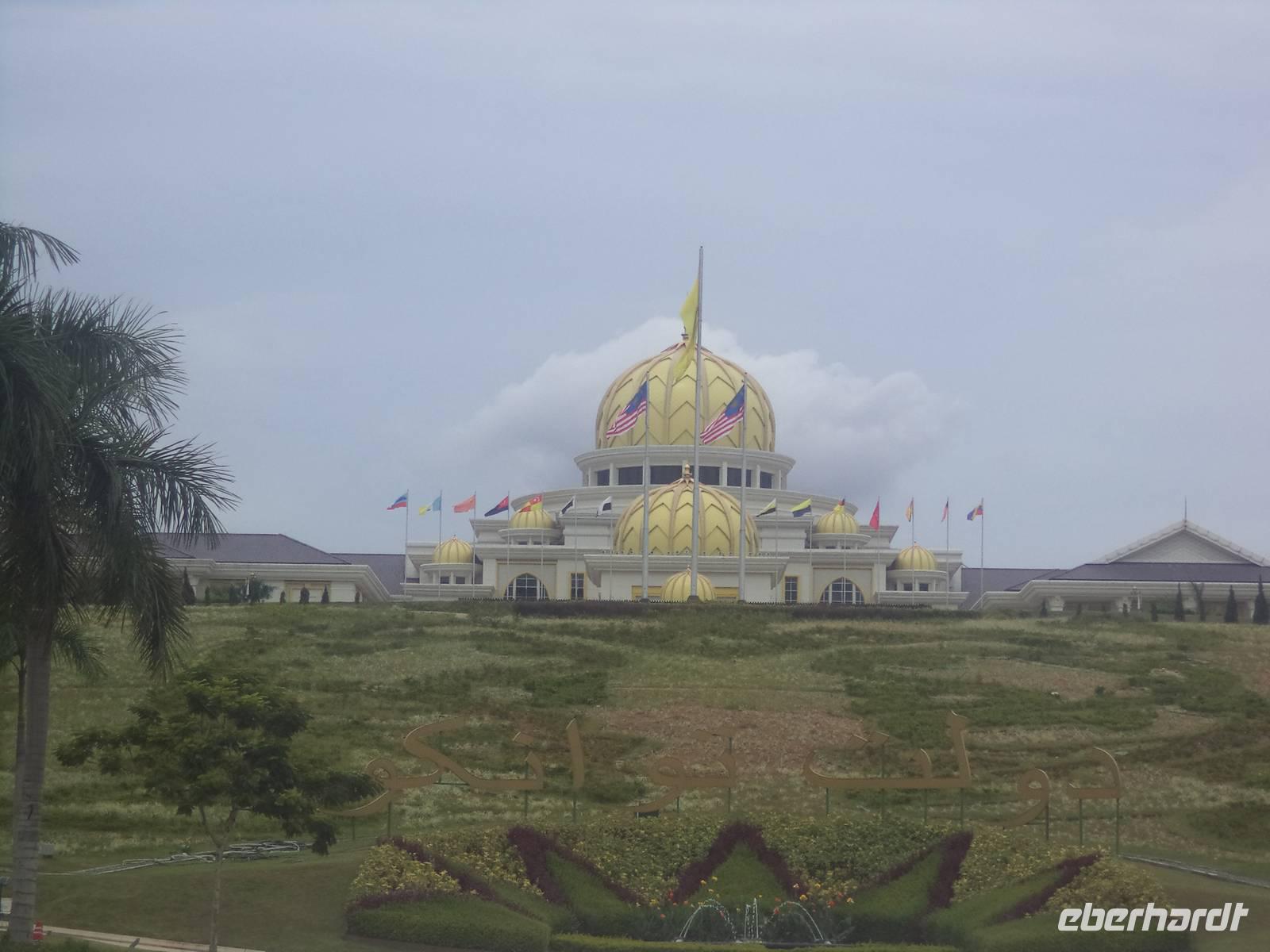 Heute erreichten wir zunächst die „Gartenstadt" Putrajaya. Die geballte Wirtschaftskraft des mitunter als „Tigerstaat" bezeichneten aufstrebenden Staates Malaysias dokumentiert sich hier als gigantisches und interessantes Projekt: erst 1995 gegründet, wird die Stadt planmäßig angelegt als neuer Regierungssitz unweit der überquellenden Hauptstadt Kuala Lumpur. Die Verkehrsanbindung, obwohl noch nicht perfekt, scheint recht gut zu funktionieren und mehr als hunderttausend Einwohner sind bereits in die moderne Stadt, bei deren Anlage neben gigantischen Hochhäusern trotz der Riesenhaftigkeit  immer wieder traditionelle Bauformen zugrunde liegen, umgezogen. Ihre Stadtlandschaft wird bestimmt durch künstlich angelegte Seen und ausgedehnte Grünflächen, dominiert von Prestige- Regierungs- und Wirtschaftsgebnäuden - meist Paradebeispiele zwar moderner, aber immer noch islamisch-malaysischen Architektur. Schon beherbergt das neue Verwaltungszentrum der Föderation von Malaysia viele Ministerien, den neuen Amtssitz des Königs (der „Istana Melawati" genannt wird) und zahlreiche Amts-, Verwaltungs- und Bankgebäude. Beherrschend aber sind das neue, gewaltige Konferenzzentrum, errichtet auf einem Hügel mit gutem Blick über Putrajaya und der Komplex des Premierministers: der „Perdana Putra" mit den Arbeitsräumen des Staatschefs und der „Seri Perdana", seine Residenz. Ein bedeutsames, elegant-erhabenes Gebäude, malerisch an einem See gelegen, ist Malaysias neue Zentral- Moschee. Putra Mosque hat Platz für etwa 15.000 Gläubige und zeigt mit ihrem 116 Meter hohem Minarett das zweithöchste Sakralbauwerk Südostasiens. Ín nur zwei Jahren ab 1997 wurde die Moschee errichte, die im Untergeschoss ihrer Seeterrasse einen großen Promenaden - und Erholungskomplex mit Snack-Restaurants und alkoholfreien Kaffee- und Erfrischungsbars beherbergt.