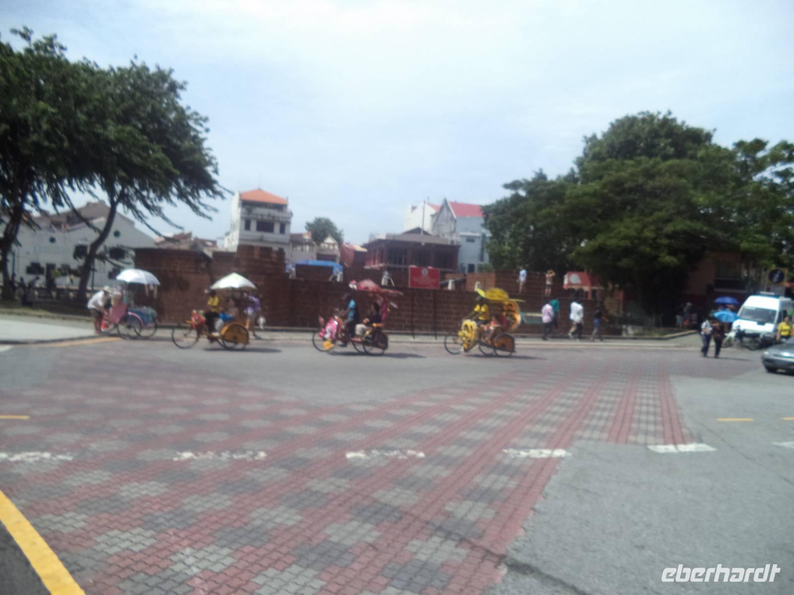 Später fuhren wir über die kilometerlange Autobrücke auf die Ferieninsel Penang, einst eine der drei bedeutenden „Strait Settlements" der britischen Kolonialzeit. Zunächst checkten wir hier ein ins Bayview Hotel, eines der größten in der Inselhauptstadt Georgetown, die wiederum zu den bedeutendsten touristischen Zentren Malaysias zählt. Am Nachmittag erwarteten uns Fahrrad-Rikschahs zu einer Rundfahrt, bei der wir die Stadt als ungewöhnliche Mischung kolonialer Vergangenheit, chinesischer und indischer Tradition sowie malaiischer Gegenwart erleben konnten. Mehrere Stopps zeigten uns die Brennpunkte der Geschichte sowie die touristischen Highlights der Stadt und der Insel: da war zunächst das flache alte holländische Artilleriefort Cornwallis, dessen Kanonen sich bis heute über die angeschrägten Mauern durch die Schießscharten der sternförmigen Kastell-Anlage recken und einst den Hafen beherrschten. Vom Fort führte uns der Weg zur „Chew Jetty", einer traditionellen Anlegestelle der chinesischen Fischer und Schiffsleichter in Form einer bebauten Landungsbrücke. Jeder bedeutende chinesische Familienclan hatte einst solch ein „Logistikzentrum", wie man es heute nennen würde, angelegt, um hier mit dem Aufstreben des Hafens mitzugehen und Arbeitsplätze als Transportarbeiter für die Familienangehörigen zu schaffen. Die Anleger für Entlade-Boote und Küstentransporter, von Häusern auf Pfählen umstanden und als Knüppeldämme und Bretterstraßen immer weiter auf See hinaus verlängert, sind bis heute als überaus malerisches Gewirr an Stegen und kleinen Landestellen erhalten. Immer noch prägen Boote, Transportarbeiter und dazwischen spielende Kinder und mit Essensbereitung oder Flickarbeiten beschäftigte Frauen das Bild  zwischen den weiterhin bewohnten Häusern, die inzwischen als Gesamtanlage zum UNESCO-Erbe gehören.
