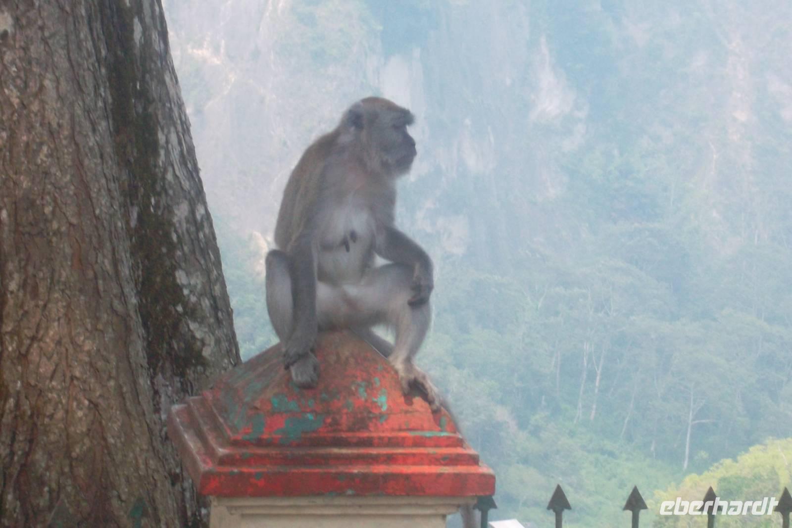 Aber wir hatten ein Tagesprogramm und so rissen wir uns endlich los vom bunten Spektakel und fuhren zu unserem ersten offiziellen Besichtigungspunkt. Ein Stück entfernt von „KL", wie Kuala Lumpur hier überall genannt wird, erreichten wir „geheiligten Boden" der Hindus. Zwar macht diese aus Indien stammende Religionsgemeinschaft in Malaysia nur wenige Prozent der Gläubigen aus, aber in ganz Asien bekannt sind die Hinduheiligtümer in den Batu-Höhlen nahe KL. Der gleich nebenan durch das Dorf fließende Batu-Fluß hat ihnen den Namen gegeben. Es handelt sich um ein verzweigtes Höhlensystem mit mächtigen Grotten, in die so manches europäische Kirchenschiff hineinpassen würde. Die hohen und oft mehrere hundert Meter tiefen natürlich entstandenen Gewölbe sind recht hell und werden oft effektvoll von Tageslicht beleuchtet. In dieses gewaltige Höhlensystem haben gläubige Hindus im Laufe von Jahrhunderten zahlreiche Schreine und Götterfiguren, Statuen von heiligen Reittieren der Götter und Dämonengestalten errichtet. Hier, so will es die Sage der geweihten Stätte, die jährlich von Millionen Pilgern besucht wird, hat der Gott Murugan den Sieg über den gefährlichen Dämon Soorapadam errungen. Murugan ist die Namensversion der tamilischen Hindus für Skan da, den kriegerischen Sohn des Zerstörergottes Shiva. Seine gewaltige 43 Meter hohe Statue bewacht seit 2006 den Treppenaufgang zu den Höhlen, seined vergoldete Gestalt beherrscht erhaben den ganzen Vorplatz. Wir hatten ein wenig Mühe hier, denn die Höhlen, die in der Mitte einer riesigen Kalkstein-Felswand liegen, sind nur über den Aufstieg einer breiten Treppe mit immerhin 272 steilen Stufen zu erreichen. Den Lohn für den anstrengenden Aufstieg erhält man sogleich: der Eindruck für den, der das Höhlensystem betritt, ist überwältigend. Einzigartig sind Raumwirkung und Farbenpracht dieses wichtigsten Heiligtums der Hindus in Malaysia. Die Batu-Höhlen stehen damit in einer Reihe mit Heiligtümern wie den Tempeln von Ellora oder dem Besakih-Muttertempel auf der indonesischen Insel Bali.