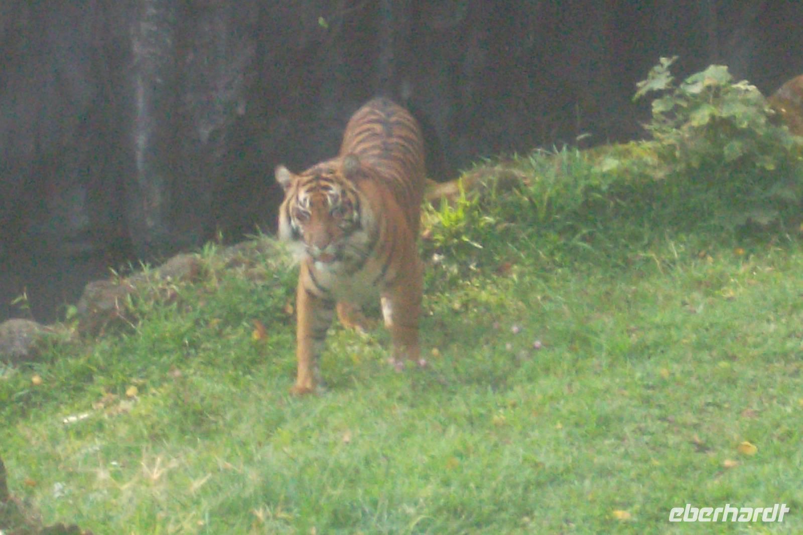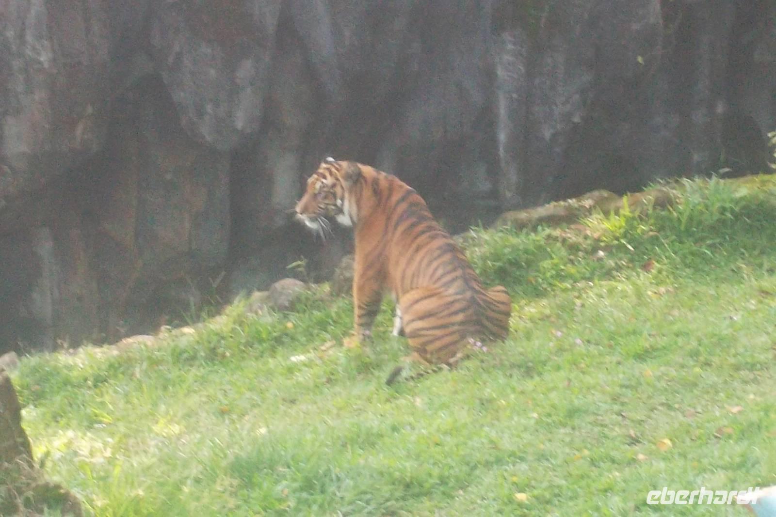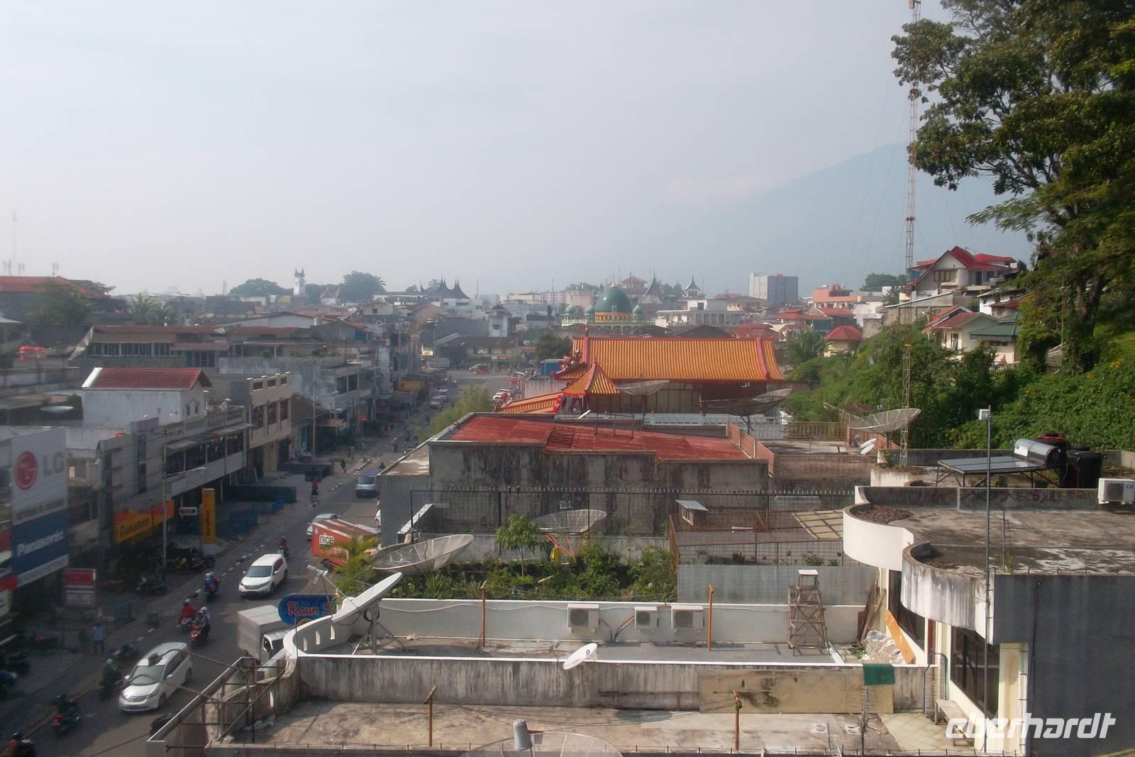 Bukittinggi, eine Stadt von der Größe Jenas, ist die Verwaltungshauptstadt des Landes der Minangkabau, das zu den touristisch interessantesten und bedeutendsten Gebieten in Sumatra gehört. Reste des Fort de Kock deuten auf die niederländisch-koloniale Vergangenheit des Ortes hin. 1825 hat der namengebende holländische Admiral auf dem höchsten Punkt über der Stadt die Wehranlage anlegen lassen, deren Umrisse, Mauerreste, Erdwerke und rostige Kanonen bis heute zu erkennen sind. Erstaunlich gut hat sich die einstige Festung in die Landschaft eingepasst. Nach Überqueren eines Tals auf einer langen Brücke mit guter Sicht auf alle Teile der Stadt Bukittinggi sahen wir deren kleinen Zoo mit einheimischen Tieren, zu denen neben Sumatra-Elefanten und Tapiren auch zwei Sumatra-Tiger und zahlreiche Vögel gehören. Im Zentrum des Erholungs- Zoo- und Mesumskomplexes steht der reichgeschmückte Nachbau eines traditionellen Hauses der Minangkabau. Hier hatten wir etwas Freizeit zum ausgiebigeren Besuch des Zoos oder des Museums im Palast-Nachbau, bevor wir den großen Markt besuchten, der für seine Snacks und Knabbereien und seine getrockneten Fisch-Spezialitäten berühmt ist. Nach einem kurzen Aufenthalt am Uhrturm, dem Wahrzeichen der Stadt, das von einem büffelhornförmigen Dach im Minangkabau-Stil gekrönt wird, fuhren wir zu einer weiteren Sehenswürdigkeit. Am Rande von Bulkittinggi liegt der urwüchsige Ngarai-Sianok-Canyon. An einige Stellen hat man herrliche Aussichten in die gewaltige Schlucht, in deren stadtseitiges Ende im zweiten Weltkrieg von den japanischen Besatzern eine gewaltige Tunnelanlage eingebaut wurde. Wir hielten uns hier noch etwas auf, fotografierten die Schlucht und die zahlreichen Affen und kauften die letzten Souvenirs an den zahlreichen Ständen.