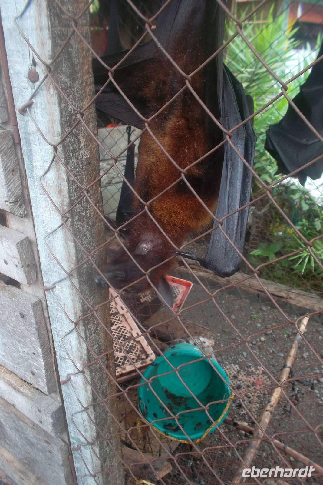 Die Streckenführung im zerklüfteten, überwiegend mit undurchdringlichem Regenwald bedeckten und von nur wenigen Straßen durchzogenen Sumatra ist recht kompliziert. An vielen Stellen und zwischen einigen Orten gibt es nur eine einzige Straße, die für Busse nutzbar ist, was mitunter ein logistisches Problem darstellt, denn trotz nicht übermäßig großer Entfernung kommt man nur langsam vorwärts. So mussten wir heute zunächst fast bis Medan zurückfahren und dann und dann weiter südlich ins Land des großen Volkes der Batak, dessen Stammesvielfalt wir noch kennenlernen sollten. Nach Gelegenheit zum Mittagessen in einer Art Vergnügungspark an der Straße legten wir einen Fotostopp ein an einer Straßen-Raststätte, wo es lebende Flughunde zu sehen gab. Leider konnten wir die sonst überall in den Regenwäldern Sumatras vorkommenden Fledertiere nur im Käfig sehen. Ihren Namen haben die Pflanzenfresser von ihrem hundeähnlichen Kopf. Sie sind völlig ungefährlich, inzwischen aber stark vom Aussterben bedroht, da sie mancherorts wegen ihres Fleisches gejagt werden, das als Delikatesse und Heilmittel gilt.