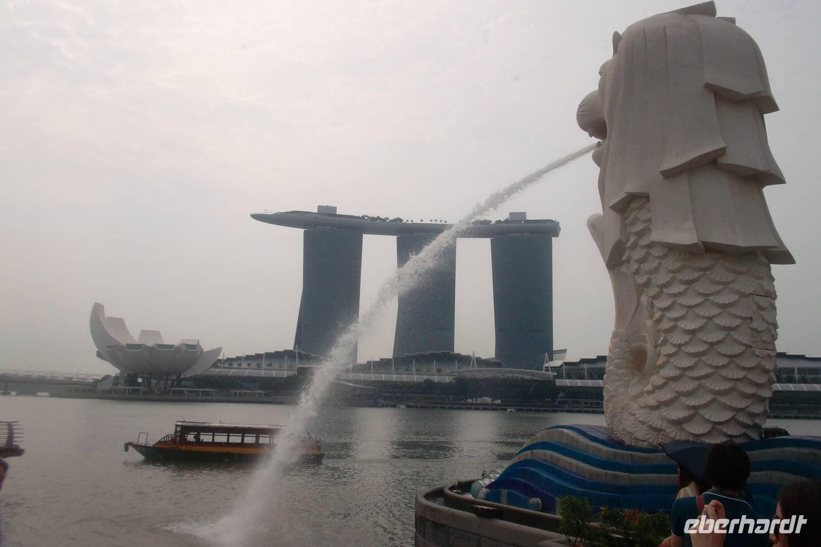 Die ganze Nacht und ein Teil des darauffolgenden Tages verbrauchte dieser Flug - denn neben der Flugzeit gab es noch eine sechsstündige Zeitverschiebung - so viele Stunden ist Singapur gegenüber Deutschland voraus. Also erreichten wir unser erstes Ziel erst am Nachmittag des zweiten Reisetages. Gemeinsam füllten wir die Einreisekarten für Asiens kleinsten Staat aus -traditionell ist das nur in Englisch oder Chinesisch möglich, und wir wählten die vertrautere englische Variante.... Rasch passierten wir danach die Grenzkontrollen passiert und kümmerten uns um unser Gepäck, während wir schon vom örtlichen Reiseleiter Ishak erwartet wurden. Der einheimische Reiseleiter malaiischer Herkunft, mit dem ich schon im Vorjahr zusammengearbeitet hatte, begrüßte uns auf das Herzlichste und nach dem obligatorischen Geldtausch beim „money Changer" begleitete er uns zum Bus. In Südostasiens einzigem Stadtstaat ist es immer schwülwarm - so empfing uns Singapur denn auch mit einer Wärmewelle, als wir die Hallen des klimatisierten Flughafens Changi verließen. Es ging mit dem Bus zum Hotel, wobei Herr Ishak uns schon einiges über seine Heimatstadt erzählte und die Strecke und die vorbeirasenden Besonderheiten kommentierte. Da unser schönes und modernes Hotel nicht weit vom Singapur-Fluß entfernt lag, haben wir gleich für den ersten Abend ein Highlight im Sinne der Eberhardt „Richtig Reisen!" Philosophie eingebaut: bei einer Bootsfahrt auf dem Fluss, beginnend in der Dämmerung und fortgesetzt mit immer prächtigerer Illumination konnten wir die unglaubliche Metropole von ihrer „Nachtseite" erleben. So verließen wir nach kurzem Frischmachen unser Hotel wieder und spazierten zum Singapur-Fluss um beim idyllischen Dahingleiten auf dem Fluss, das erleuchtete Zentrum Singapurs vom Wasser aus zu erleben und dabei die Dinge zu entdecken, die wir morgen „bei Licht" besehen würden: den alten Stadthafen, Singapurs Wahrzeichen, den Löwen-Fisch „Merlion", das alte Kolonialviertel und die Chinesenstadt, sowie natürlich vor allem das hocvh aufragende neue Singapur mit seinen riesigen Bank- und Hotelgebäude. Hell erleuchtet zeichnete sich diee Skyine von Singapur vor dem dunbklen Himmel ab, besonders hervorgehoben das neue Luxushotel „Marina Sands" mit seinem unverwechselbaren dreitürmigen Aufbau. Bei einer meiner Reisen - der exklusiven Asien-Städtereise Dubai - Bangkok - Singapur - wird sich die Gelegenheit bieten, hier in diesem Nobelhotel zu wohnen und das mit 191 m höchstgelegene Swimmingpool der Welt und den größten freischwebenden Aussichtspunkt zu nutzen.