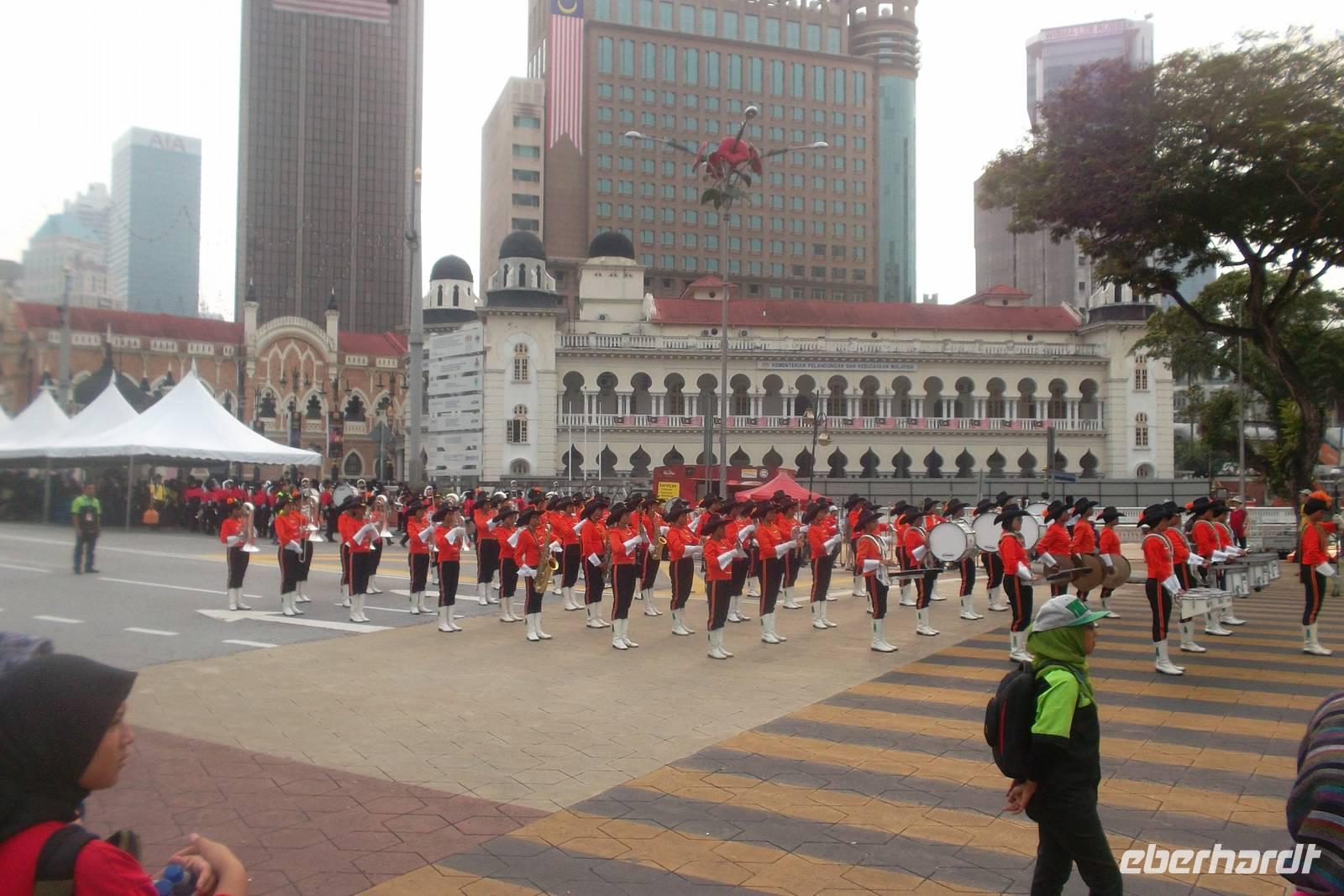 Heute war ein besonderer Tag in Malaysia - einer der beiden Nationalfeiertage! Während die Unabhängigkeit, die Malaysia 1957 erlangte, am 31. August gefeiert wird, jährt sich am 16. September die 1963 erfolgte Bildung der Konföderation von Malaysia, die damals noch Singapur mit einschloss. 1965 bekam Malaysia - nach dem Austritt Singapurs - seine heutige „Form". Aus Anlass dieses Feiertages gibt es stets eine Reihe von Aktivitäten - und wir konnten auch etwas davon abbekommen, als wir nämlich zu Beginn unseres Tagesprogrammes am Unabhängigkeitsplatz hielten. Hier gab es einen Wettbewerb von Traditionskapellen und Fanfarenzügen, den wir während eines langen, ausgedehnten Fotostopps aus nächster Nähe verfolgen konnten. Die buntkostümierten bzw. farbenfroh uniformierten Kapellen, die an einer kleinen zentralen Tribüne vorbeimarschierten, wollten gar kein Ende nehmen.
