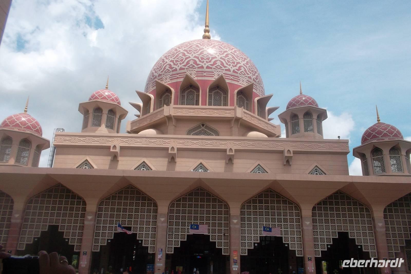 Unser erstes heutiges Ziel war die „Gartenstadt" Putrajaya. Der Ort, der als „Entlastung" des Ballungszentrums Kuala Lumpur in dessen Näher entsteht, ist der neue Regierungssitz Malaysias und beherbergt schon einen großen Teil der Ministerien. Malaysias Anspruch als aufstrebender Staat mit großer Wirtschaftskraft dokumentiert sich hier als ehrgeiziges Projekt mit inzwischen gigantischen Ausmaßen. Putrajaya wurde erst 1995 gegründet und um einen künstlichen See herum planmäßig angelegt - als neuer Regierungssitz unweit der überquellenden bisherigen Hauptstadt Kuala Lumpur. Mit bester Verkehrsanbindung pendeln hier zehntausende Regierungsangestellte täglich, denn noch besteht die supermoderne Stadt mit gigantischen Hochhäusern - denen trotz Riesenhaftigkeit aber traditionelle Bauformen - überwiegend aus Büro- und Verwaltungsgebäuden und ist seltsam unbelebt. Es ist eine Stadtlandschaft, bestimmt durch künstlich angelegte Seen und ausgedehnte Grünflächen, dominiert von Regierungs- und Wirtschaftsgebäuden, die versucht, die Gegensätze moderner und islamisch-malaysischer Architektur zu vereinen, der aber noch die Belebung fehlt - beispielsweise durch Restaurants, Cafés, Kinos etc. Wir besuchten hier zunächst das wichtigste religiöse Gebäude der Stadt: Malaysias neue Zentral- Moschee. Das bedeutsame, elegant-erhabene Gebäude liegt malerisch am Zentralsee. Die Putra Mosque bietet Platz für etwa 15.000 Gläubige und besitzt mit ihrem 116 Meter hohen Minarett das zweithöchste Südostasiens. In beeindruckend kurzer Bauzeit von nur zwei Jahren ab 1997 wurde die gewaltige und formschöne Moschee errichtet. Kurz vor dem Mittagsgebet konnten wir den Sakralbau besuchen, Damen und kurz behoste Männer mußten dabei in einen violetten Umhang schlüpfen. Nach Besuch des Gebetshauses fuhren wir mit dem Bus bergauf - vom beherrschend auf einem Hügel angelegten neuen, gewaltigen Konferenzzentrum hat man einen guten Blick über Putrajaya und die Regierungs- und Wirtschaftsgebäude wie den Komplex des Premierministers: die „Perdana Putra" mit den Arbeitsräumen des Staatschefs und die „Seri Perdana", seine Residenz.