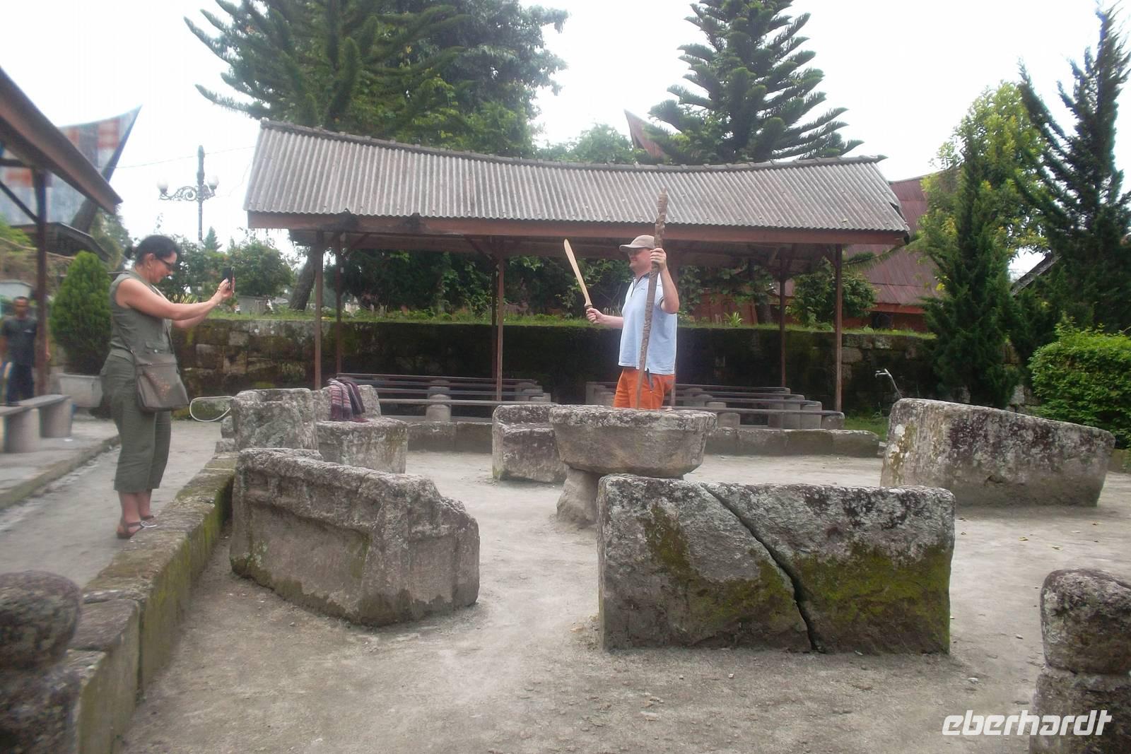 Dann gelangten wir per Boot in den im Kern noch komplett historisch erhaltenen Ort Ambarita. Sein original erhaltener Dorfkern repräsentiert aufs Beste ein typisches Batak-Toba-Dorf - mit bescheidenem Königspalast, umgeben von Häusern in traditioneller Bauweise auf Pfählen mit einem vorgelagerten Gerichts- und Ritualplatz der Batak mit steinernen Möbeln. Eine Umfassungsmauer schützt das Dorf - nur ein einziger, leicht zu verteidigender Durchschlupf führt hinein und ein anderer hinaus. Traditionell müssen diese Durchgänge genauso hoch sein, dass eine Frau mit Reissack auf dem Kopf ohne sich zu bücken hindurchgehen kann und so breit, das ein Wasserbüffel hindurchpasst. Alles hier atmet noch Tradition - sowohl der original erhaltenen Dorfplatz mit Versammlungs- und Gerichtsstätte als auch der hinter der Umfassungsmauer gelegene Richtplatzt für rituelle Hinrichtungen. Linda erläuterte ausführlich Sitten, Glauben und Rechtsgebaren der Batak Toba. Bei ihnen spielt - bis heute! - der Glaube und die Furch vor Magie eine Rolle und die alten Rituale von Rechtsfindung und Verurteilung dienen vor allem zum Erfassen und Beherrschen magischer Kräfte böser Menschen. Nach der Mittagspause besuchten wir ein weiteres traditionelles Dorf. Tomok verfügt über den größten und besterhaltenen Königsfriedhof der Insel. Hier gibt es traditionelle Steinsarkophage der alten Batask-Zeit neben schon christlichen Begräbnisstätten aus der Zeit nach der Christianisierung des Batak-Landes. Englische, holländische aber auch deutsche Missionare waren hier im 18. Und vor allem 19. Jahrhundert recht erfolgreich, so dass im eigentlich muslimischen Indonesien das Batak-Land eine überwiegend christlich geprägte Enklave bildet. In Tomok liegen die am meisten verehrten Könige der Batak-Toba begraben, die zunächst Vertreter der Naturreligion waren, später dann den christlichen Glauben annahmen. Für den Rückweg zum Boot konnten wir uns Zeit lassen - er verlief durch Gassen voller Souvenirverkäufer und hier konnten wir einige typische Mitbringsel aus dem Batak-Land erwerben - Schnitzereien, Medizinmann-Bücher, ewige Batak-Kalender aus Bambusstäbchen oder originale unterschiedlich große Zauberstäbe zur Ausübung weißer und schwarzer Magie. Am Nachmittag dann kehrten wir mit dem Boot in unser Hotel zurück.
