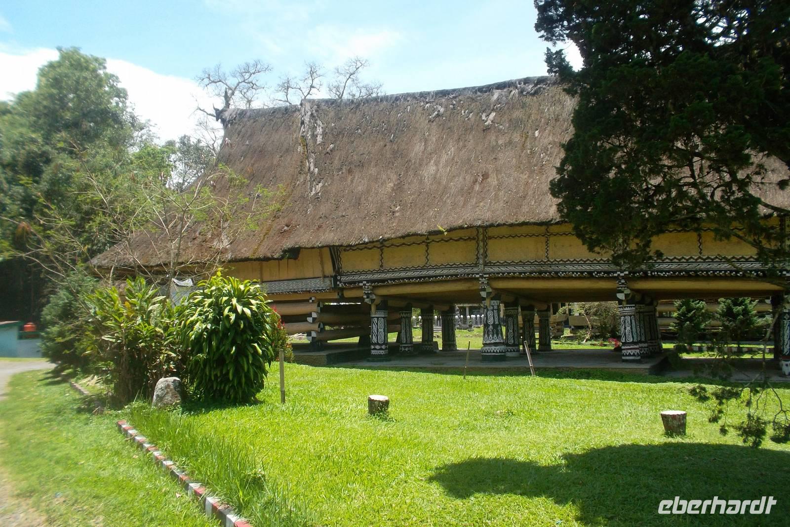 Eine Vertiefung der Eindrücke aus dem Batak-Karo Dorf gab es bereits beim nächsten Stopp: Wir besuchten einen ehemaligen Königssitz, ein Langhauses, das als Museum dient. Dieses „Rumah Bolong"-Langhaus war einst Sitz der letzten Simalungun-Könige der Batak-Karo, die nach Erringung der indonesischen Unabhängigkeit ihre Macht verloren. Wir hatten, nachdem wir einen schmalen Eingangstunnel passiert hatten, Gelegenheit, in dem interessanten Ensemble herumzustreifen. Es besteht aus dem alten „Schloss" - eben jenem auf dicken Pfählen stehenden reichverzierten hölzernen Langhaus - einem Wachhaus, mehreren Repräsentationsgebäuden und Speichern. Ein Grabmal für den letzten König, der in den Wirren der Unabhängigkeit umkam, hat man hier an historischem Ort neben seiner alten Residenz errichtet.
