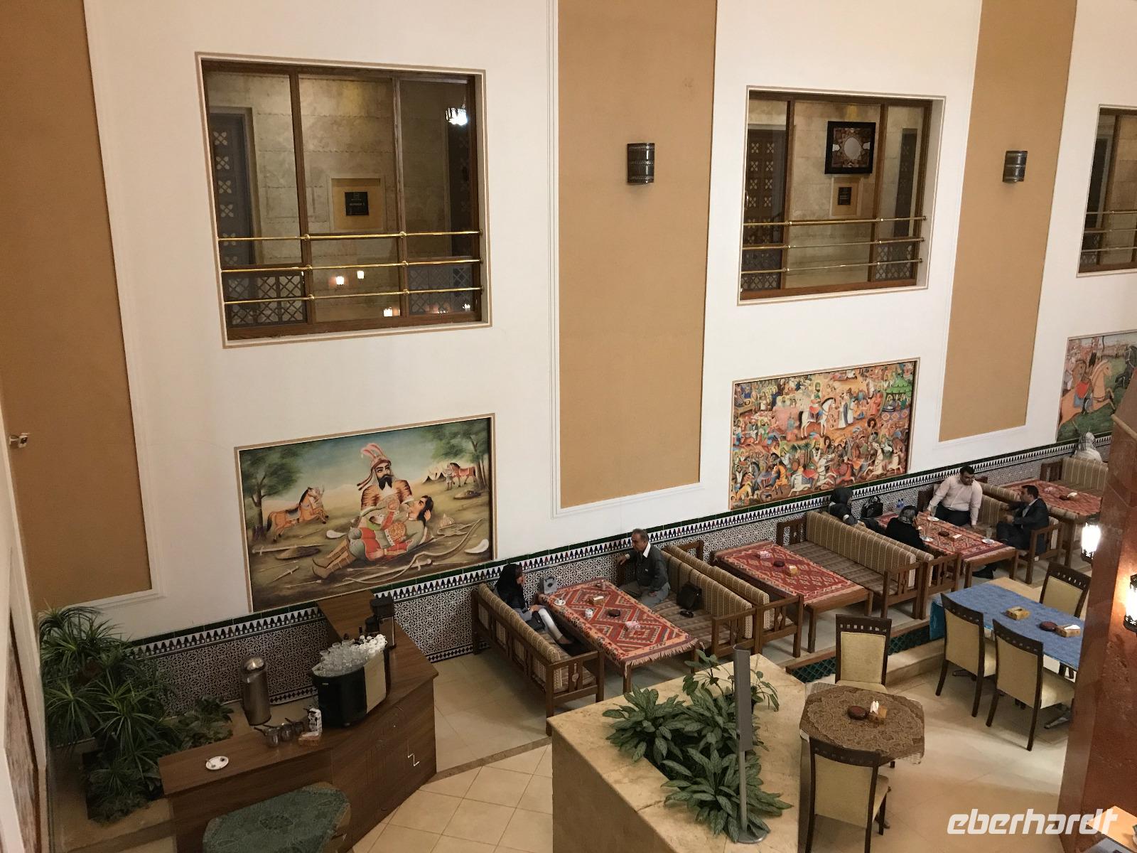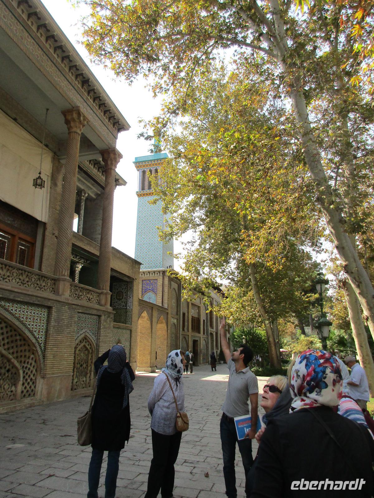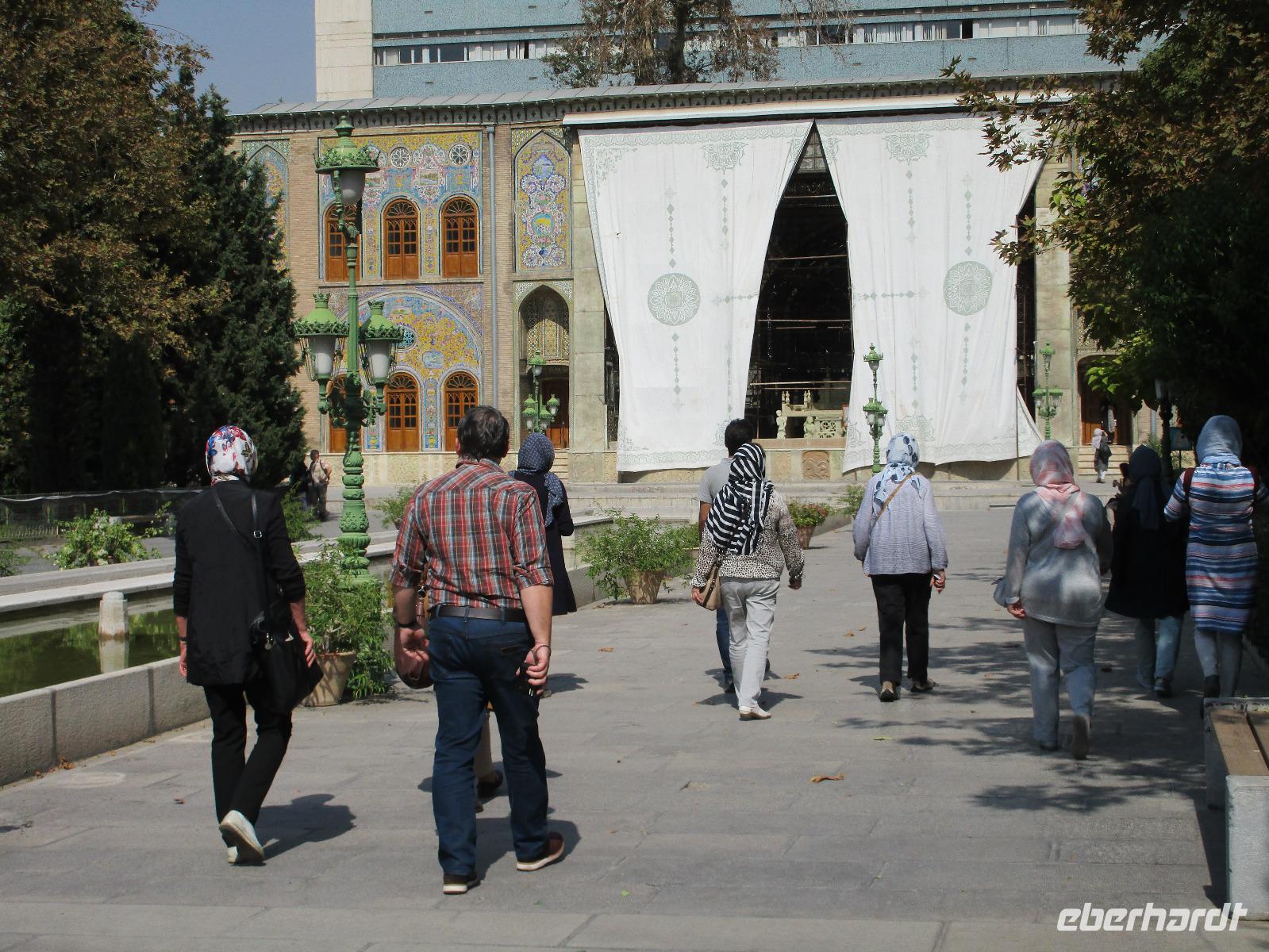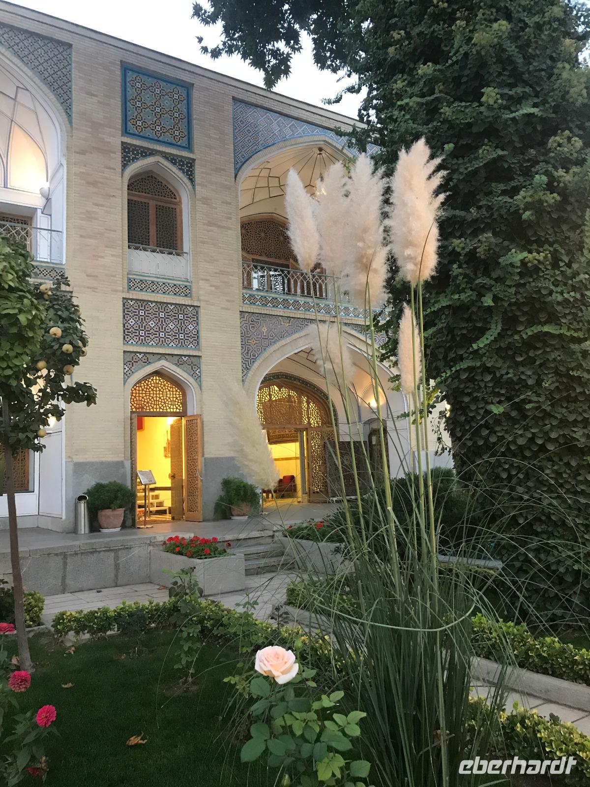 Unsere Anreise stand glücklicherweise unter einem „entspannten Stern". Schon in Leipzig kamen alle pünktlich und gut gelaunt an, der Check-In verlief reibungslos und die Brötchen vor der Sicherheitskontrolle schmeckten auch lecker. Der Abflug verzögerte sich um ein paar Minuten, aber wir landeten schon nach 2,5 Stunden Flugzeit und somit immer noch pünktlich. Auch das Weiterfluggate war schnell gefunden sowie die 3 Gäste, die aus München und Berlin nach Istanbul gereist waren. Wir bestiegen unser Flugzeug nach Teheran - der Flieger war fast ausgebucht - und nachdem wie auch schon auf dem ersten Flug nochmals eine warme Mahlzeit gereicht wurde, fielen bei einigen die Augen zu. Schließlich war es auch nach mitteleuropäischer Zeit schon mitten in der Nacht - nach Istanbul hatten wir die Uhren um eine Stunde nach vorn gestellt, nach Teheran eine weitere halbe Stunde. Die Einreise, also die Kontrolle der bereits in Deutschland durch Eberhardt TRAVEL besorgten Visa, erfolgte zügig und auch die Koffer waren schnell da. Wir begrüßten unseren Reiseleiter Mohammad und er orderte den Bus, sodass wir ca. 4.15 Uhr im Bus saßen und kurz nach 5 Uhr an unserem schönen Howeyzeh Hotel ankamen. Einige machten die Augen zu, aber bereits 7.30 Uhr erfolgte der Weckruf und man konnte sich am Frühstücksbuffet stärken. 9 Uhr fuhren wir dann Richtung Iranischem Nationalmuseum. Mohammad erklärte die Exponate sehr ausführlich und manch einem wurde etwas mulmig bei dem Gedanken, dass dies erst das erste von drei Museen heute sein wird. Zugegeben mit dem wenigen Schlaf und der Anreise noch in den Knochen waren es viele zu verarbeitende Informationen für den ersten Besichtigungstag, aber ich wüsste nicht, was wir hätten weg lassen sollen. Nach dem Nationalmuseum entschieden wir uns für den Besuch des Golestan Palastes. Ein beeindruckender Bau, mit wenig dekorativem Bürogebäude aus neuerer Zeit im Hintergrund. Der vorherige Fußweg vom Bus zum „Blumengarten", wie Golestan übersetzt heißt, verlangte uns auch einiges an Konzentration und Mut ab - der Straßenverkehr, der sich teilweise auch auf den Fußweg ausweitet, ist doch manchmal etwas beängstigend. Wie sagte der örtliche Reiseleiter zu mir: „Wenn du wie in Deutschland über die Straße gehen willst, wirst du sie NIE überqueren.". Nach den Besichtigungen im und am prächtigen Golestan Palast legten wir dort unsere Mittagspause ein - es gab riesige Portionen Salat oder Eis oder leckere Kuchen, aber vor allem wach machenden Kaffee ;-). Im Anschluss ging es per Bus weiter zur Nationalbank und nach mehreren Kontrollen und Wartezeiten in das sogenannte Juwelenmuseum. Ein unfassbarer Schatz an filigran gearbeiteten, fantasievollen Edelsteinen von teils unfassbarer Größe. Die Ausstellung selbst hat uns fasziniert und mit ihrem Ausmaß fast überfordert. Auch die Geräuschkulisse machte es uns ein wenig schwer. Dennoch wird keiner aus der Gruppe diesen Programmpunkt vermissen wollen. Auf dem Weg ins Hotel wechselte ich schnell noch für alle Euro in Landeswährung und machte sie somit mit 50 € Einsatz glatt zu Millionären. Das Abendessen nahmen wir in einem Restaurant ein, das wir vom Hotel zu Fuß erreichten. Es gab verschiedene Suppen zur Wahl, wir wissen bis heute nicht was alles in der Überraschungssuppe enthalten war, aber sie schmeckte ;-). Als Hauptgang wurden Lamm und Huhn Kebab sowie gebratener Fisch mit Reis und Fladenbrot serviert und der Nachtisch fehlte natürlich auch nicht. Ziemlich müde, aber gespannt auf die nächsten Tage fielen wir in unsere bequemen Betten.