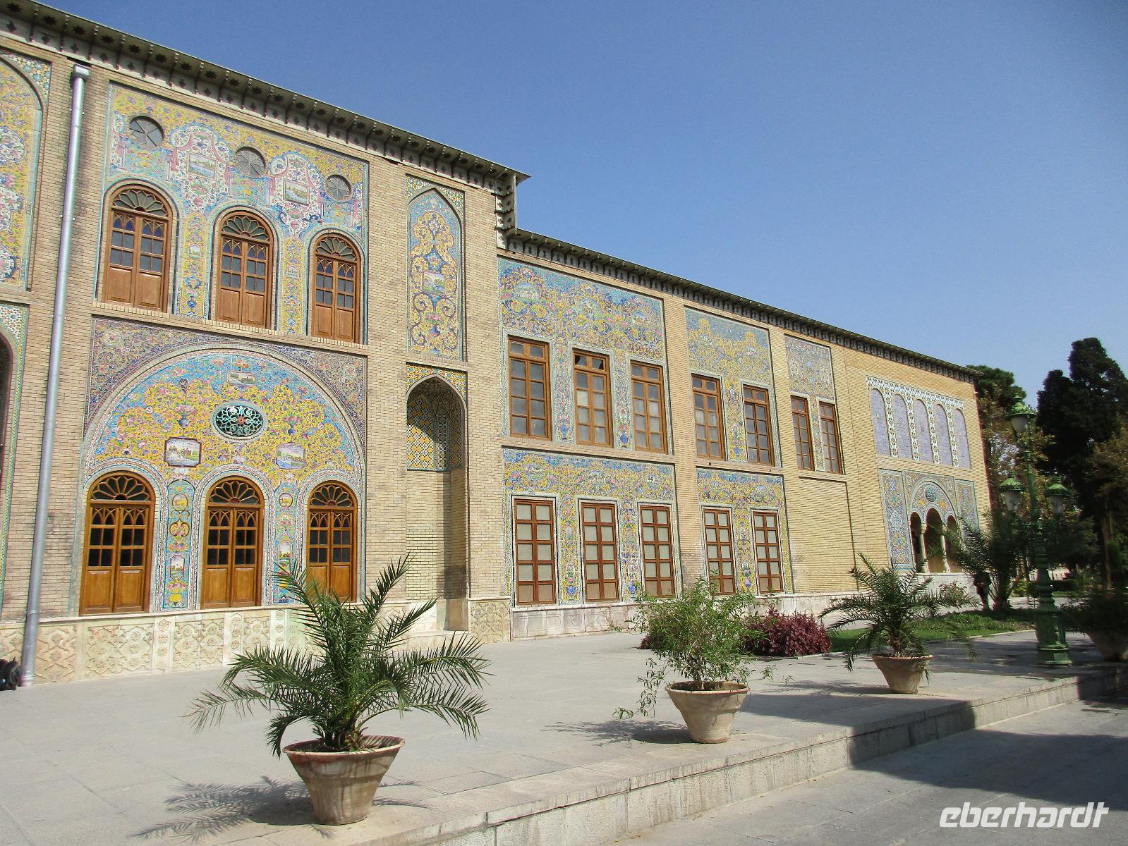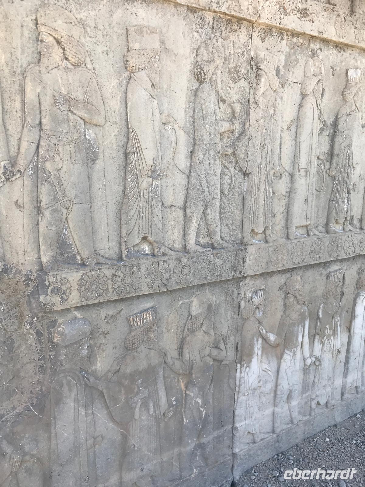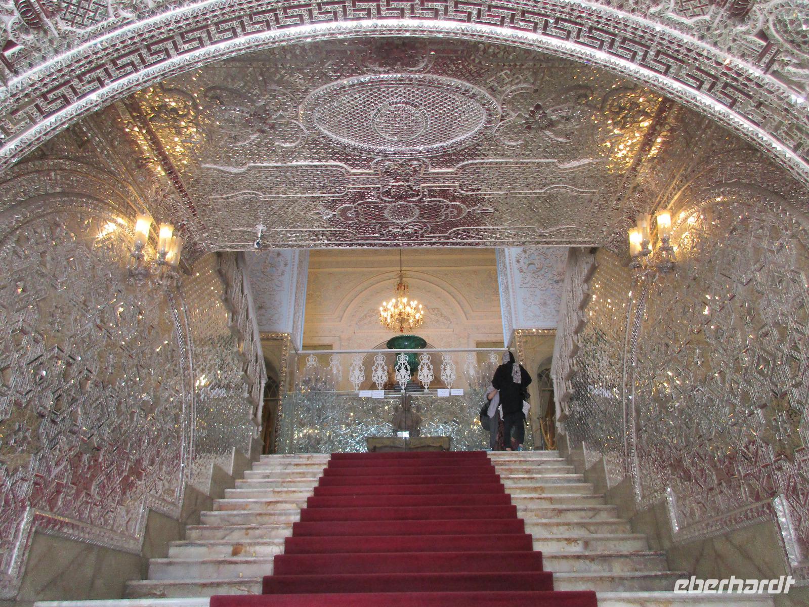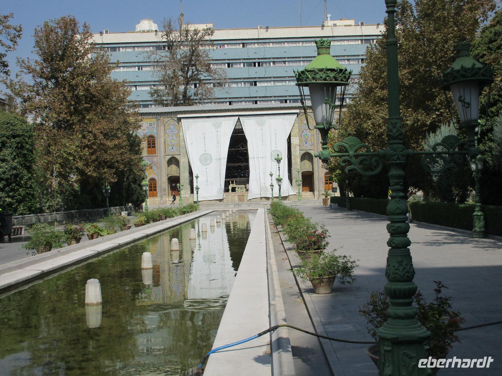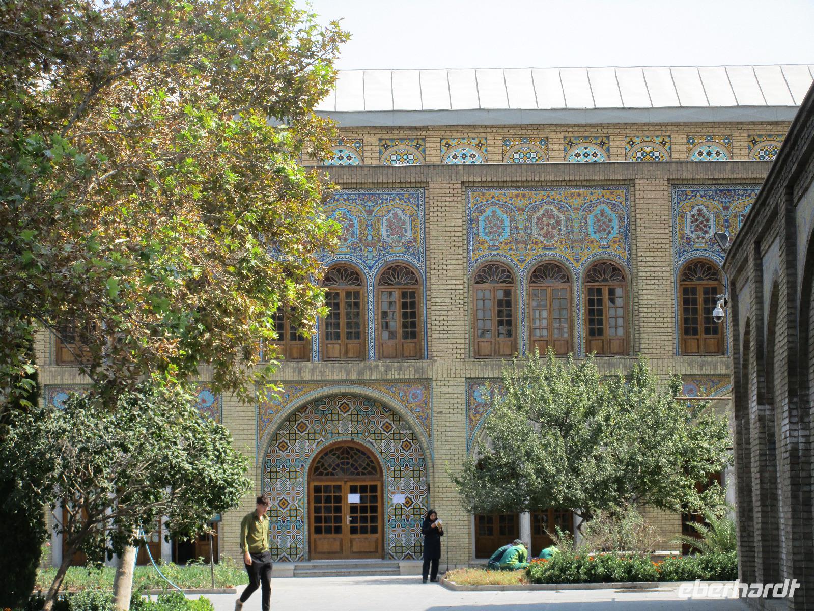 Unsere Anreise stand glücklicherweise unter einem „entspannten Stern". Schon in Leipzig kamen alle pünktlich und gut gelaunt an, der Check-In verlief reibungslos und die Brötchen vor der Sicherheitskontrolle schmeckten auch lecker. Der Abflug verzögerte sich um ein paar Minuten, aber wir landeten schon nach 2,5 Stunden Flugzeit und somit immer noch pünktlich. Auch das Weiterfluggate war schnell gefunden sowie die 3 Gäste, die aus München und Berlin nach Istanbul gereist waren. Wir bestiegen unser Flugzeug nach Teheran - der Flieger war fast ausgebucht - und nachdem wie auch schon auf dem ersten Flug nochmals eine warme Mahlzeit gereicht wurde, fielen bei einigen die Augen zu. Schließlich war es auch nach mitteleuropäischer Zeit schon mitten in der Nacht - nach Istanbul hatten wir die Uhren um eine Stunde nach vorn gestellt, nach Teheran eine weitere halbe Stunde. Die Einreise, also die Kontrolle der bereits in Deutschland durch Eberhardt TRAVEL besorgten Visa, erfolgte zügig und auch die Koffer waren schnell da. Wir begrüßten unseren Reiseleiter Mohammad und er orderte den Bus, sodass wir ca. 4.15 Uhr im Bus saßen und kurz nach 5 Uhr an unserem schönen Howeyzeh Hotel ankamen. Einige machten die Augen zu, aber bereits 7.30 Uhr erfolgte der Weckruf und man konnte sich am Frühstücksbuffet stärken. 9 Uhr fuhren wir dann Richtung Iranischem Nationalmuseum. Mohammad erklärte die Exponate sehr ausführlich und manch einem wurde etwas mulmig bei dem Gedanken, dass dies erst das erste von drei Museen heute sein wird. Zugegeben mit dem wenigen Schlaf und der Anreise noch in den Knochen waren es viele zu verarbeitende Informationen für den ersten Besichtigungstag, aber ich wüsste nicht, was wir hätten weg lassen sollen. Nach dem Nationalmuseum entschieden wir uns für den Besuch des Golestan Palastes. Ein beeindruckender Bau, mit wenig dekorativem Bürogebäude aus neuerer Zeit im Hintergrund. Der vorherige Fußweg vom Bus zum „Blumengarten", wie Golestan übersetzt heißt, verlangte uns auch einiges an Konzentration und Mut ab - der Straßenverkehr, der sich teilweise auch auf den Fußweg ausweitet, ist doch manchmal etwas beängstigend. Wie sagte der örtliche Reiseleiter zu mir: „Wenn du wie in Deutschland über die Straße gehen willst, wirst du sie NIE überqueren.". Nach den Besichtigungen im und am prächtigen Golestan Palast legten wir dort unsere Mittagspause ein - es gab riesige Portionen Salat oder Eis oder leckere Kuchen, aber vor allem wach machenden Kaffee ;-). Im Anschluss ging es per Bus weiter zur Nationalbank und nach mehreren Kontrollen und Wartezeiten in das sogenannte Juwelenmuseum. Ein unfassbarer Schatz an filigran gearbeiteten, fantasievollen Edelsteinen von teils unfassbarer Größe. Die Ausstellung selbst hat uns fasziniert und mit ihrem Ausmaß fast überfordert. Auch die Geräuschkulisse machte es uns ein wenig schwer. Dennoch wird keiner aus der Gruppe diesen Programmpunkt vermissen wollen. Auf dem Weg ins Hotel wechselte ich schnell noch für alle Euro in Landeswährung und machte sie somit mit 50 € Einsatz glatt zu Millionären. Das Abendessen nahmen wir in einem Restaurant ein, das wir vom Hotel zu Fuß erreichten. Es gab verschiedene Suppen zur Wahl, wir wissen bis heute nicht was alles in der Überraschungssuppe enthalten war, aber sie schmeckte ;-). Als Hauptgang wurden Lamm und Huhn Kebab sowie gebratener Fisch mit Reis und Fladenbrot serviert und der Nachtisch fehlte natürlich auch nicht. Ziemlich müde, aber gespannt auf die nächsten Tage fielen wir in unsere bequemen Betten.