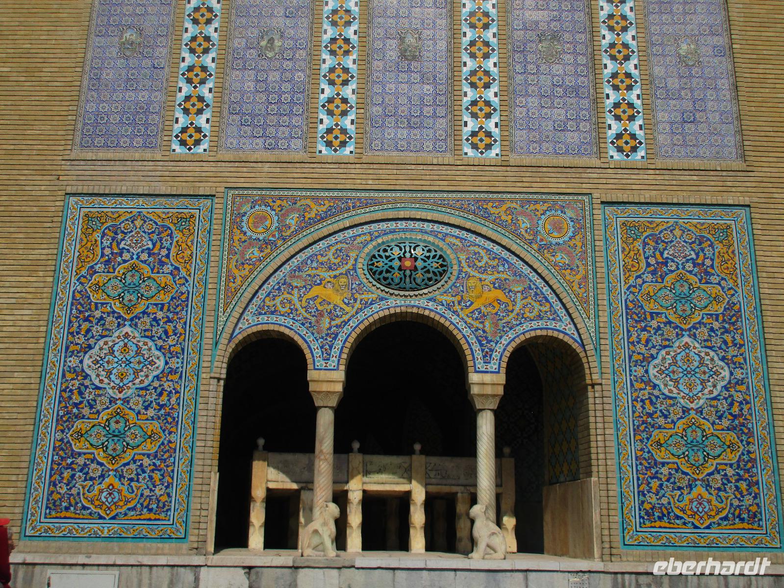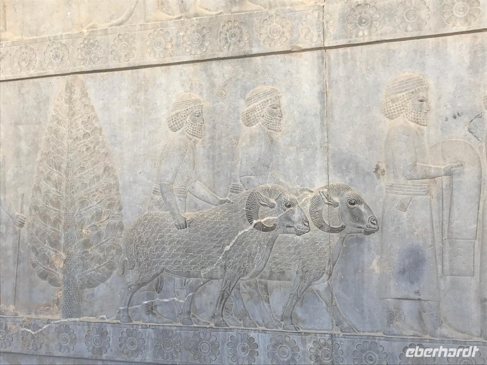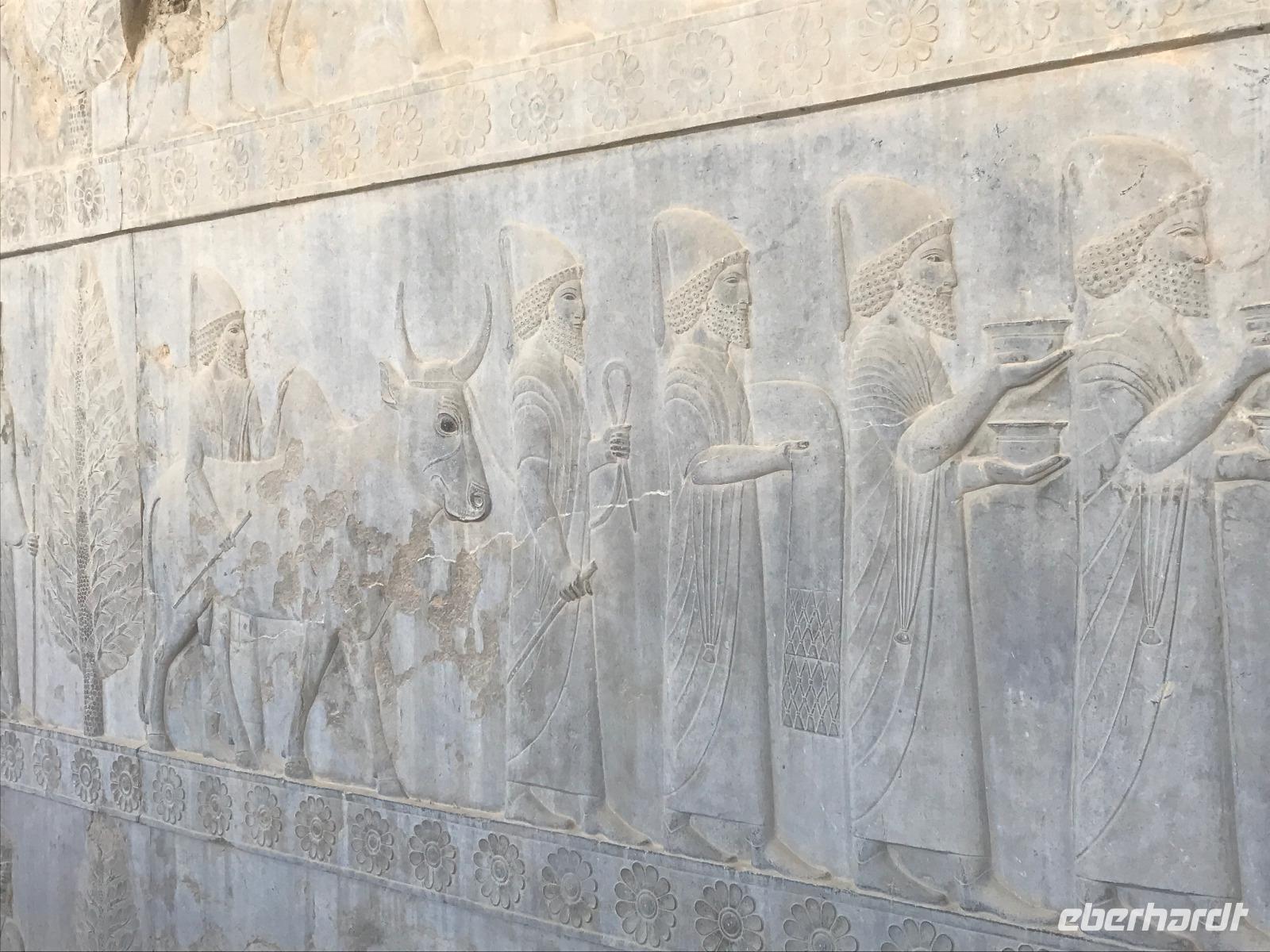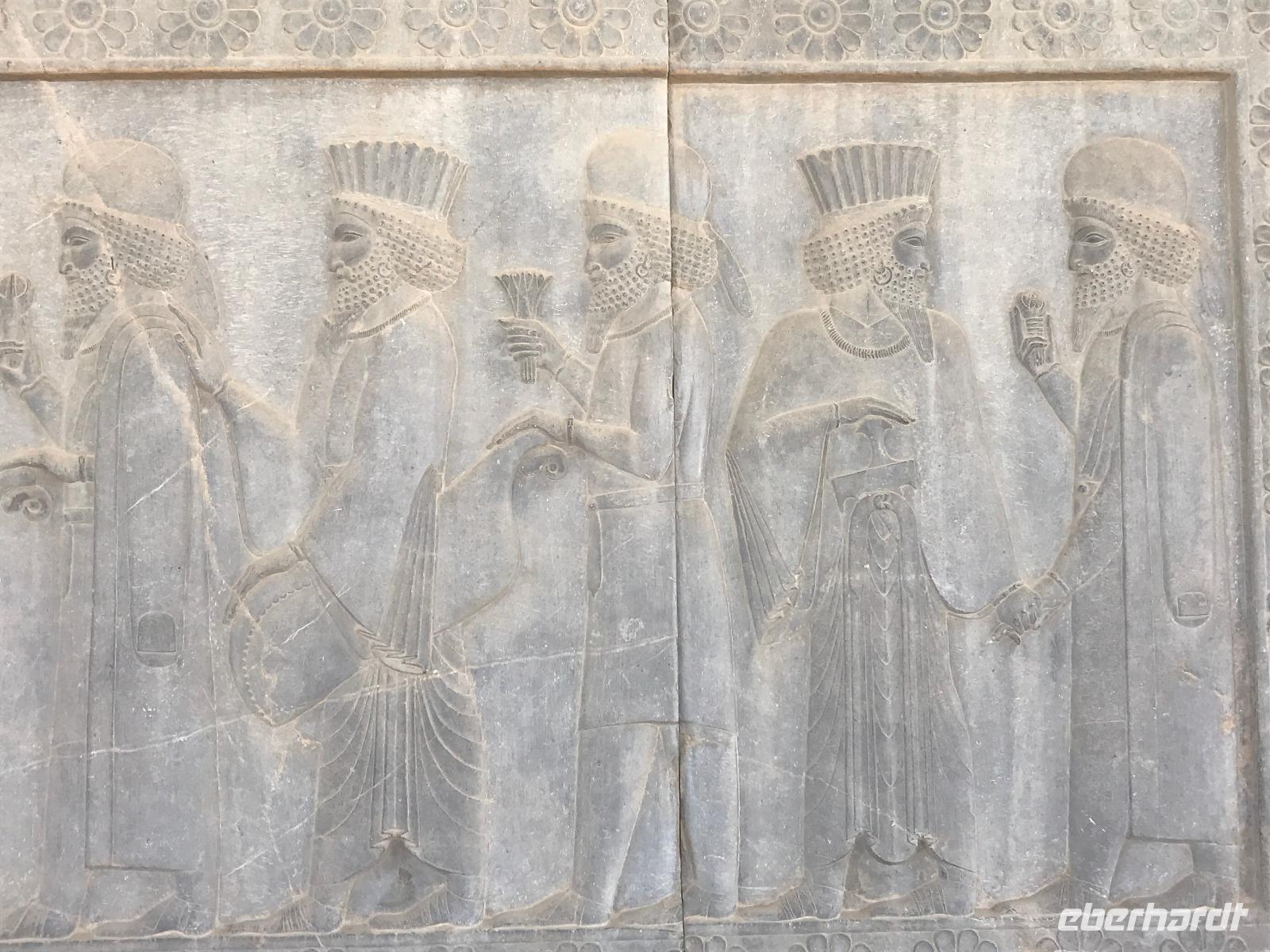 Unsere Anreise stand glücklicherweise unter einem „entspannten Stern". Schon in Leipzig kamen alle pünktlich und gut gelaunt an, der Check-In verlief reibungslos und die Brötchen vor der Sicherheitskontrolle schmeckten auch lecker. Der Abflug verzögerte sich um ein paar Minuten, aber wir landeten schon nach 2,5 Stunden Flugzeit und somit immer noch pünktlich. Auch das Weiterfluggate war schnell gefunden sowie die 3 Gäste, die aus München und Berlin nach Istanbul gereist waren. Wir bestiegen unser Flugzeug nach Teheran - der Flieger war fast ausgebucht - und nachdem wie auch schon auf dem ersten Flug nochmals eine warme Mahlzeit gereicht wurde, fielen bei einigen die Augen zu. Schließlich war es auch nach mitteleuropäischer Zeit schon mitten in der Nacht - nach Istanbul hatten wir die Uhren um eine Stunde nach vorn gestellt, nach Teheran eine weitere halbe Stunde. Die Einreise, also die Kontrolle der bereits in Deutschland durch Eberhardt TRAVEL besorgten Visa, erfolgte zügig und auch die Koffer waren schnell da. Wir begrüßten unseren Reiseleiter Mohammad und er orderte den Bus, sodass wir ca. 4.15 Uhr im Bus saßen und kurz nach 5 Uhr an unserem schönen Howeyzeh Hotel ankamen. Einige machten die Augen zu, aber bereits 7.30 Uhr erfolgte der Weckruf und man konnte sich am Frühstücksbuffet stärken. 9 Uhr fuhren wir dann Richtung Iranischem Nationalmuseum. Mohammad erklärte die Exponate sehr ausführlich und manch einem wurde etwas mulmig bei dem Gedanken, dass dies erst das erste von drei Museen heute sein wird. Zugegeben mit dem wenigen Schlaf und der Anreise noch in den Knochen waren es viele zu verarbeitende Informationen für den ersten Besichtigungstag, aber ich wüsste nicht, was wir hätten weg lassen sollen. Nach dem Nationalmuseum entschieden wir uns für den Besuch des Golestan Palastes. Ein beeindruckender Bau, mit wenig dekorativem Bürogebäude aus neuerer Zeit im Hintergrund. Der vorherige Fußweg vom Bus zum „Blumengarten", wie Golestan übersetzt heißt, verlangte uns auch einiges an Konzentration und Mut ab - der Straßenverkehr, der sich teilweise auch auf den Fußweg ausweitet, ist doch manchmal etwas beängstigend. Wie sagte der örtliche Reiseleiter zu mir: „Wenn du wie in Deutschland über die Straße gehen willst, wirst du sie NIE überqueren.". Nach den Besichtigungen im und am prächtigen Golestan Palast legten wir dort unsere Mittagspause ein - es gab riesige Portionen Salat oder Eis oder leckere Kuchen, aber vor allem wach machenden Kaffee ;-). Im Anschluss ging es per Bus weiter zur Nationalbank und nach mehreren Kontrollen und Wartezeiten in das sogenannte Juwelenmuseum. Ein unfassbarer Schatz an filigran gearbeiteten, fantasievollen Edelsteinen von teils unfassbarer Größe. Die Ausstellung selbst hat uns fasziniert und mit ihrem Ausmaß fast überfordert. Auch die Geräuschkulisse machte es uns ein wenig schwer. Dennoch wird keiner aus der Gruppe diesen Programmpunkt vermissen wollen. Auf dem Weg ins Hotel wechselte ich schnell noch für alle Euro in Landeswährung und machte sie somit mit 50 € Einsatz glatt zu Millionären. Das Abendessen nahmen wir in einem Restaurant ein, das wir vom Hotel zu Fuß erreichten. Es gab verschiedene Suppen zur Wahl, wir wissen bis heute nicht was alles in der Überraschungssuppe enthalten war, aber sie schmeckte ;-). Als Hauptgang wurden Lamm und Huhn Kebab sowie gebratener Fisch mit Reis und Fladenbrot serviert und der Nachtisch fehlte natürlich auch nicht. Ziemlich müde, aber gespannt auf die nächsten Tage fielen wir in unsere bequemen Betten.
