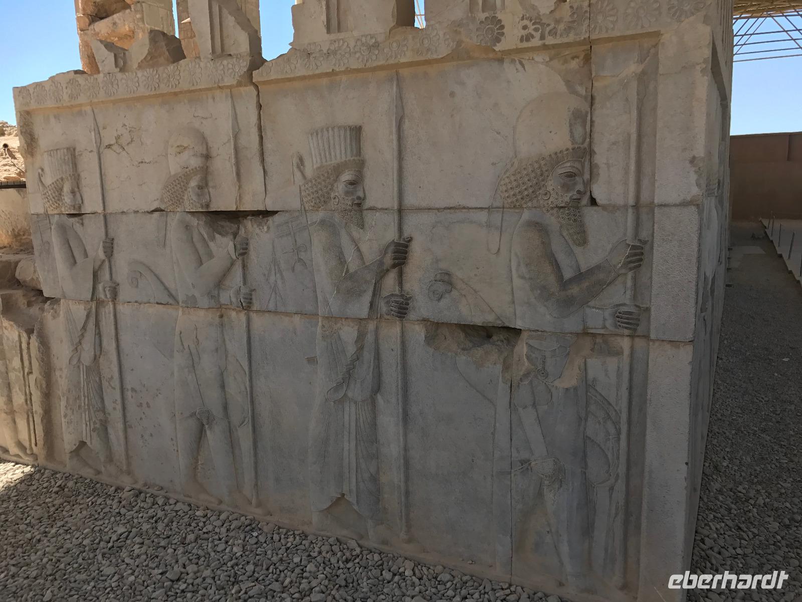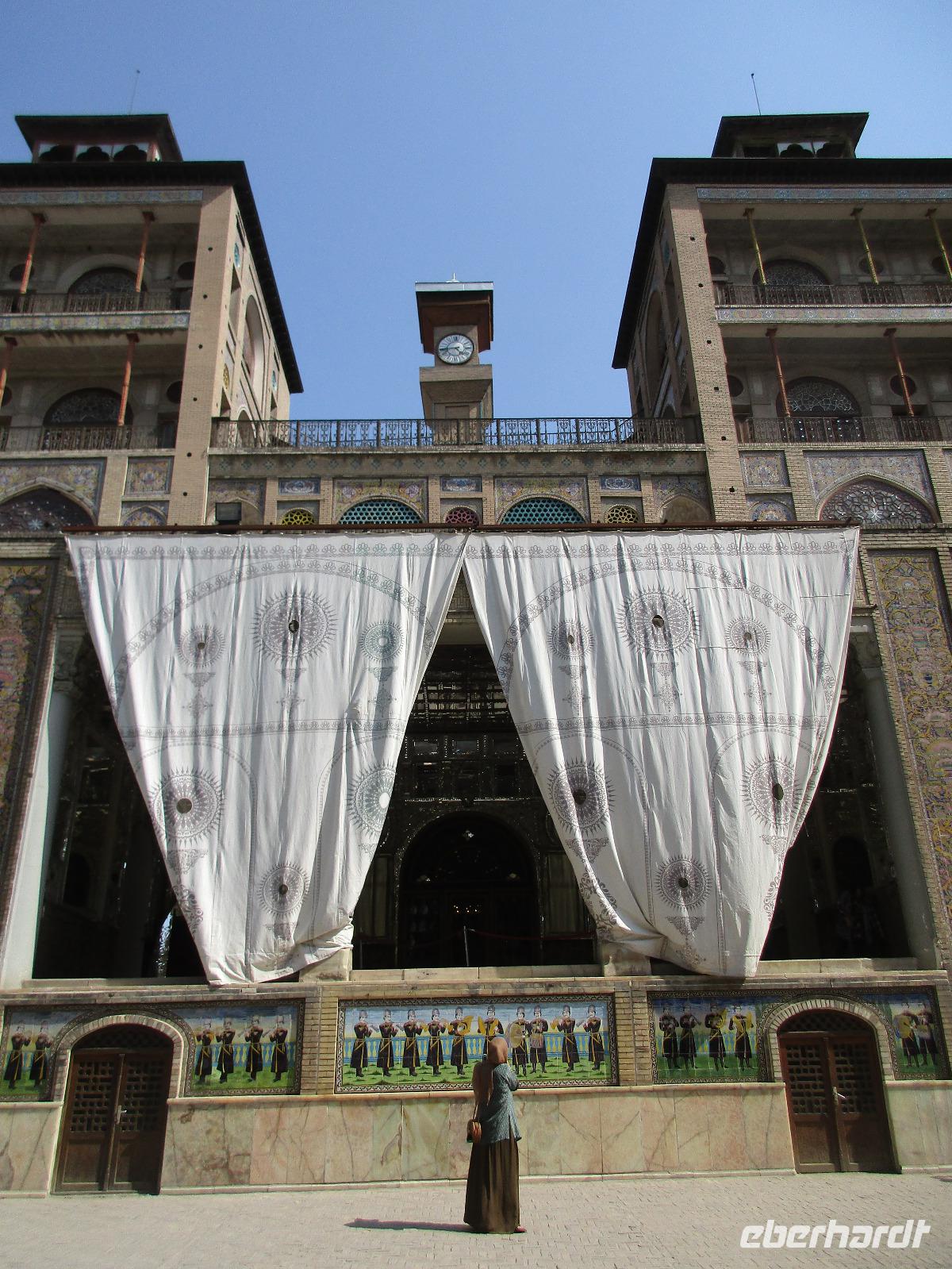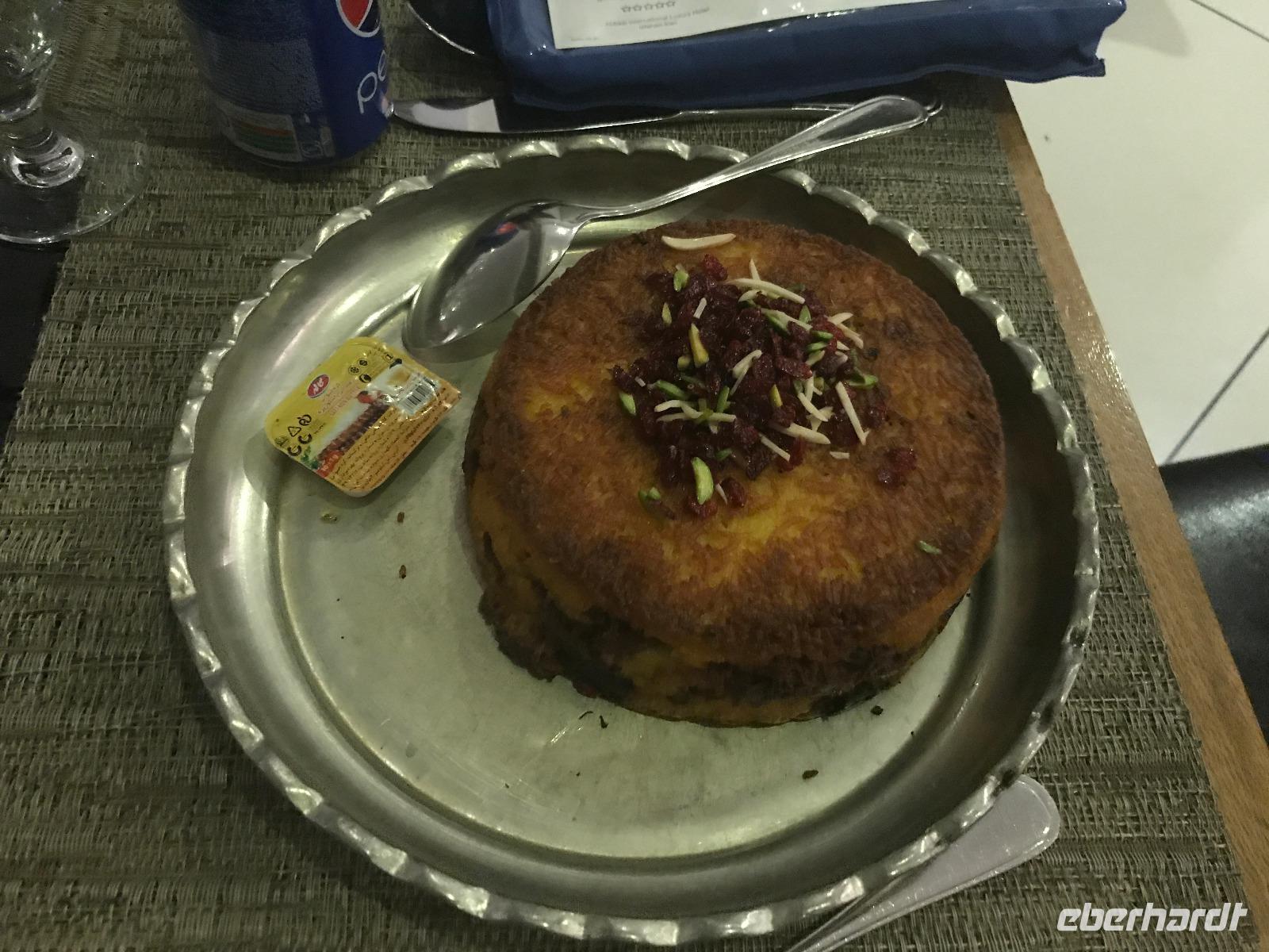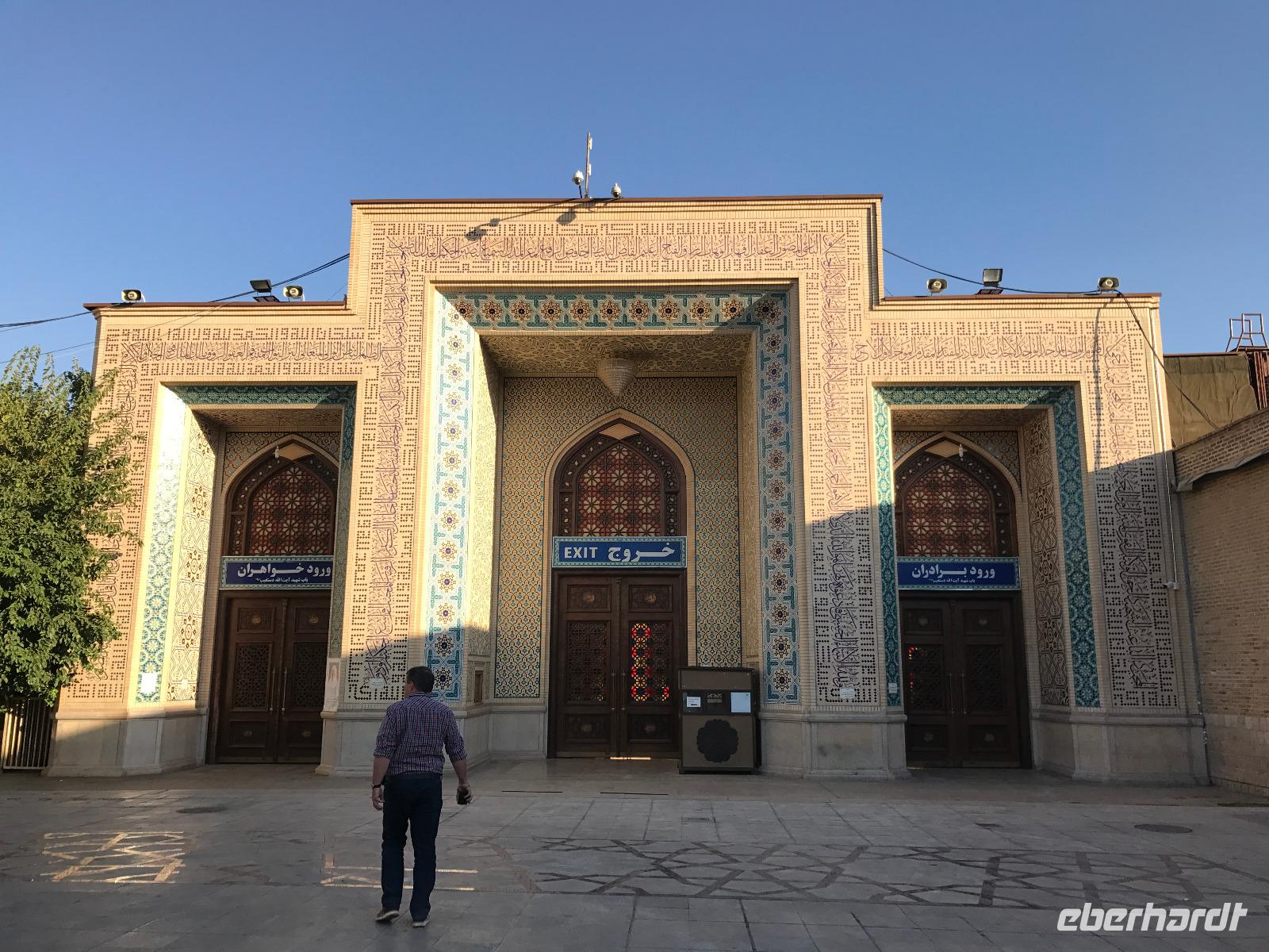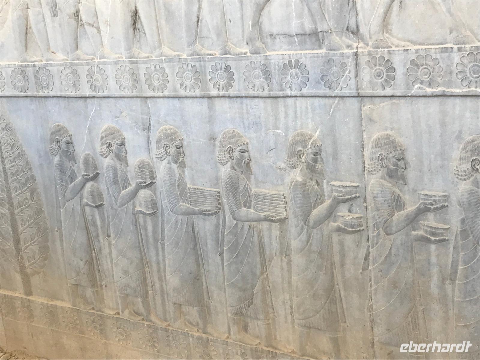 Unsere Anreise stand glücklicherweise unter einem „entspannten Stern". Schon in Leipzig kamen alle pünktlich und gut gelaunt an, der Check-In verlief reibungslos und die Brötchen vor der Sicherheitskontrolle schmeckten auch lecker. Der Abflug verzögerte sich um ein paar Minuten, aber wir landeten schon nach 2,5 Stunden Flugzeit und somit immer noch pünktlich. Auch das Weiterfluggate war schnell gefunden sowie die 3 Gäste, die aus München und Berlin nach Istanbul gereist waren. Wir bestiegen unser Flugzeug nach Teheran - der Flieger war fast ausgebucht - und nachdem wie auch schon auf dem ersten Flug nochmals eine warme Mahlzeit gereicht wurde, fielen bei einigen die Augen zu. Schließlich war es auch nach mitteleuropäischer Zeit schon mitten in der Nacht - nach Istanbul hatten wir die Uhren um eine Stunde nach vorn gestellt, nach Teheran eine weitere halbe Stunde. Die Einreise, also die Kontrolle der bereits in Deutschland durch Eberhardt TRAVEL besorgten Visa, erfolgte zügig und auch die Koffer waren schnell da. Wir begrüßten unseren Reiseleiter Mohammad und er orderte den Bus, sodass wir ca. 4.15 Uhr im Bus saßen und kurz nach 5 Uhr an unserem schönen Howeyzeh Hotel ankamen. Einige machten die Augen zu, aber bereits 7.30 Uhr erfolgte der Weckruf und man konnte sich am Frühstücksbuffet stärken. 9 Uhr fuhren wir dann Richtung Iranischem Nationalmuseum. Mohammad erklärte die Exponate sehr ausführlich und manch einem wurde etwas mulmig bei dem Gedanken, dass dies erst das erste von drei Museen heute sein wird. Zugegeben mit dem wenigen Schlaf und der Anreise noch in den Knochen waren es viele zu verarbeitende Informationen für den ersten Besichtigungstag, aber ich wüsste nicht, was wir hätten weg lassen sollen. Nach dem Nationalmuseum entschieden wir uns für den Besuch des Golestan Palastes. Ein beeindruckender Bau, mit wenig dekorativem Bürogebäude aus neuerer Zeit im Hintergrund. Der vorherige Fußweg vom Bus zum „Blumengarten", wie Golestan übersetzt heißt, verlangte uns auch einiges an Konzentration und Mut ab - der Straßenverkehr, der sich teilweise auch auf den Fußweg ausweitet, ist doch manchmal etwas beängstigend. Wie sagte der örtliche Reiseleiter zu mir: „Wenn du wie in Deutschland über die Straße gehen willst, wirst du sie NIE überqueren.". Nach den Besichtigungen im und am prächtigen Golestan Palast legten wir dort unsere Mittagspause ein - es gab riesige Portionen Salat oder Eis oder leckere Kuchen, aber vor allem wach machenden Kaffee ;-). Im Anschluss ging es per Bus weiter zur Nationalbank und nach mehreren Kontrollen und Wartezeiten in das sogenannte Juwelenmuseum. Ein unfassbarer Schatz an filigran gearbeiteten, fantasievollen Edelsteinen von teils unfassbarer Größe. Die Ausstellung selbst hat uns fasziniert und mit ihrem Ausmaß fast überfordert. Auch die Geräuschkulisse machte es uns ein wenig schwer. Dennoch wird keiner aus der Gruppe diesen Programmpunkt vermissen wollen. Auf dem Weg ins Hotel wechselte ich schnell noch für alle Euro in Landeswährung und machte sie somit mit 50 € Einsatz glatt zu Millionären. Das Abendessen nahmen wir in einem Restaurant ein, das wir vom Hotel zu Fuß erreichten. Es gab verschiedene Suppen zur Wahl, wir wissen bis heute nicht was alles in der Überraschungssuppe enthalten war, aber sie schmeckte ;-). Als Hauptgang wurden Lamm und Huhn Kebab sowie gebratener Fisch mit Reis und Fladenbrot serviert und der Nachtisch fehlte natürlich auch nicht. Ziemlich müde, aber gespannt auf die nächsten Tage fielen wir in unsere bequemen Betten.